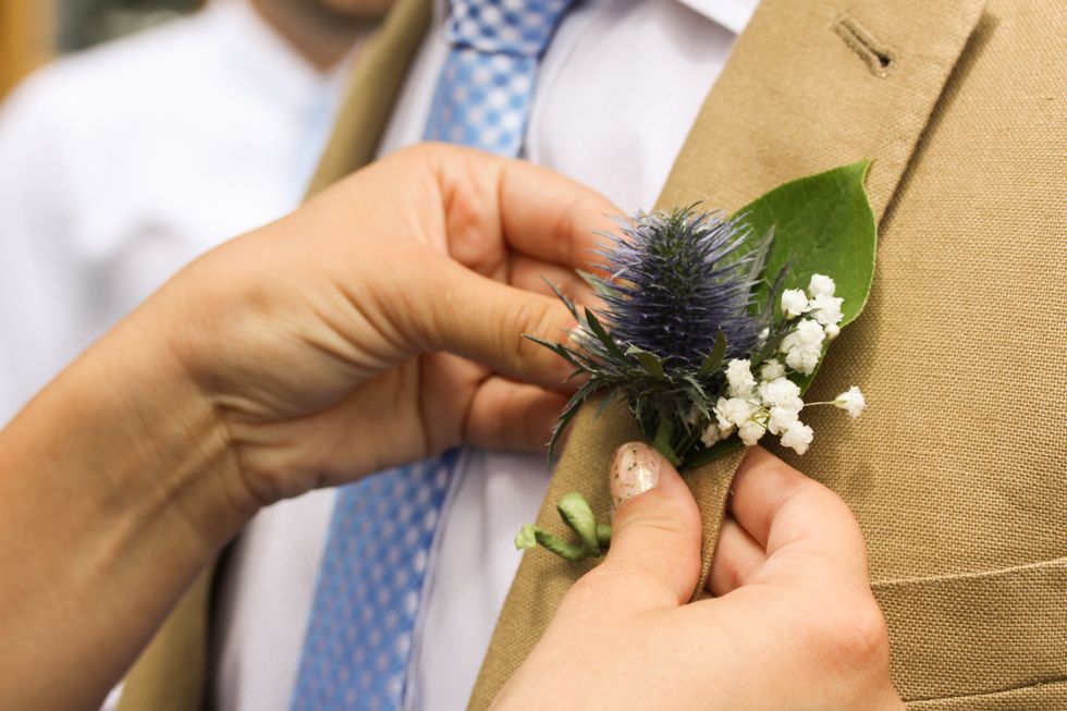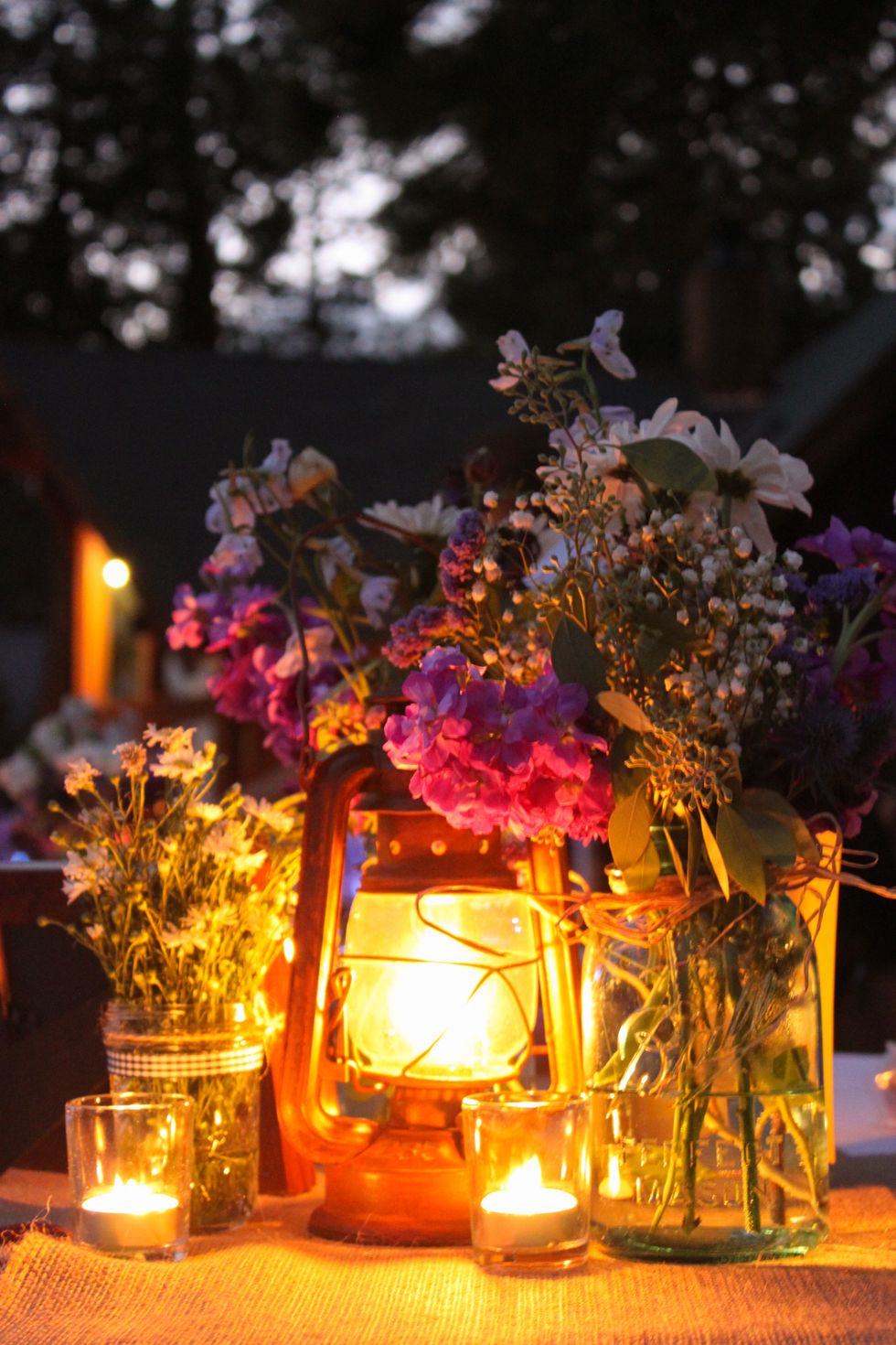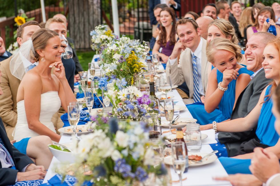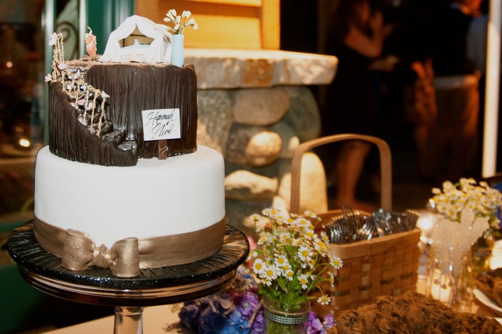 Because Nick and Hannah both love backpacking, and Hannah loves glitter and sparkle, this couple decided that "glamping" would set the tone of their August wedding. From the miniature tent that topped the cake to the gold glitter washi tape that secured the trail mix, they tried to implement equal parts glamour and camping into the theme.