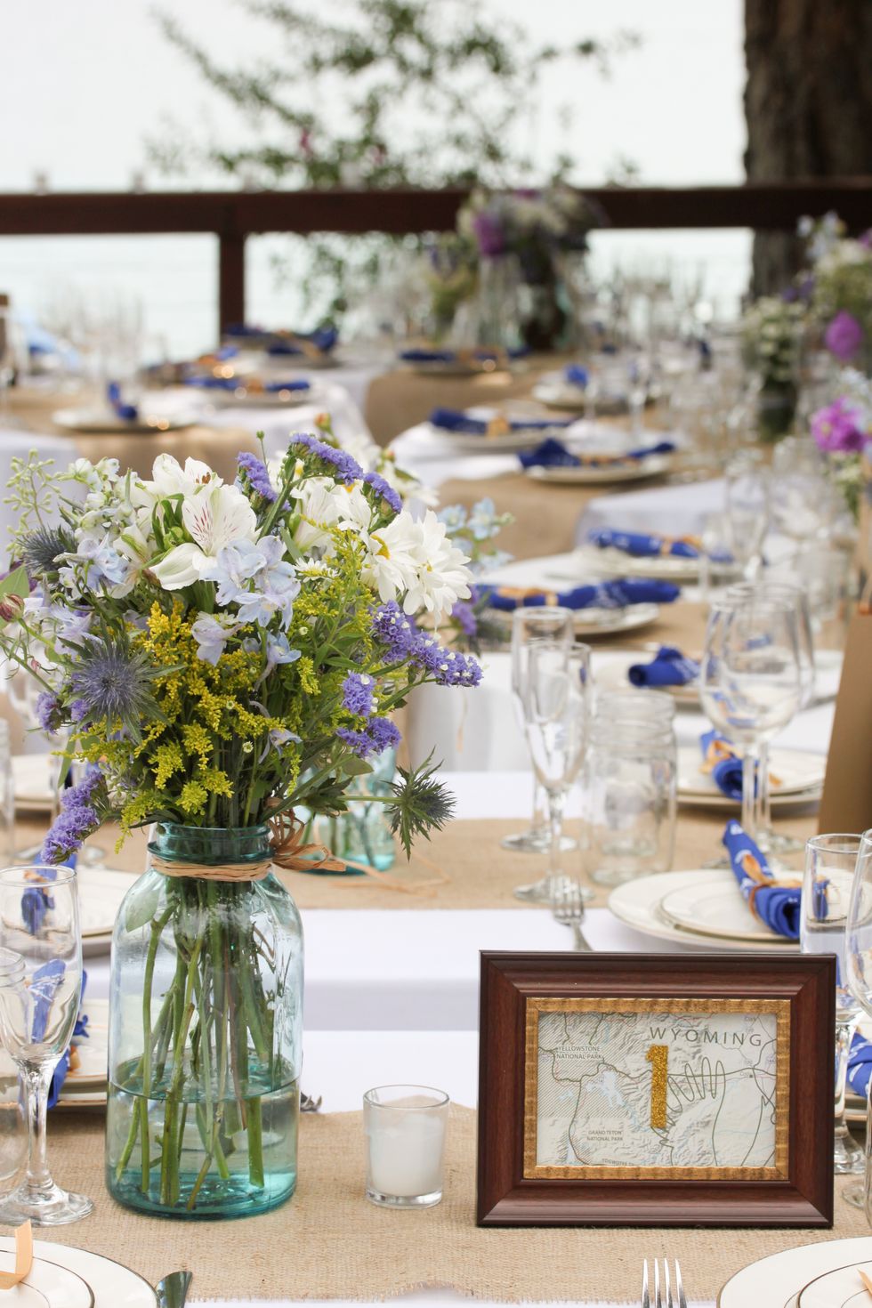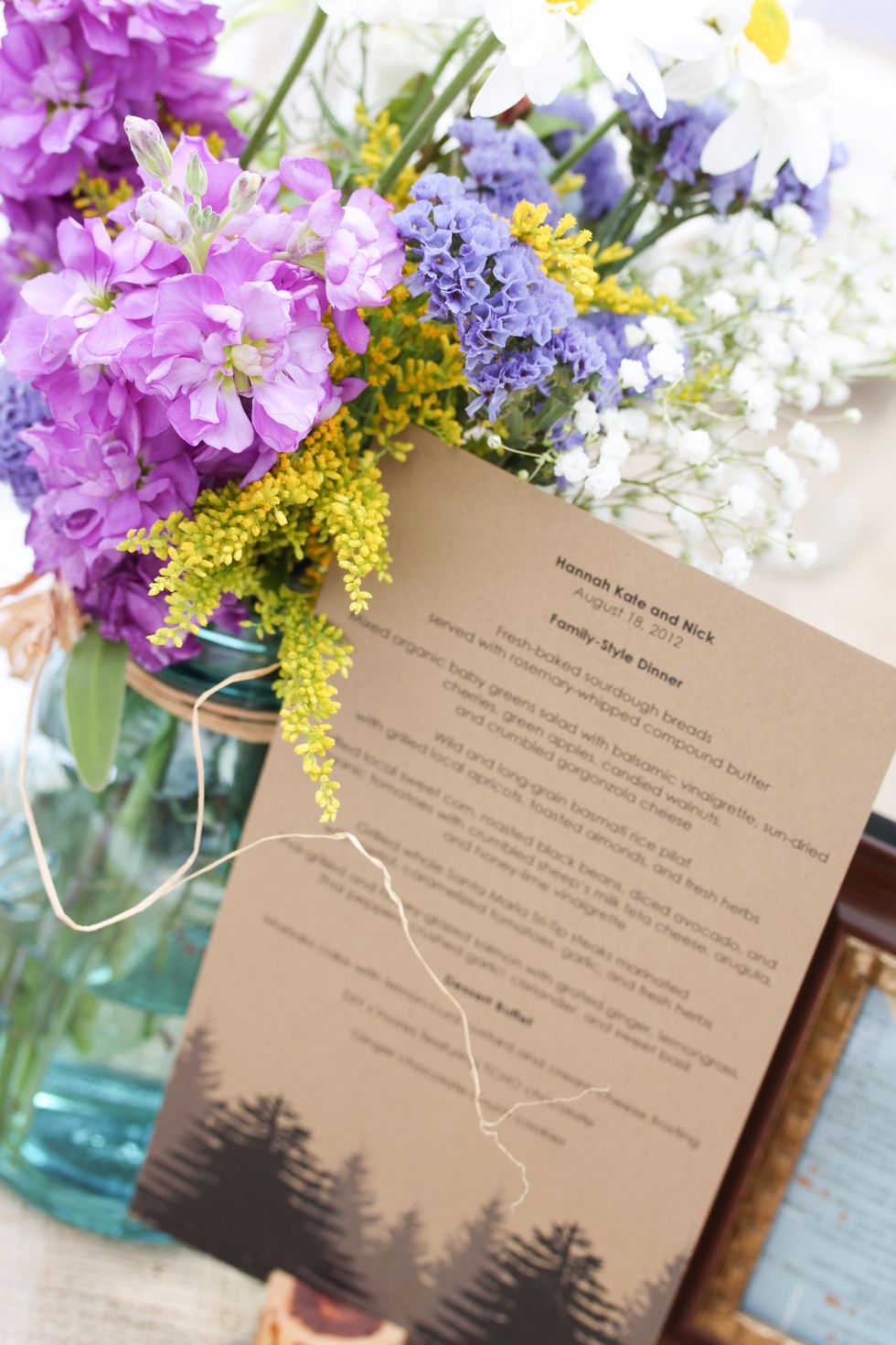Planning the wedding was an exercise in Google documentation and the involvement of family and friends, since Nick and Hannah were living 500 miles apart during the entire process: He here in the city and Hannah in San Diego, with Nick's parents and now sister-in-law. The flowers were done perfectly by the couple's friend Pat Hayes, and mutual friend Owen Cunningham and an iPad officiated the ceremony. Hannah's parents tracked down and transported vintage blue and clear Mason jars from Portland and made the runners for the tables.