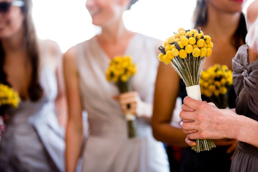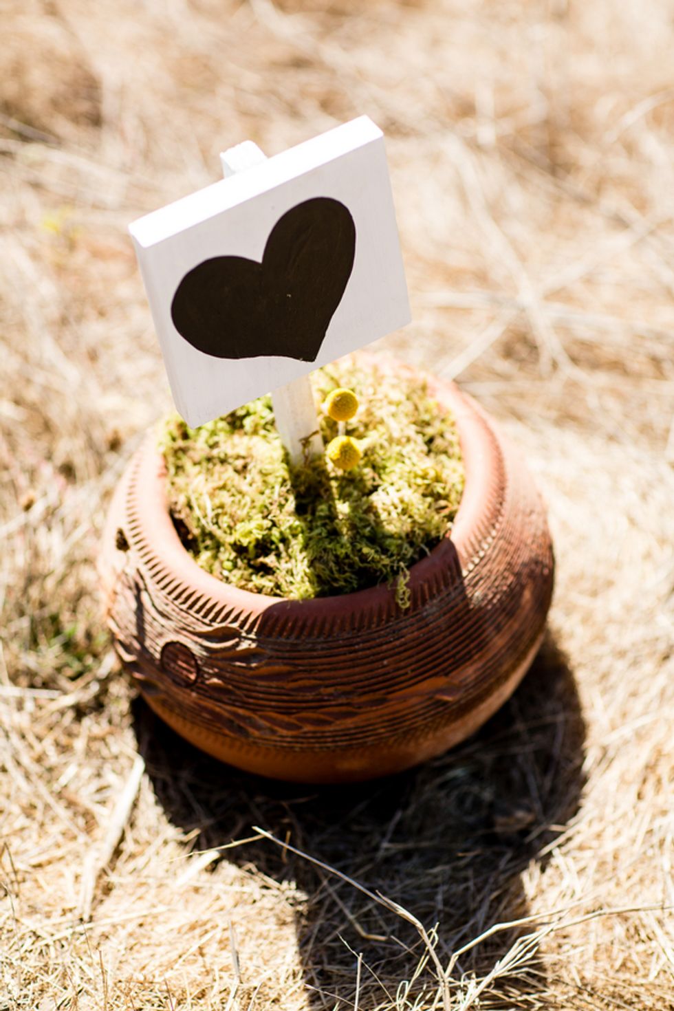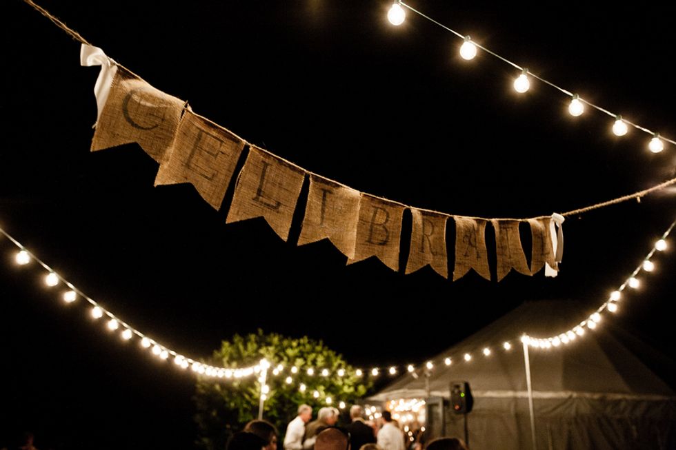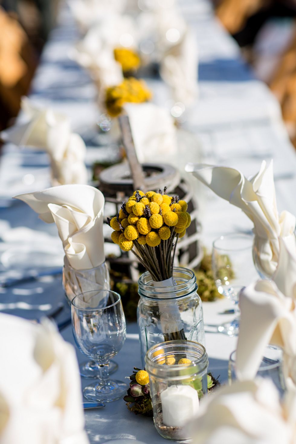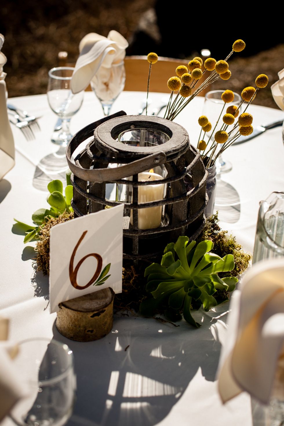 The details and design were kept modest and simple as they wanted to rely primarily on their surroundings to set the scene. DIY sign posts made were from broken-down wood pallets, scrap wood and leftover paint; the flower arrangements were created by the bride with flowers purchased from Etsy; the table center pieces were craft projects with purchased and collected items; wine barrels were purchased off of Craigslist, refinished and used as poles for light strings.