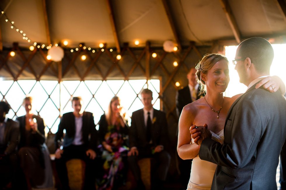After the reception dinner, the party moved into a yurt which hung off the side of a cliff over looking the California coastline. The sun burst in just as they began their first dance, creating the perfect light and atmosphere to kick off the party.