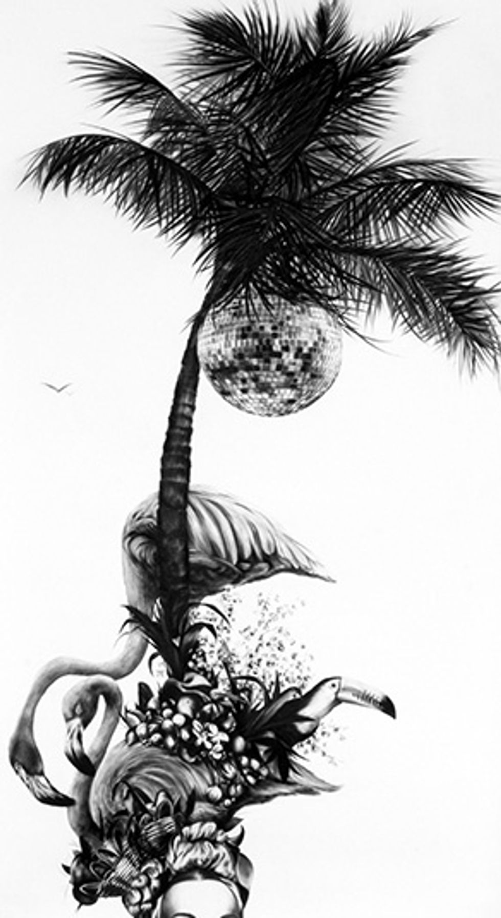 In "They Say I Came Back Americanized" at Dolby Chadwick, you'll get wrapped up in Fuenmayor's fantastical world of meticulous charcoal drawings that explore varying ideas of cultural fusions and identity politics. Sexy, exotic, and laden with a sense of humor, the artist plays with Latino stereotypes that have been perpetuated in American pop culture. Rococo chandeliers hanging from banana bunches, disco balls amidst palm trees, and exploding headdresses of flamingoes and flowers (no doubt referencing Brazilian entertainer Carmen Miranda) all culminate in an extravagance rooted in both reality and imagination. It's eye candy with serious heft.