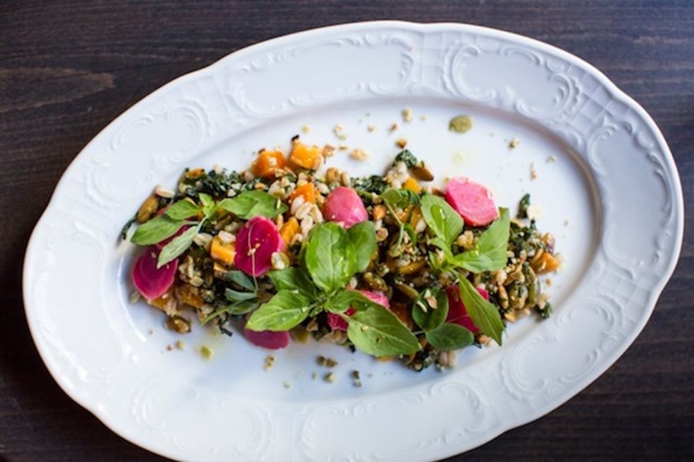 A stellar example of a flavor-packed grain-based salad, The Cavalier’s farro salad is good enough you may (almost) forget about their much-lauded cheeseburger. The plump grain’s nuttiness is accentuated with delicately toasted pumpkin seeds and tangy citrus vinaigrette; sweet roasted beets and fresh, peppery pea tendrils round out the mix. 360 Jessie Street