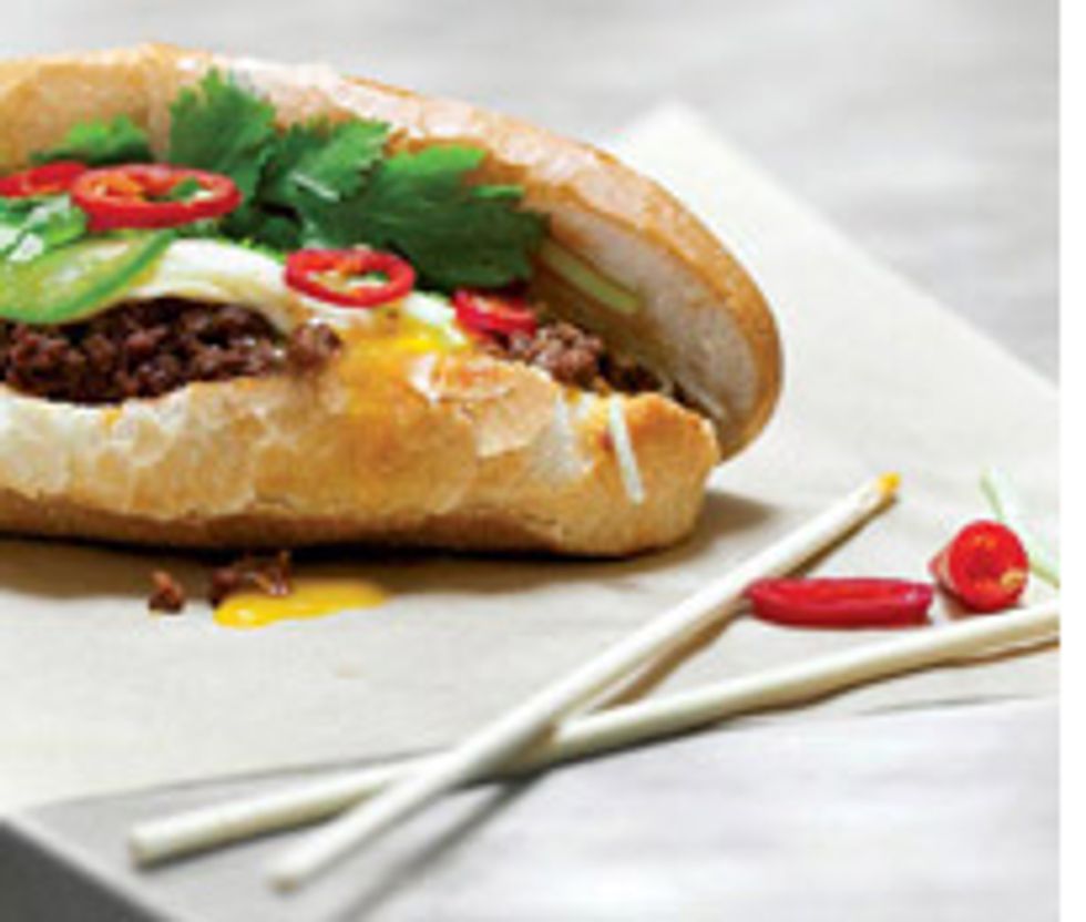 The Sloppy Bun is a mishmash of what I love to eat. It's a reflection of my heritage. We sauté ground beef with minced garlic and lemongrass and then add coconut milk and our house-made red curry. We spread garlic aioli on a baguette and add the beef curry topped with Thai basil and sliced chilies. I recommend it with a fried egg because the runny yolk mixes in with the meat.