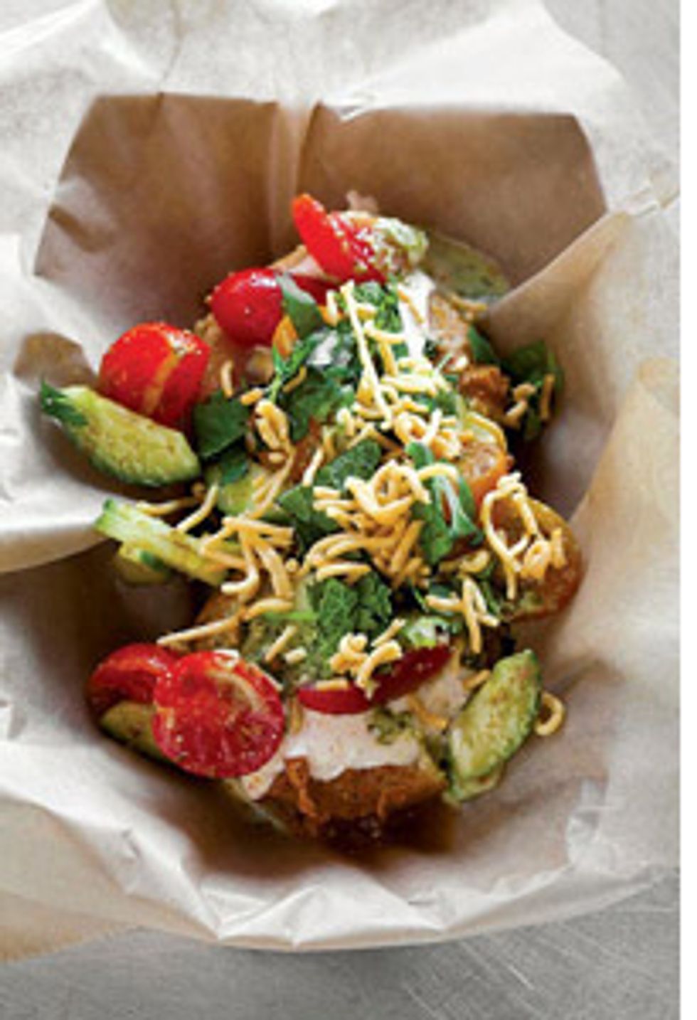 On the street, chaat is usually served with all kinds of fixings: tamarind-date chutney, cilantro chutney, yogurt, chopped raw onion, and maybe chopped tomato. In my version, I add a seasonal vegetable relish, such as one with Toy Box tomatoes and Persian cucumbers. Instead of mashing the potato, I use a ricer. I season the potato mixture with black salt, turmeric, hot Indian chili powder, and toasted cumin. I also add baking soda and double-fry the vada for the best texture.
