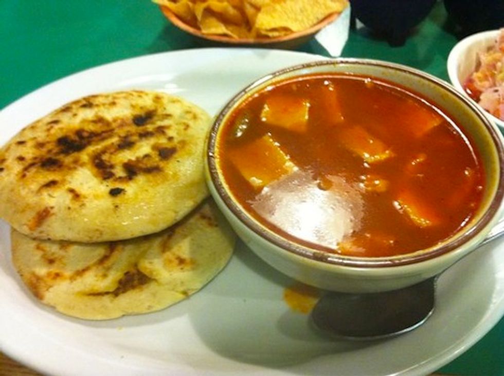Los Panchos is a favorite among locals. The friendly atmosphere and freshly made pupusas being pounded by women in the back make you feel like you’re in your Mexican grandma’s kitchen. Although primarily known for their pupusas, they also serve up a mean Menudo, with large portions of tripe, tendon, and pig foot. You can order a hearty bowl, or opt for a half bowl of Menudo with a side of pupusas, for a little something extra. This bowl is served with the usual red peppers, onions, and corn tortillas on the side.