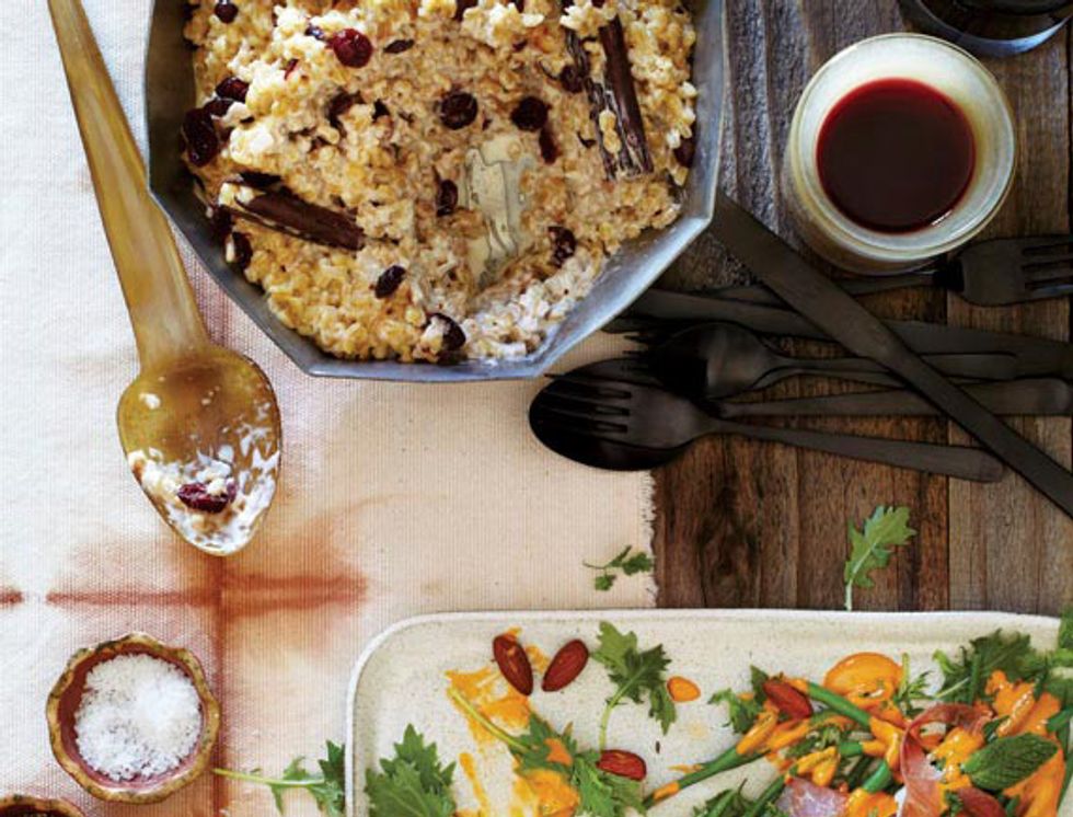 This is Aziza chef Mourad Lahlou’s savory take on the Moroccan breakfast porridge herbel, which is made by cooking barley with milk and cinnamon and then adding butter and honey or sugar. Though this recipe calls for lamb juice, we suggest chicken or turkey stock. Lahlou’s original recipe also called for Parmesan cheese, which we eliminated to keep it lighter.
