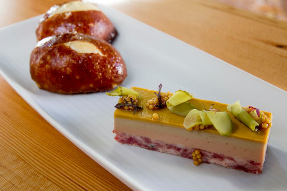 While your average Frenchman would be struck with agita by just thinking about a classic country-style pâté (made with duck and pork meat) being topped with a gelée of French’s Mustard (its taste is unmistakable!), one bite of chef Jason Halverson’s concoction could change Frenchie’s mind. Delicious scandal. There’s also a layer of duck liver mousse on this meaty number, with cornichons and a warm Firebrand pretzel roll on the side. Ooh la la! 1896 Hyde St.