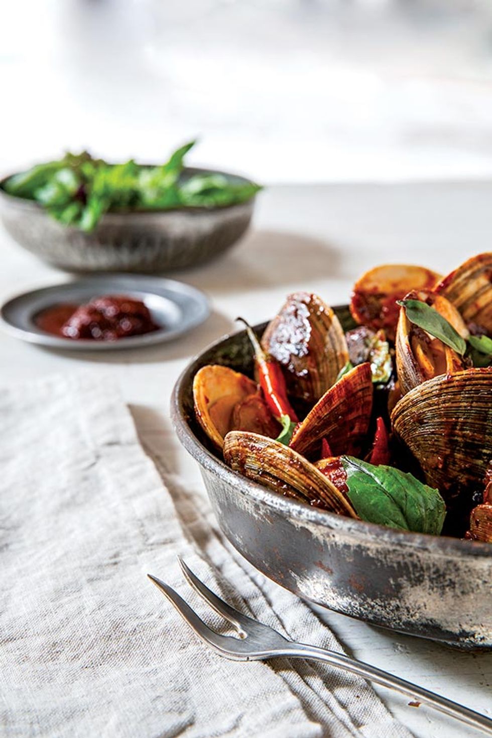 “I didn’t know how to cook at all when I lived in Thailand,” admits Bangkok native Pim Techamuanvivit, who was not impressed by the American Thai cuisine she found upon moving here for college in the early ’90s. Craving the flavors of home, she spent countless hours learning the recipes of her childhood over the phone and during trips back to Thailand. The owner of the one-year-old Kin Khao (Tenderloin), she is doing her family’s culinary tradition proud in a signature dish: chili jam clams. In Bangkok, her family was well-known for her grandmother’s chili jam—“It was a huge production…my aunts chopping garlic and shallots and prepping,” she recalls. “I smuggled two giant jars of it back in my suitcase.” The versatile condiment now appears at Kin Khao in salads and soups, but most profoundly as a sauce for clams accompanied by Thai basil. “When I learned how to make that dish, I thought of myself as a proper cook,” says Techamuanvivit.