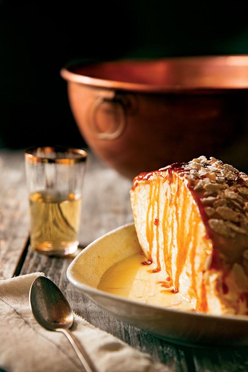 Hospitality runs in the blood of Laurent Manrique, who, as a boy, worked alongside his mother and aunt in his grandmother’s inn and cafe in the French town of Roques. “I grew up in the kitchen,” he says. “I was involved in the product, the cuisine of the countryside.” Now a serial restaurateur, Manrique has made his mark on SF’s French culinary scene, first at Aqua, then at Cafe de la Presse and more. With his newest venture, Aquitaine (FiDi), he wanted to share the flavors of his native Gascony. “All of these dishes were made when I was a kid, in my family, by great women,” he says of the menu. There, he uses his grandmother’s method and copper bowl, called a blanc, to create the Iles Flottantes, a classic “floating island” dessert of meringue baked with caramel. The egg whites react to the blanc while caramel seeps into the cake, which is then flipped upside down and served with crème anglaise, almonds, and caramel drizzle. Given to him by his grandmother before she passed, the blanc is as essential as the ingredients. With more than a dollop of nostalgia, he adds, “I can only make this dish with this bowl.”