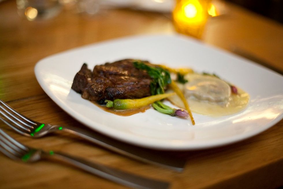 Main Course: Grilled ribeye steak with oxtail and Tuscan kale ravioli, parsnip puree and baby root vegetables—paired with St-Germain Dia Del Amor