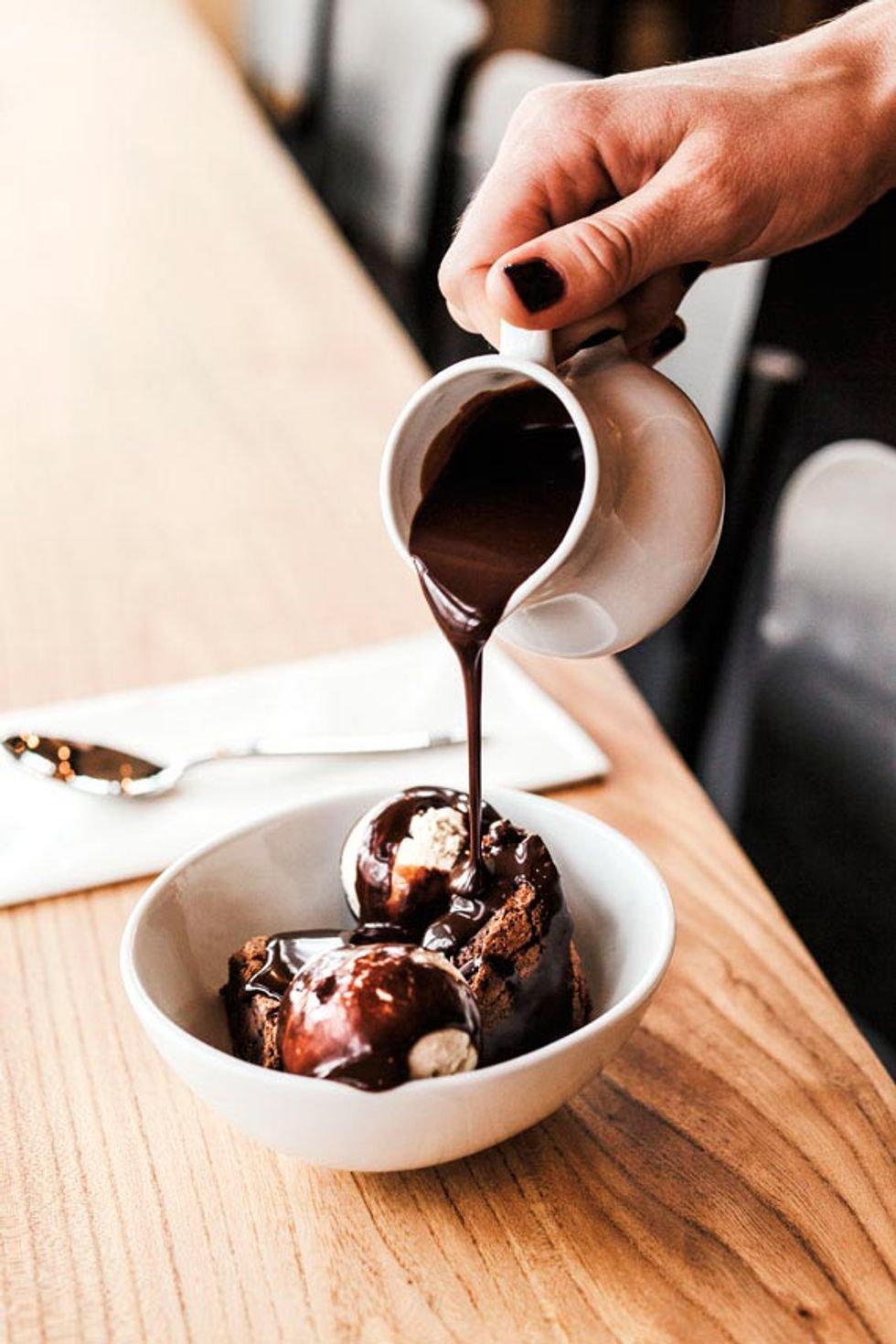 Charles Chocolates’ new 7,600-square-foot Florida Street factory, cafe, and store (formerly Potrero Brewing Company) serves tried-and-true favorites—including Siegel’s made-to-order s’mores, composed of a caramelized marshmallow and bittersweet chocolate atop an organic homemade graham cracker—as well as new offerings such as a layered cake of hazelnut praline mixed with crispy feuilletine and topped with dense bittersweet chocolate mousse.