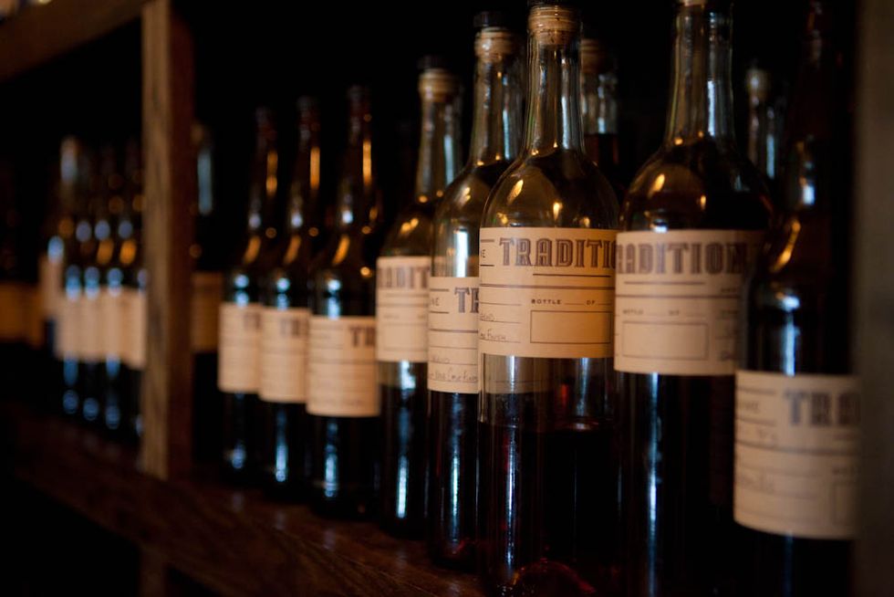 If you're up on your local bar knowledge, you might recognize the address as the former home of the hilariously named Mister Lew's Win-Win Bar & Grand Sazerac Emporium. There's a story behind the change: the Future Bars team of Doug Dalton and Brian Sheehy initially acquired the former Club 441 space with the goal of renovating it, but they re-christened it for a single night, to throw an epic birthday bash for the company's creative director, Justin Lew. After the party ended, guests kept coming back for more, and Mister Lew's ultimately stayed open for more than a year, dishing up cheap, high-quality cocktails in the relatively untouched divey atmosphere of the 441 space. In January, the team finally called off the party (to many regulars' chagrin), and began renovating the space into Tradition (known as "Trad bar" for short).