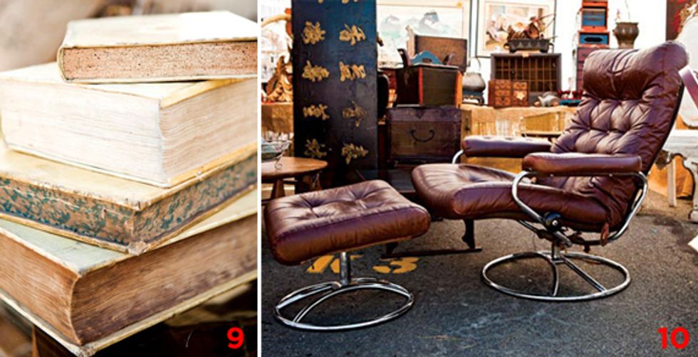 9. McKinley jokingly calls vintage French grain sacks (being used to recover chairs as well as for table runnners) “the new velvet” and says that Kymberley Fraser’s stand is a good place to pick up the hot commodity at a fair price. Fraser also has an extensive collection of vellum (calf skin)–bound books dating back to the 16th century. Mostly written in Latin, they’re best used as home decor accents.