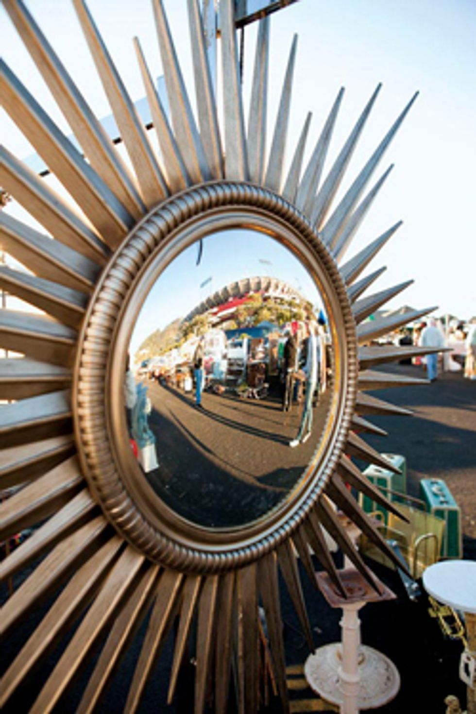 7. Dealers know which items are selling at the big retail stores and will bring similar items to market, often at similar prices—although occasionally one comes across a great deal. A trendy sunburst mirror at Helene DeSouza’s booth is being sold for $125, a bargain.