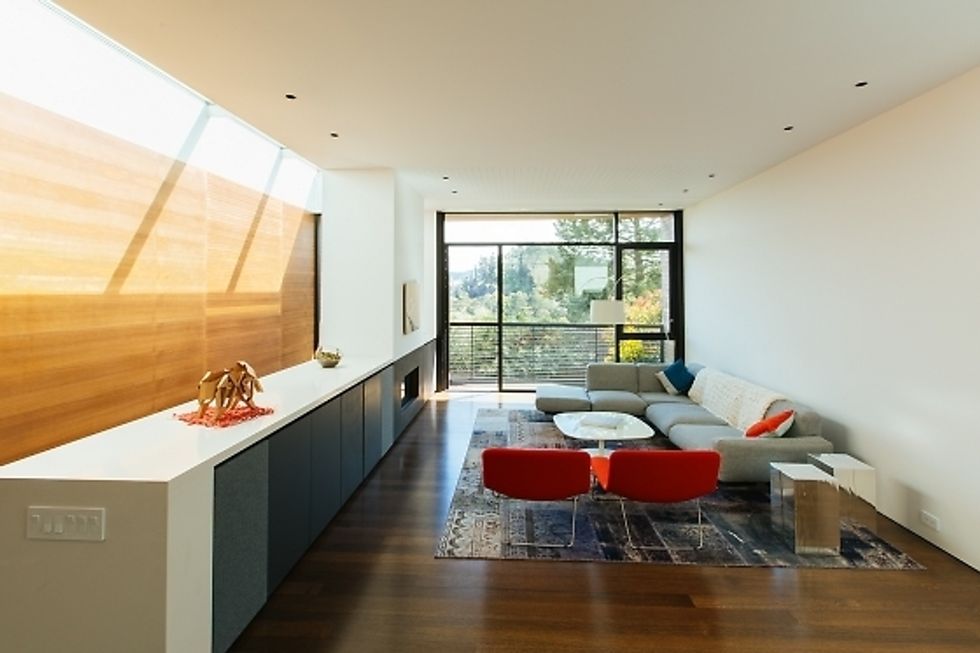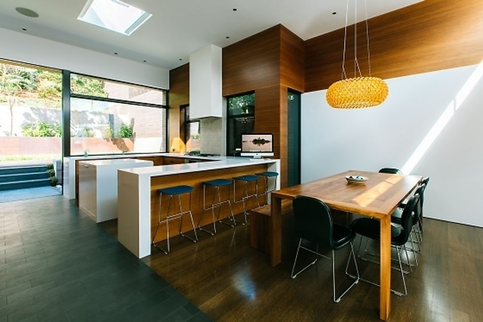Croyle's home practically exudes "form meets function" with tons of built in storage, so there's no need for extra furniture such as dressers. The main living space including living, dining and kitchen areas broken up by various design elements. For example, the kitchen and dining room are at one level while the living room is on another. To maintain the open, airy atmosphere, the kitchen has no upper cabinets, allowing more light to flood into the room.