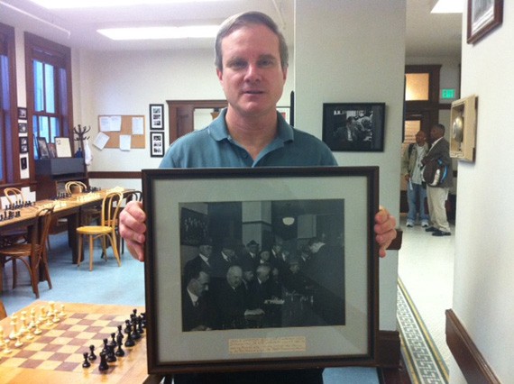 Here, Donaldson holds a framed photo of champion Alekhine at the chess club in the 1920s playing 32 people at once.