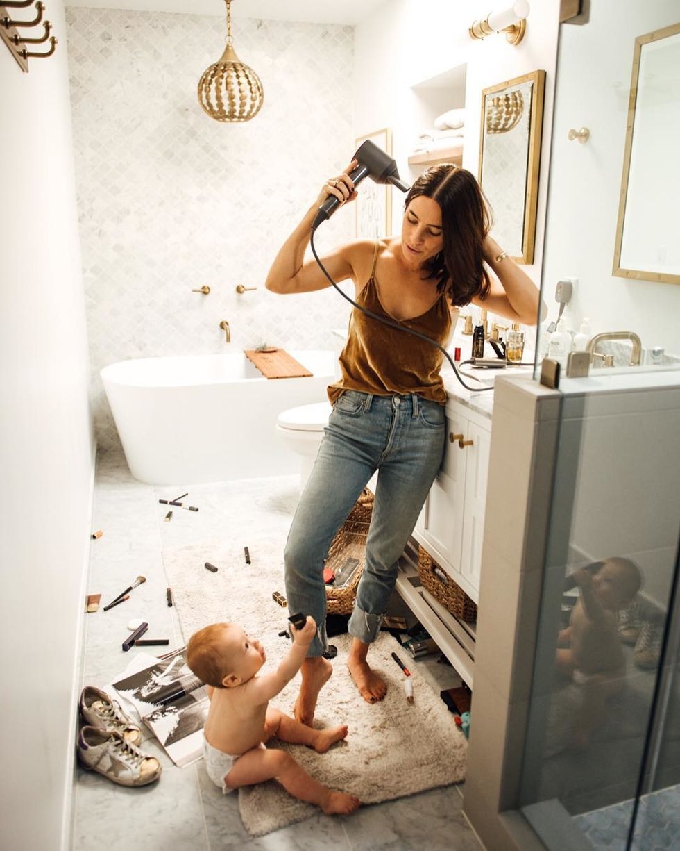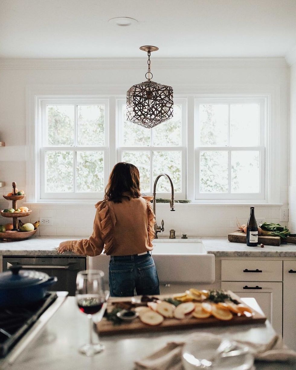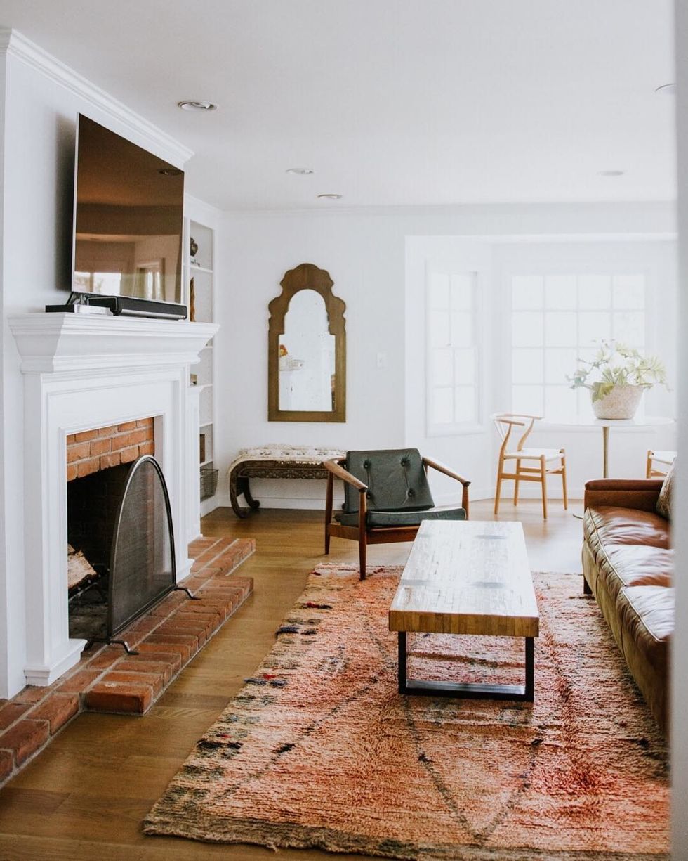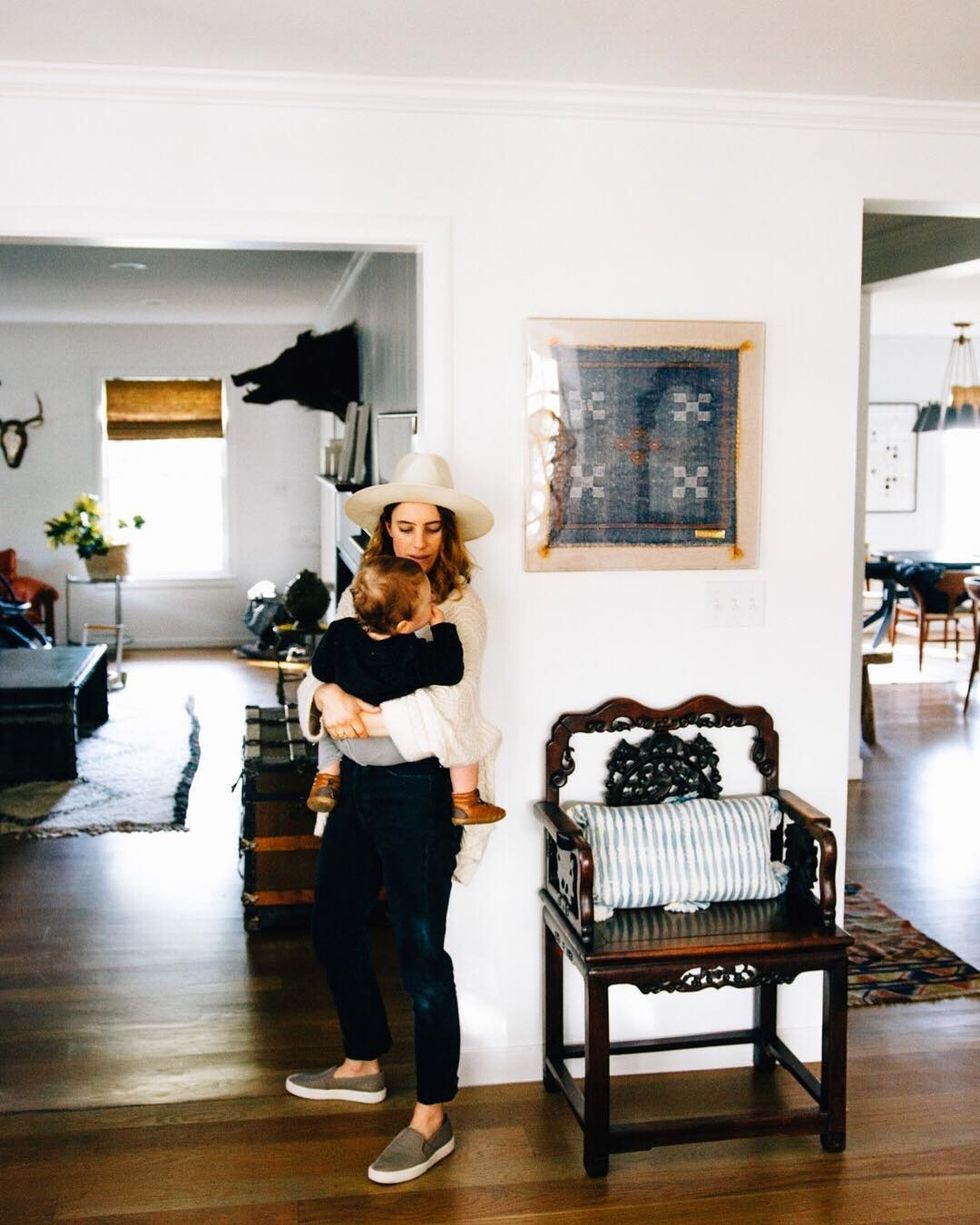 "My style is unfussy—I didn't want anything too precious or formal," she says. "We have a toddler now, so nothing is off limits. He's already destroyed half our house, but I am the kind of person who thinks that adds to the character. I don't mind the crayon markings on our leather couch and Moroccan rug."