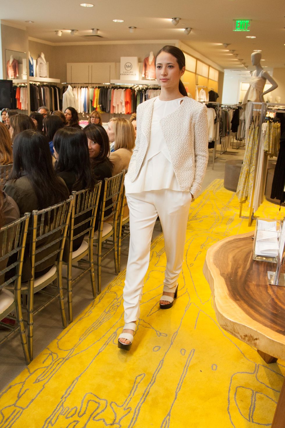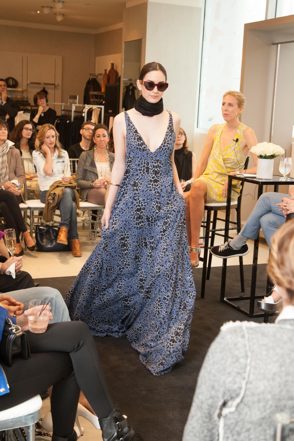 In between shout-outs to his family—his sisters and mom were in the audience, and his partner made an appearance via cellphone video chat—Lam divulged his fascination with architects, enduring inspiration in SF’s individuality, and dining plans during his trip (you may have spotted him at Zuni or Tosca this weekend). But the designer’s eyes lit up most when models glided by in the 10 Crosby looks: Lam’s architectural interests, as well as Giardina’s background in sculpture, were inherent in the minimalist lines, urban color palette, and unexpected details. Guests sipped Champagne and snacked on vegetable spring rolls as a leopard print maxi dress, striped poplin shirtdress, and head-to-toe white ushered in spring. Looks also featured platform sandals and calf hair mules from the designer's shoe line. Click through the slideshow to check out some of our favorite looks!