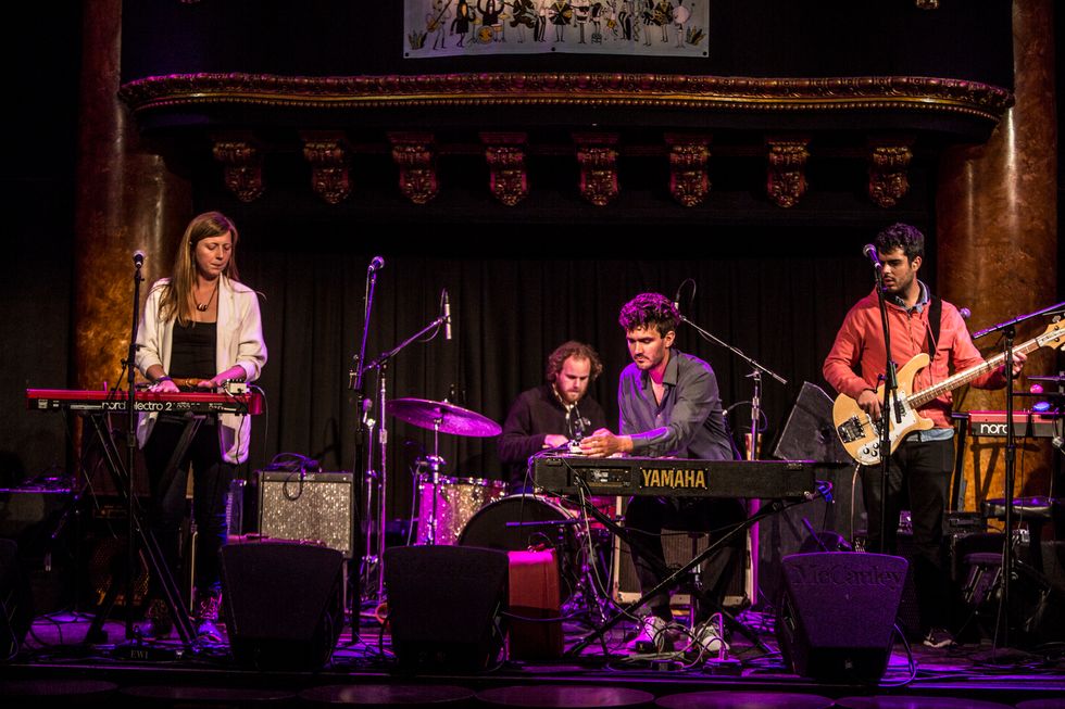 Naytronix, helmed by Nate Brenner, the bassist of tUnE-yArDs, was playing when I entered the massive club. The vibe was very SoMA, or maybe that’s what the Mission is evolving into. The band members wore blue, sequined t-shirts with matching, geometric shapes on them. I wasn’t sure if they were being serious or just festive for the occasion, but they did seem to take their sound seriously and the crowd ate it up; mostly by bobbing their heads to the beat.