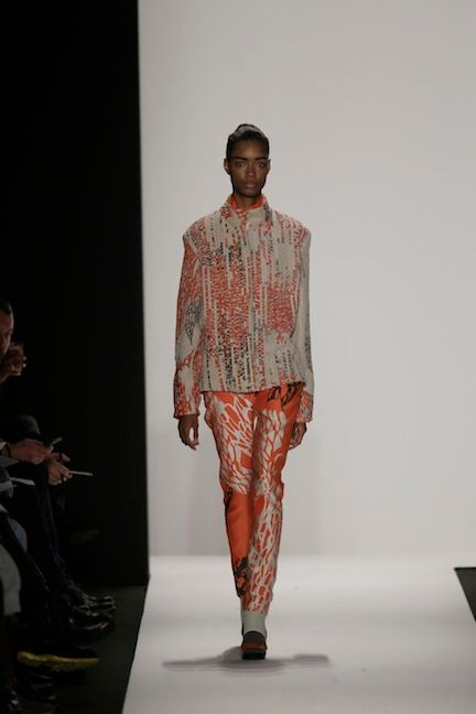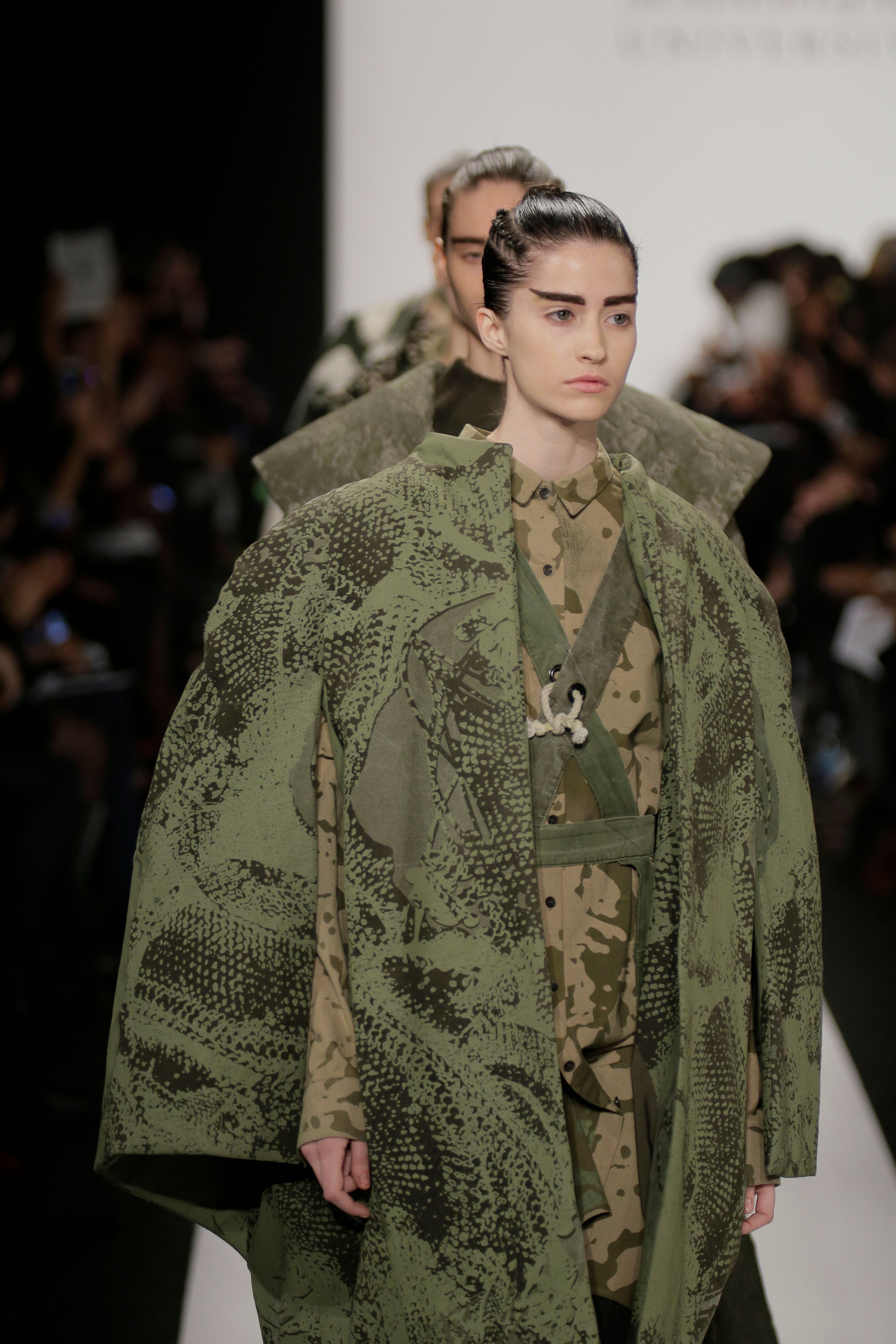 Academy of Art kicked off the show with a colorful womenswear collection by designers Jaci Hodges and Nisha Hannah Btesh. Bright, felted-Shibori texturing and Andy Warhol-esque prints gave off a vibrant 1960s vibe. Other bold moves included unexpected elements of geometric netting and handsomely woven pieces from designer Earnest Huang in collaboration with textiles by Hong Ni.