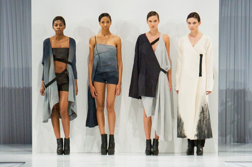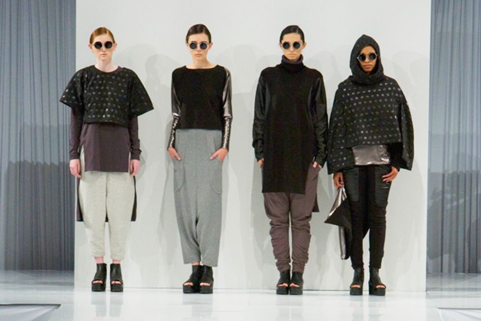 Selecting just one recipient out of so many potential design stars of tomorrow was difficult, and we'd be remiss not to mention these names you'll most likely here from soon. Lily Lei showed a sophisticated play with sporty and futuristic textures. Each layer counted from the silver lame underpinnings to the tunic crop tops in iridescent polka dots. They were dressed down with edgy drop-crotch sweats and slouchy leather pants.