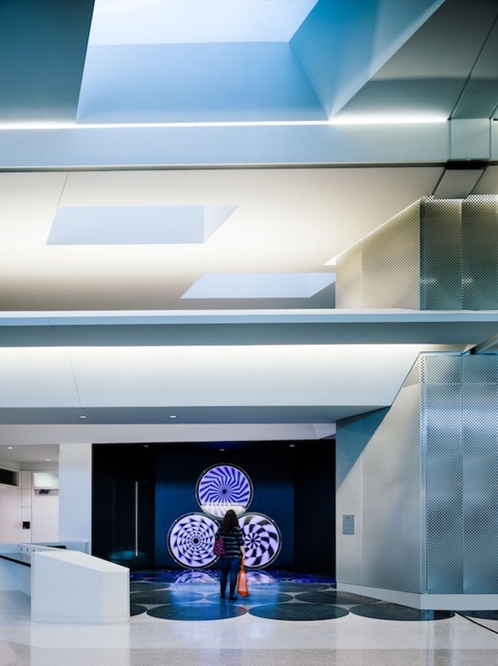 The $138 million renovation encompassed 60,000 square feet of the terminal (or 10 United Airlines gates). Among the highlights? Heightened ceilings and skylights that draw in more natural light to the holding rooms; a yoga room featuring a Zen-inspired, floor-to-ceiling illuminated fissure; circadian adaptive lighting in the hold rooms that mimic natural lighting; a children's play area with large moving circles set into the floor; and two areas designated for pop-up shops, such as Ferry-Building standby McEvoy Olive Oil from Petaluma, and Collector from Berkeley. The new boarding area features two new site-specific artworks: a psychedelic installation by local artist Eric Staller and a suspended light sculpture by Merge Conceptual Design. The new artworks were commissioned for the airport by the San Francisco Arts Commission, which is also responsible for the exceptional suite of two-dimensional works by such greats as Wayne Thiebaud, Jay DeFeo and Robert Bechtle. A raised "Flight Deck" near the entry, created in partnership with Razorfish, houses touch screen panels that relay information about SFO flights throughout the world. Similar to Terminal 2, connectedness is a priority. Find with elevated work tables, free WiFi and hundreds of easily accesible power outlets throughout the space.