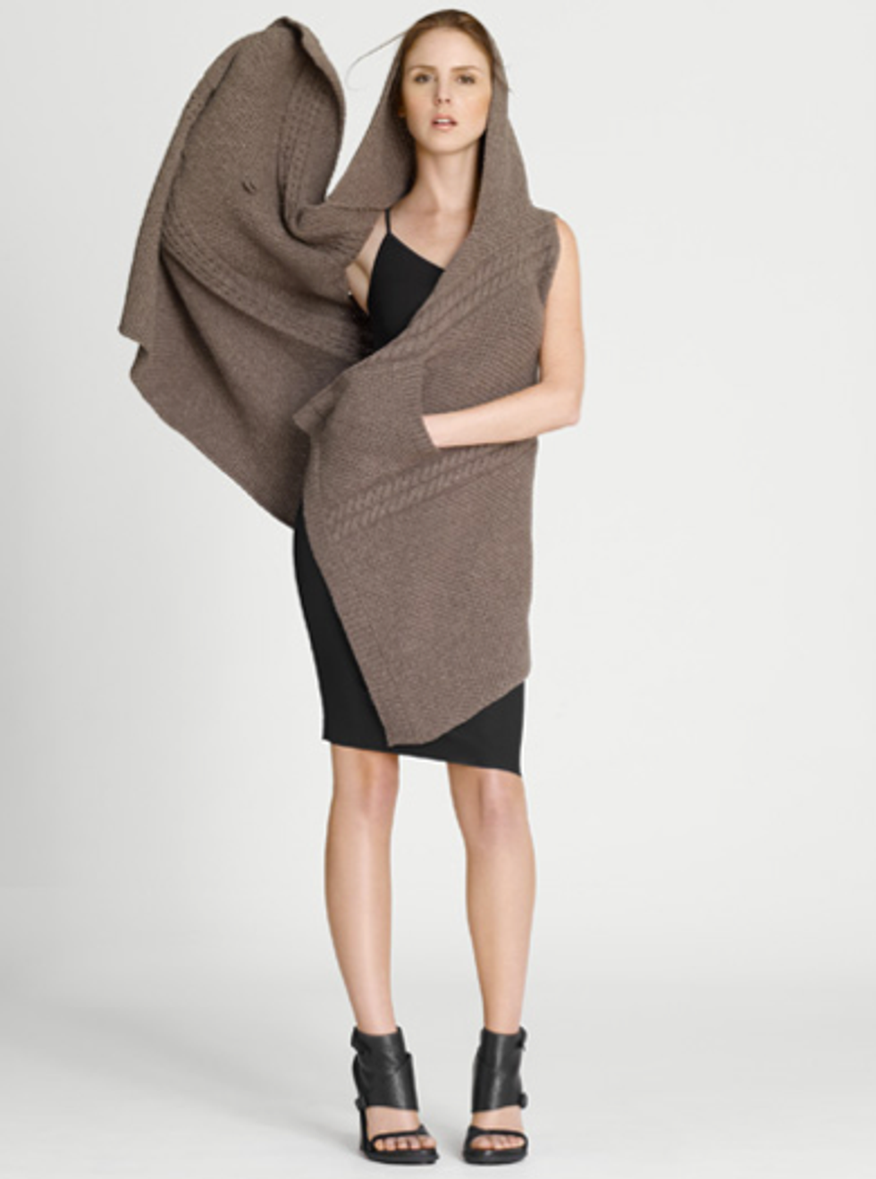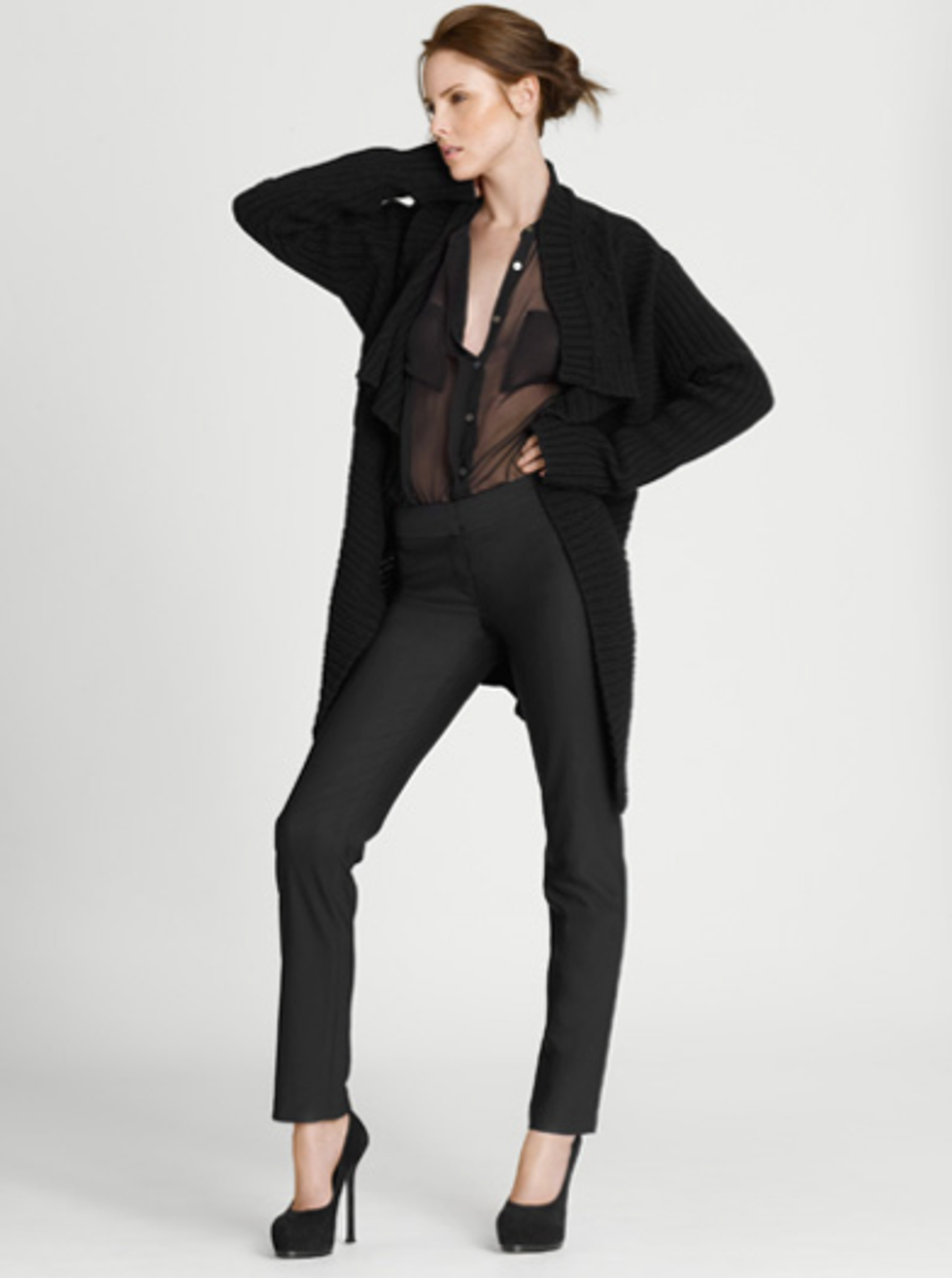 When denim dominated the Spring runways, Julie thought it was ample time to reinstate the perfect, non-denim pant. A preview of the Fall '11 collection reveals paired down professional basics with a sharp edge. Form-fitting shift dresses, tailored outerwear, cozy knits, and cropped pants elevate the brand to cool classic. The trendiest outfit — a sheer black blouse paired with cropped pants and an oversized sweater — will outlive seasonal flightiness. Watch out Theory, Chaiken's back in town.
