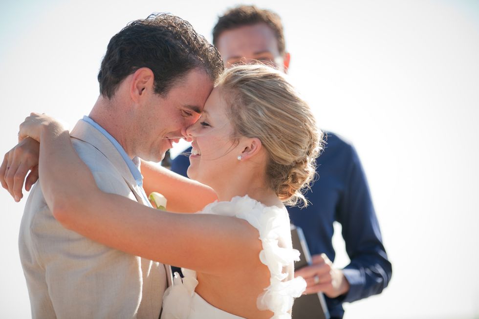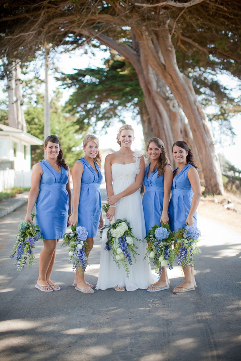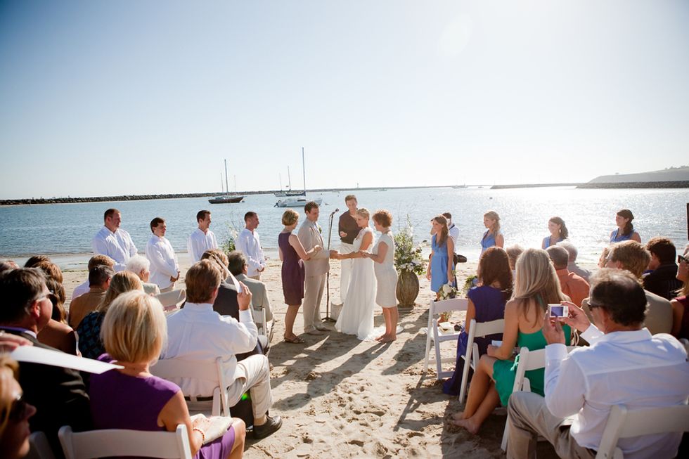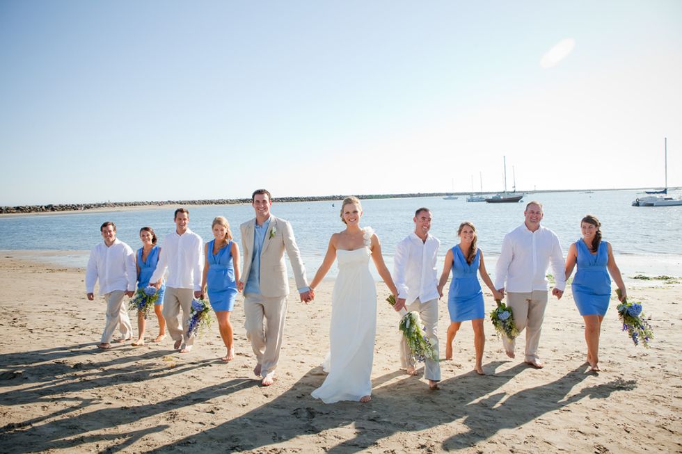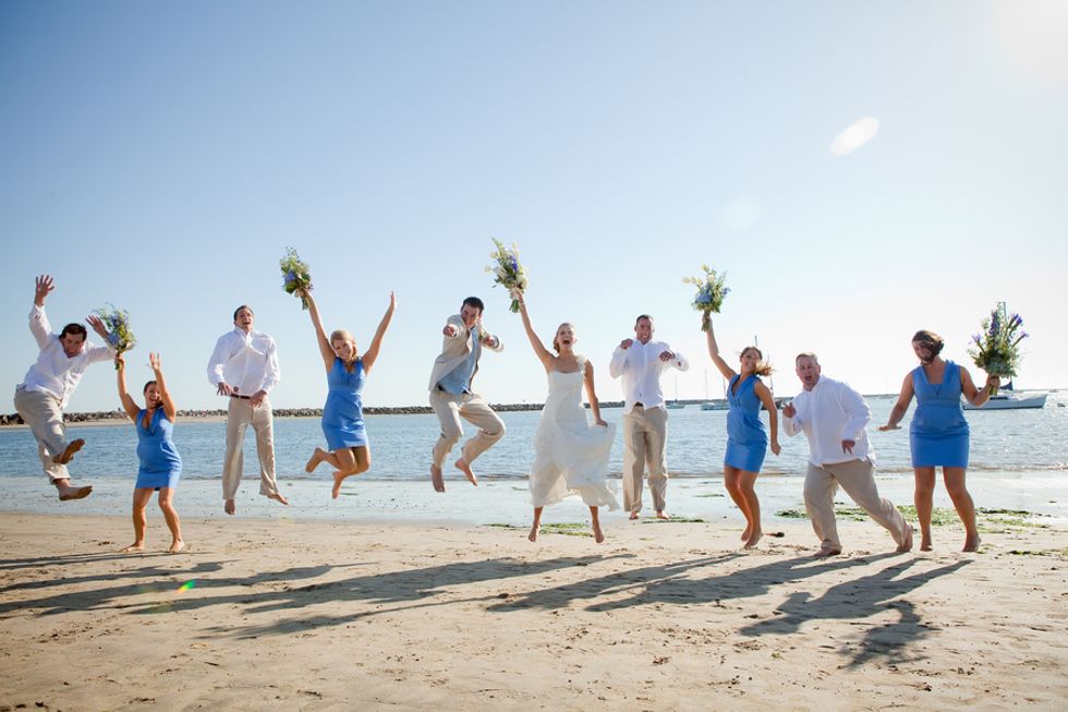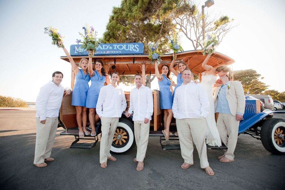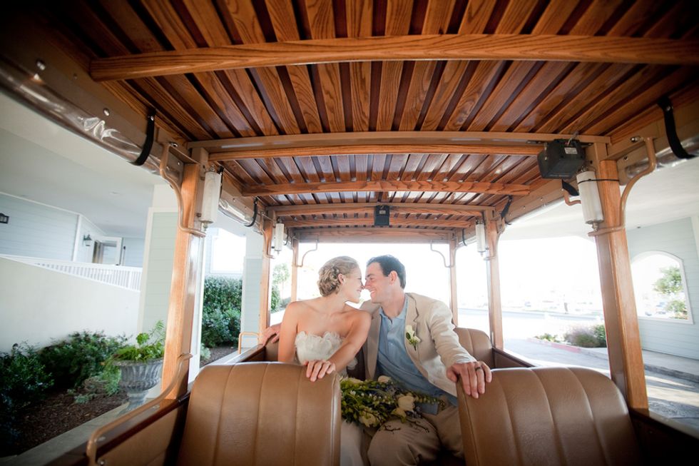 Marissa & Jesse were high school sweethearts from the Bay Area, and although they live in L.A., they wanted to get married near family and somehow make a beach wedding work in Northern California. They decided on the Oceano Hotel in Half Moon Bay, and picked the perfect time of year (late September) for gorgeous beach weather. They were married on the beach, with their reception just a few steps, or a fun ride on Mr. Toad's Tour Shuttle Bus, back to the hotel. The bride wore a beautiful flowing gown and bare feet for the ceremony, and then changed into a dancing dress later in the evening. The boys wore sandals and beach formal. Lovers of travel, Marissa & Jesse created luggage tags for their guests' seating cards. And after a rocking dance party, Marissa surprised Jesse with his favorite late-night snack - donuts for all!