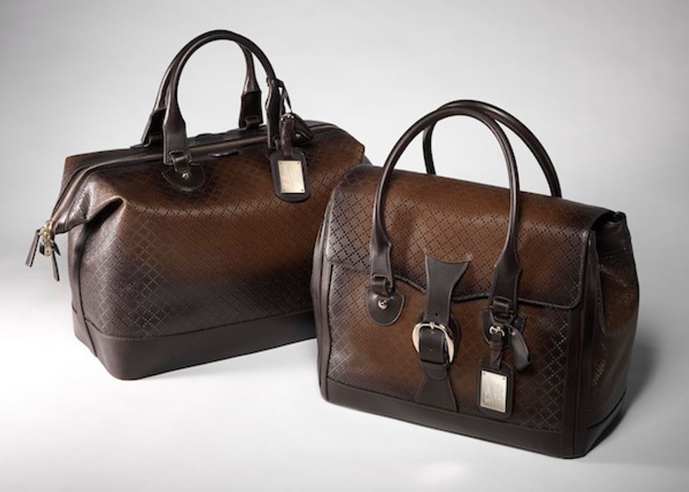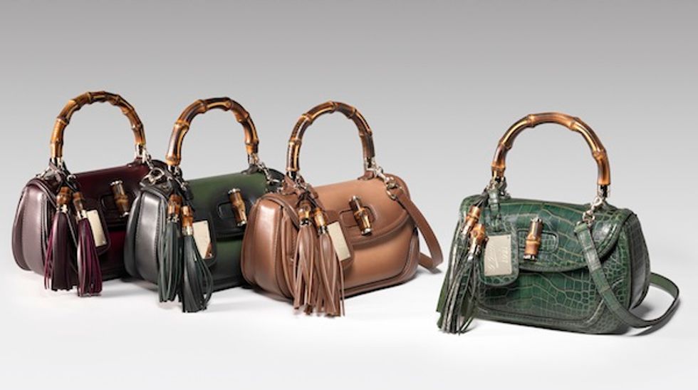A nuanced trademark stamps the collection. 'G. GUCCI Firenze 1921' can be found on the inside of accessories, on belt buckles and printed on travel tags. Fan favorites will be the special editions of bestselling handbag styles; the New Bamboo, the New Jackie, and the Horsebit Chain handbags, in calfskin and crocodile, in rich colors like chocolate, khaki, cherry and bottle green. Handsome vintage-inspired men's suitcases are notable, embossed with the historic Diamante pattern.