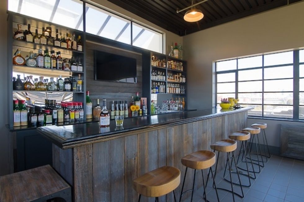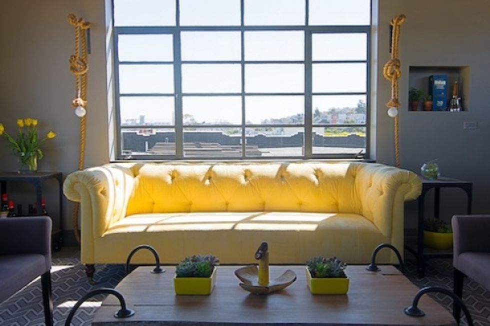 When it comes to kicking back with a beer, the atmosphere is typically less ritzy lounge, more rec room. But San Francisco's Anchor Distilling Company wanted to create a high-design destination where its best clients could sample the product in style. So they teamed up with designer Melanie Coddington to build out a penthouse suite atop the the iconic distillery and deck it out with bright custom furnishings, graphic rugs and a swank bar. The finished product is a dramatic change from what is once was: a dreary conference room filled with white boards and rolling chairs. Drink up!