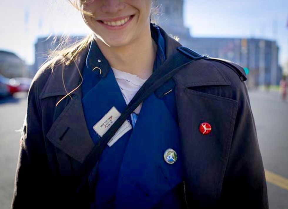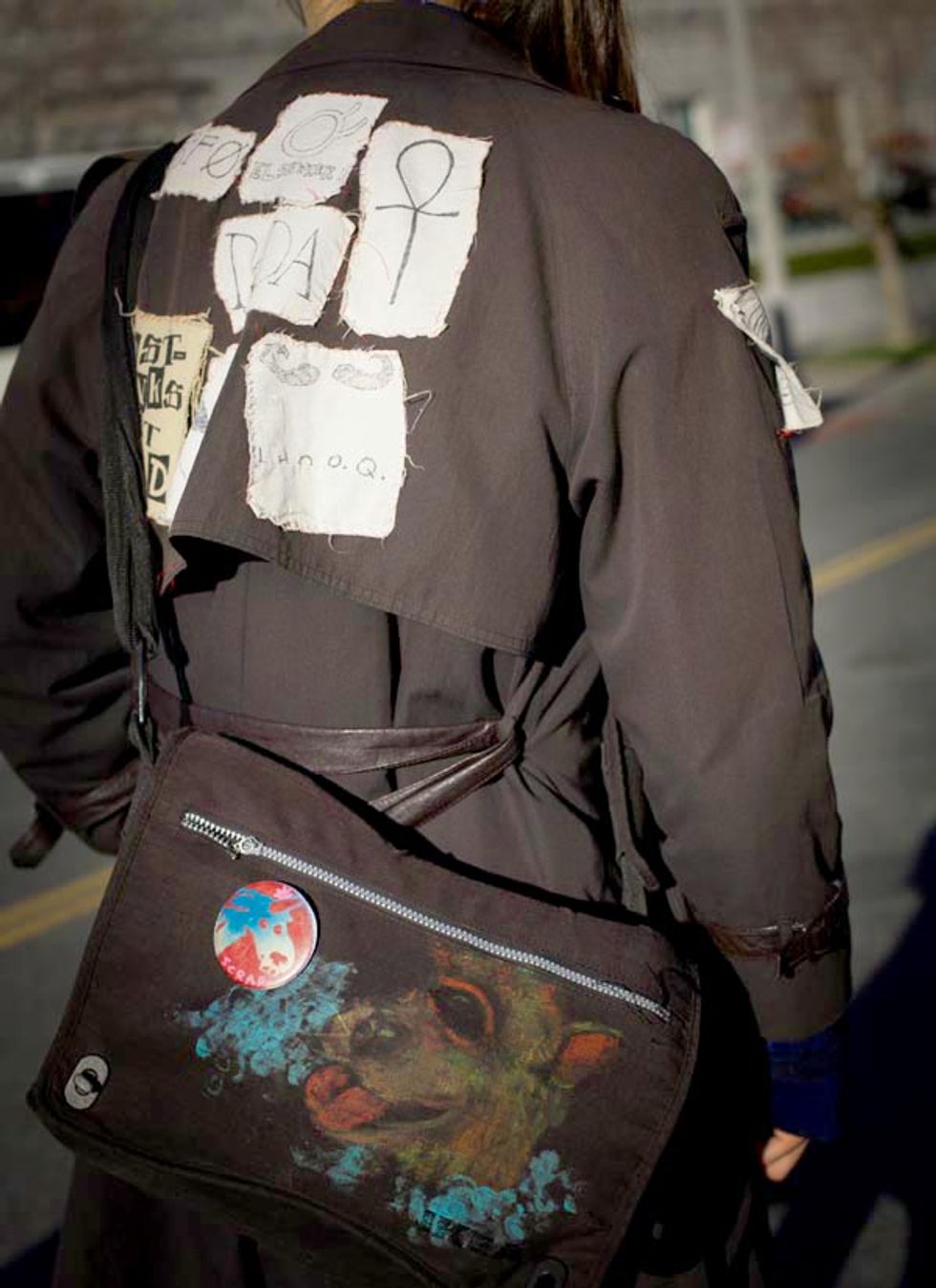 What he's wearing: White Salvador Dali print t-shirt purchased from Community Thrift; Vintage military jacket from Buffalo Exchange (originally for a Emperor Norton Halloween costume); Navy London Fog trench coat with self-made patches and a "Post Punk's Not Dead" patch purchased at the Anarchist Book Fair; IKEA messenger bag with painting done by ex-girlfriend; Quicksilver corduroy pants; Round-toe cowboy boots by Ariat.
