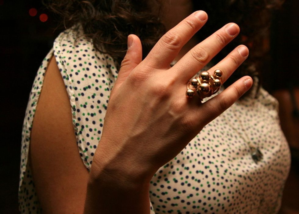 What she wore: Zara dress, Banana Republic necklace; Ring, unknown; Christian Siriano shoes; Haircut from Slope Suds in Brooklyn.