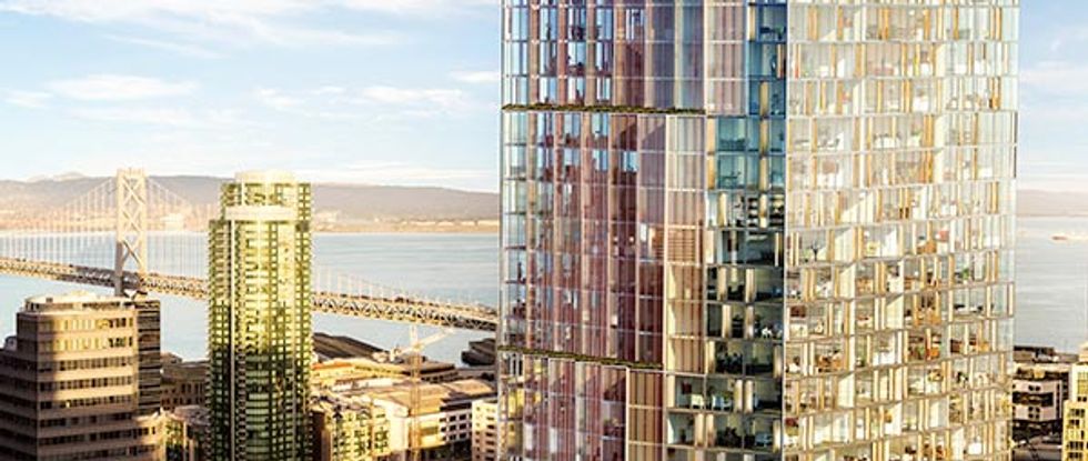 Design Highlights: It’s a podium building—one that includes multiple heights. On the Folsom side, the tower extends 550 feet into the sky, but at the rear, it features a row of smaller-scale townhouses along Clementina Street.