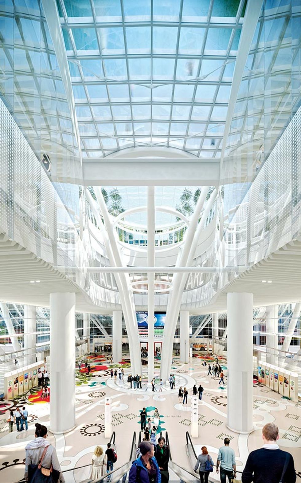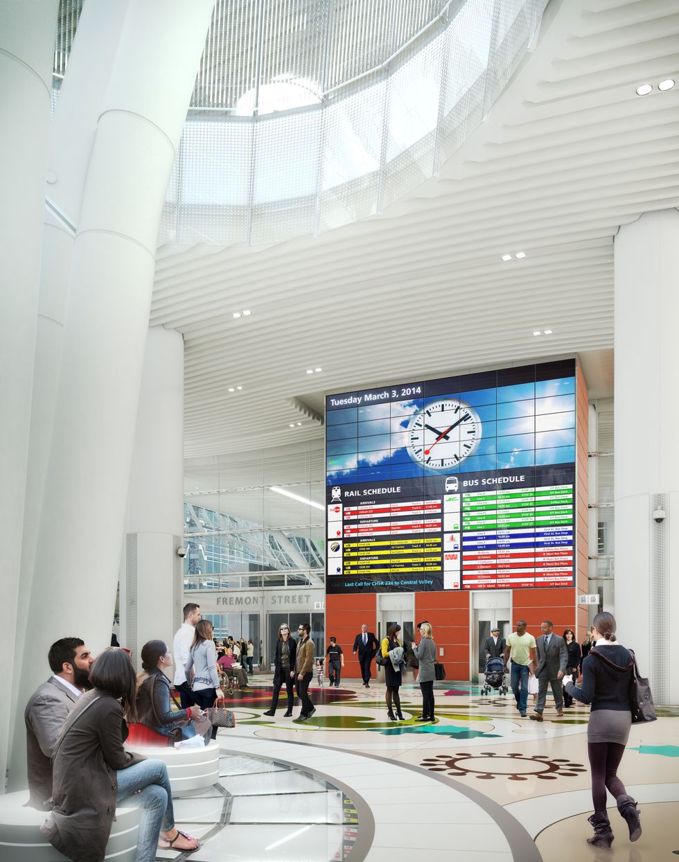 Design Highlights: The TJPA will spend $4.75 million on public art, defining its look and feel. A work by James Carpenter has glowing panels in the ceiling and on the floor. Local artist Julie Chang, who lives a few blocks away from the terminal, designed the terrazzo floor in the Grand Hall with eye-popping images of bright California poppies amid large geometric patterns. SF-born artist Tim Hawkinson has created the rugged abstract image of a 41-foot-tall man, which is being crafted with construction debris from the old terminal.