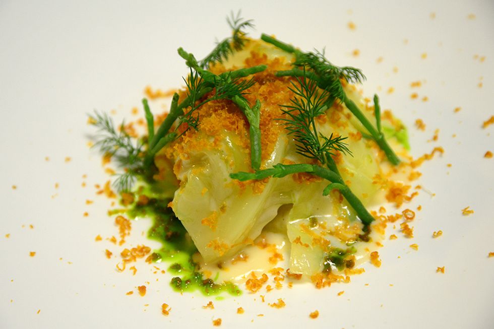 Although we hadn't ordered it, we were more than grateful when the kitchen sent out a dish of cabbage, cooked sous vide with butter and salt, dressed in a sauce of buttermilk (a happy by-product of the restaurant's own cultured butter), and garnished with sea beans (the tender and salty green shoots of the native succulent, Salicornia pacifica), dill, and shavings of cured sea urchin whose flavor somewhat resembled that of dried caramelized onions dipped ever so briefly in the sea.