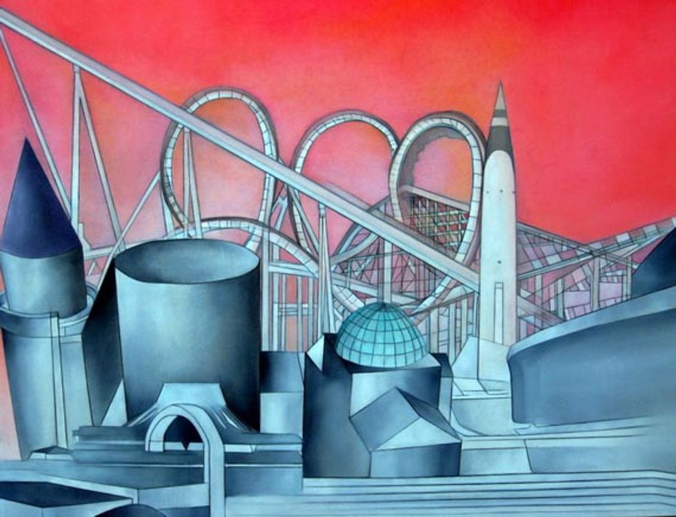 Araujo’s imagined utopia conjoins classical and futuristic structures, weaving circus arenas and roller coasters into rosy, dream-like scenes. In doing so, she hopes to bring out the sense of “what might be” – a fantastic inquiry too often stamped out by the monolithic “what is” in our daily experience of architecture.