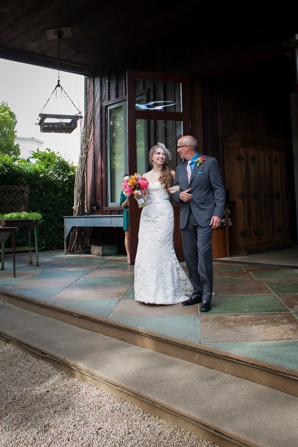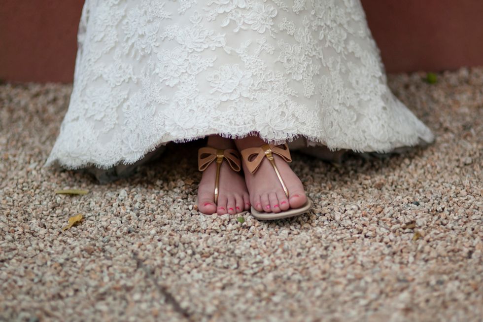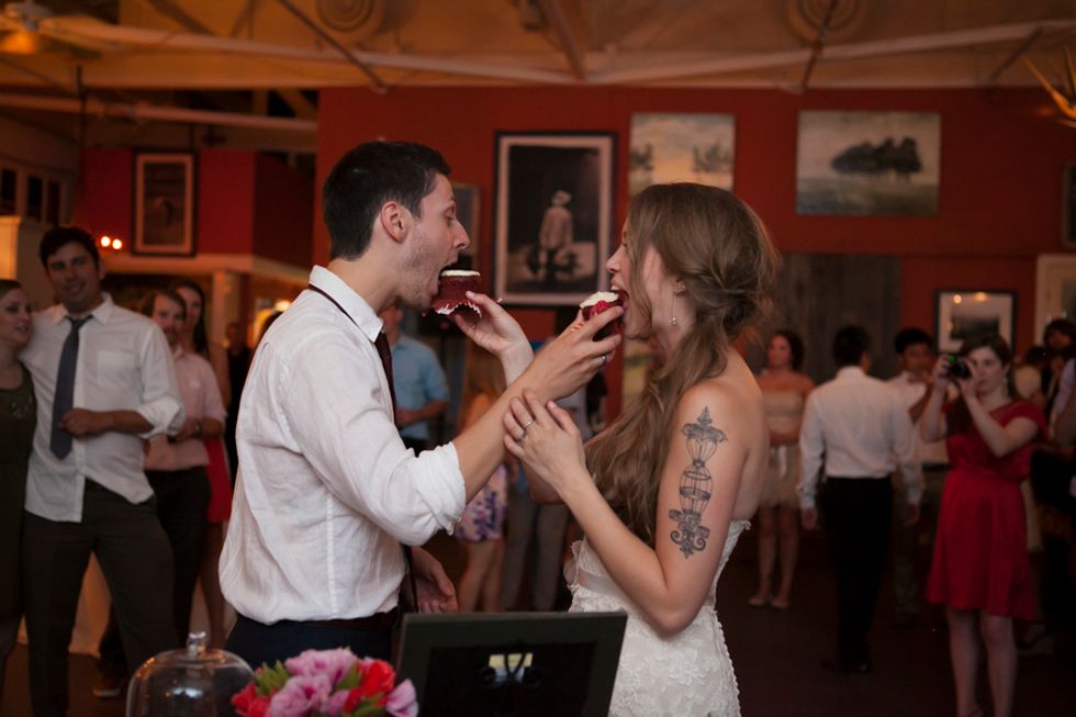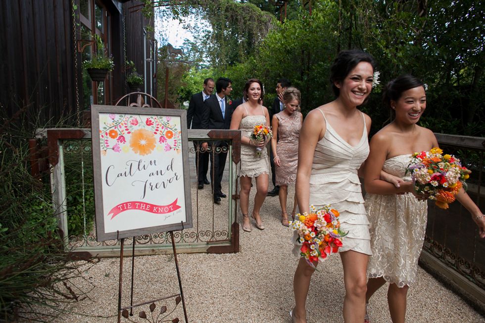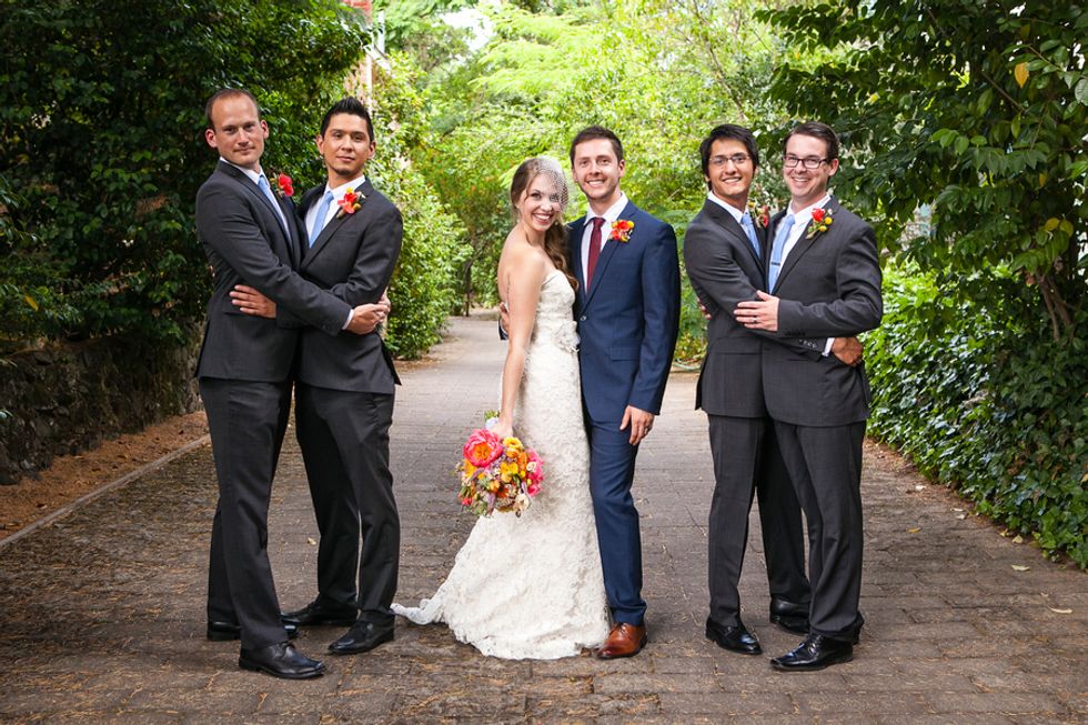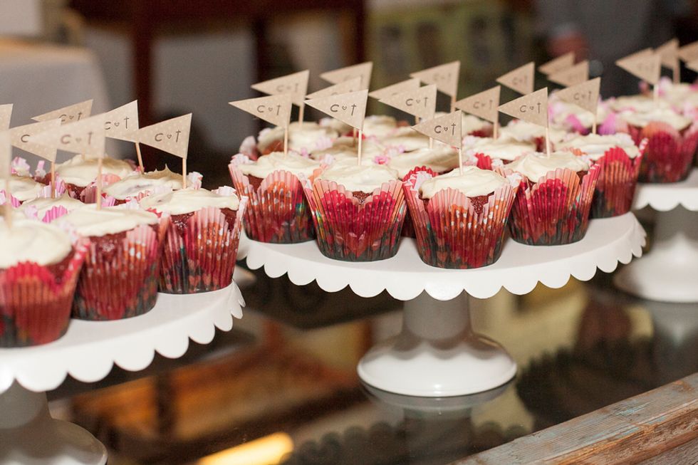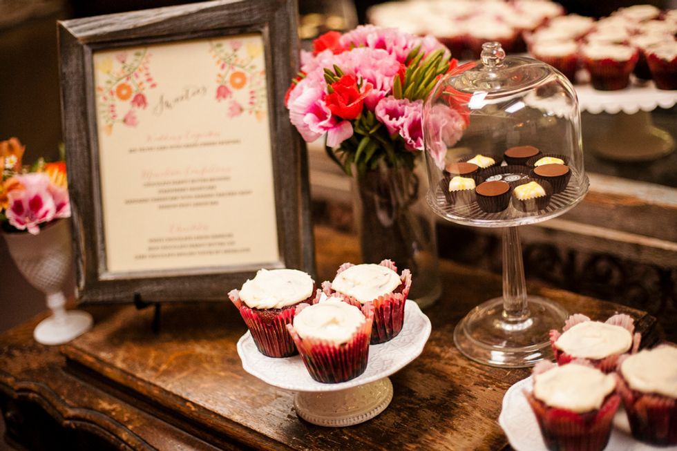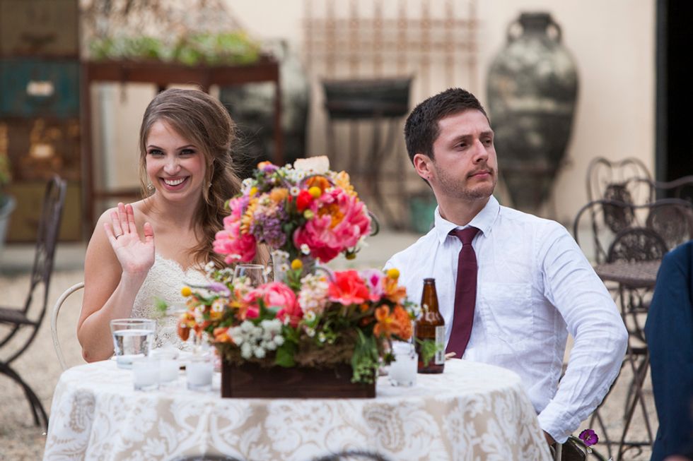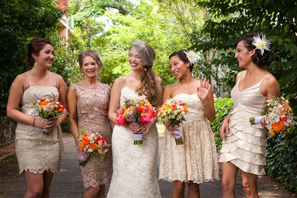 The entire wedding was an event to remember with brightly colorful flowers accenting the bride's lace gown and the champagne bridesmaids' dresses. The untraditional bride opted for sandals rather than heels, and a cupcake bar rather than a cake, but everything came together beautifully for a truly gorgeous celebration.