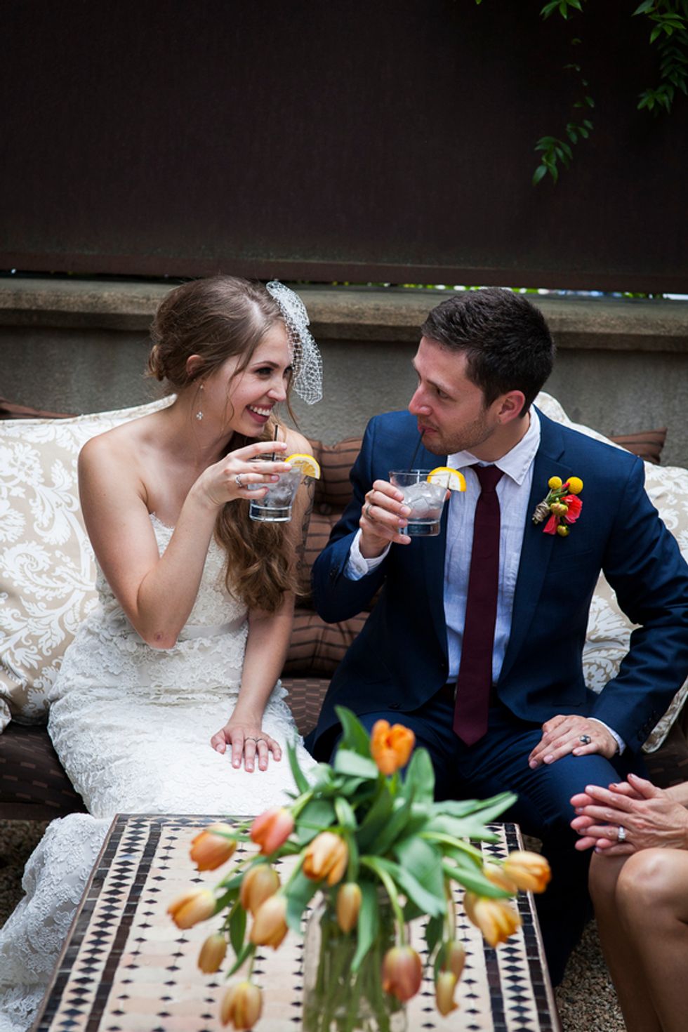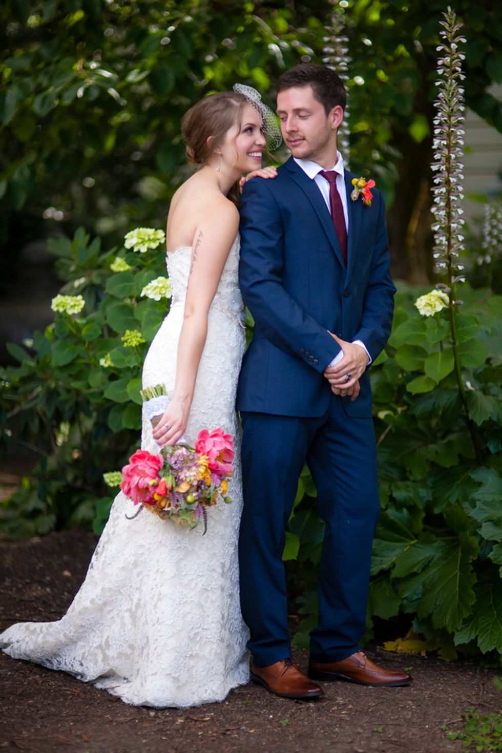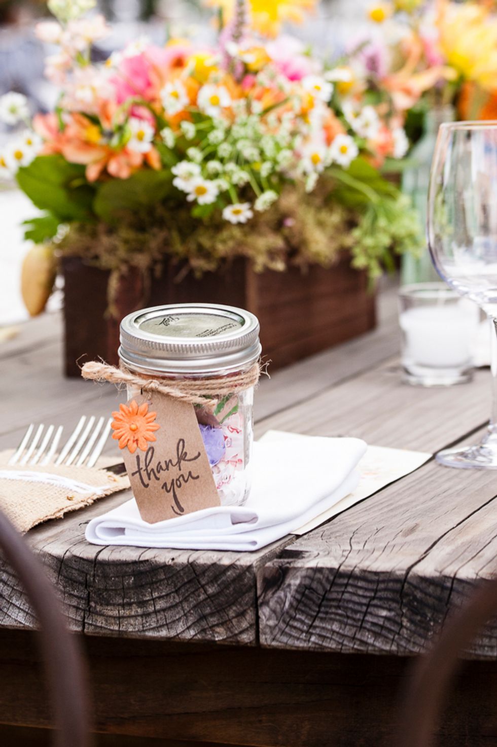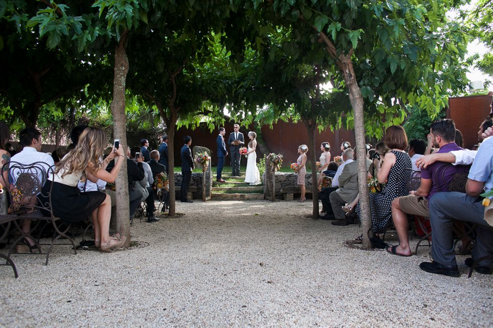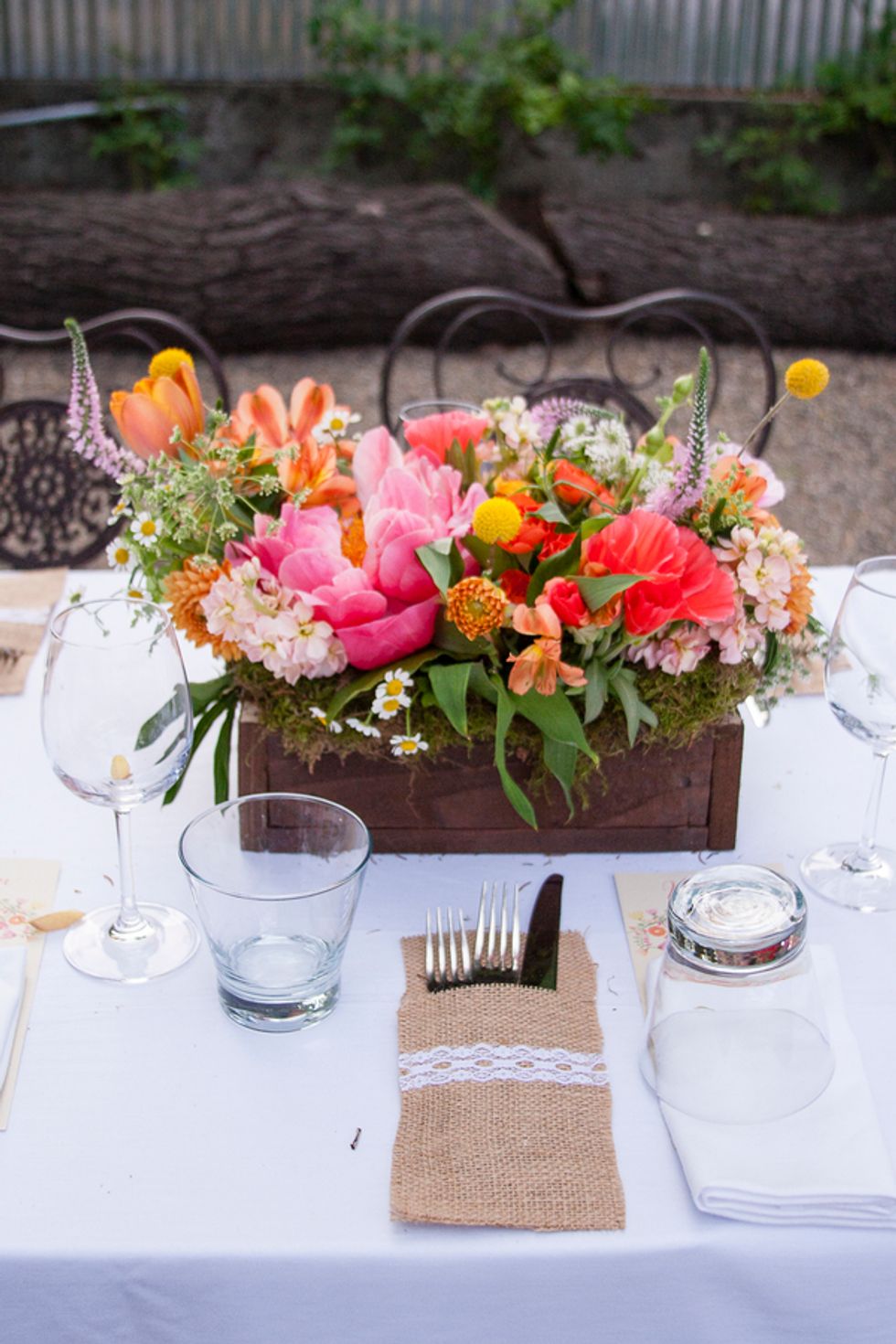 The entire wedding was an event to remember with brightly colorful flowers accenting the bride's lace gown and the champagne bridesmaids' dresses. The untraditional bride opted for sandals rather than heels, and a cupcake bar rather than a cake, but everything came together beautifully for a truly gorgeous celebration.