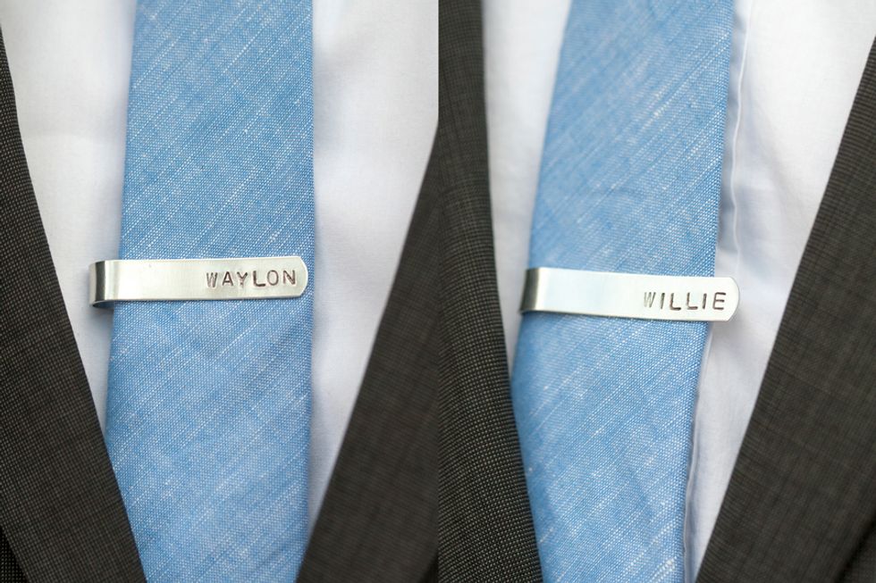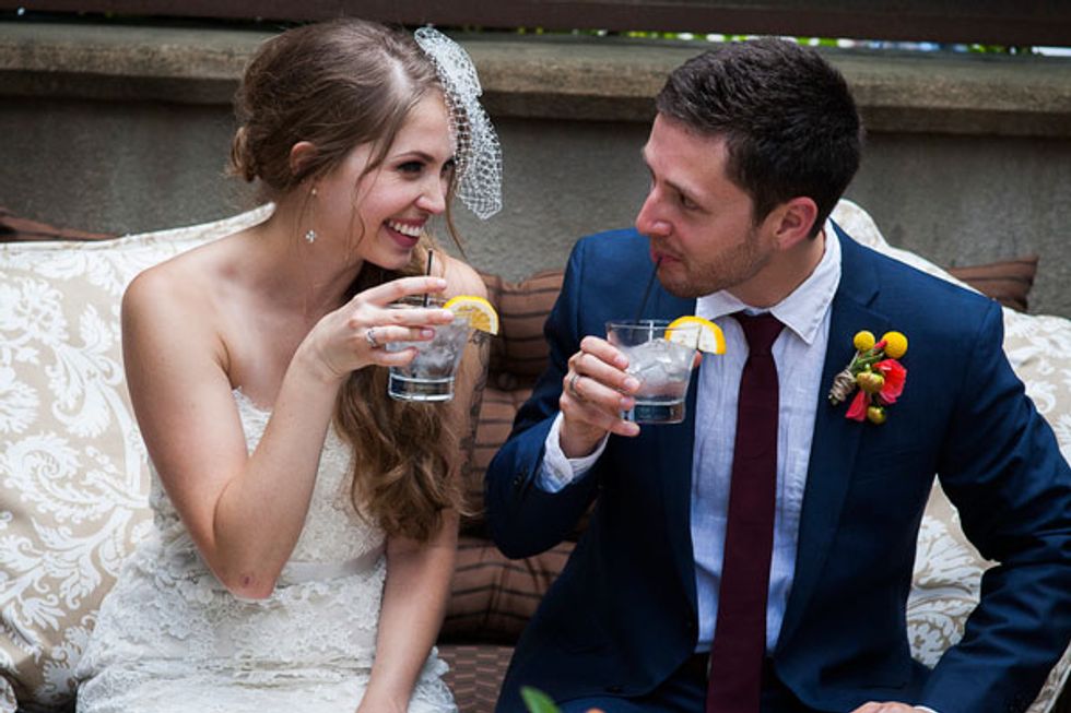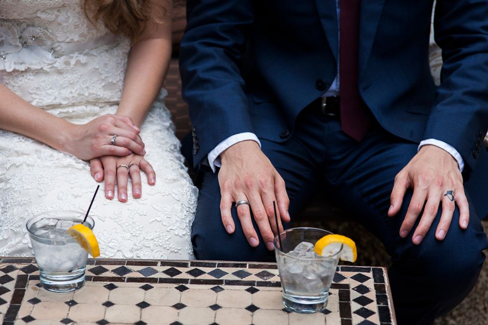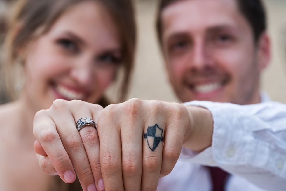 The couple chose tattoos, rather than rings, to represent their union, so on their wedding day they wrapped ribbons around their left ring fingers and untied them during the ceremony to reveal their newly inked wedding tattoos.