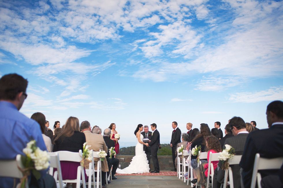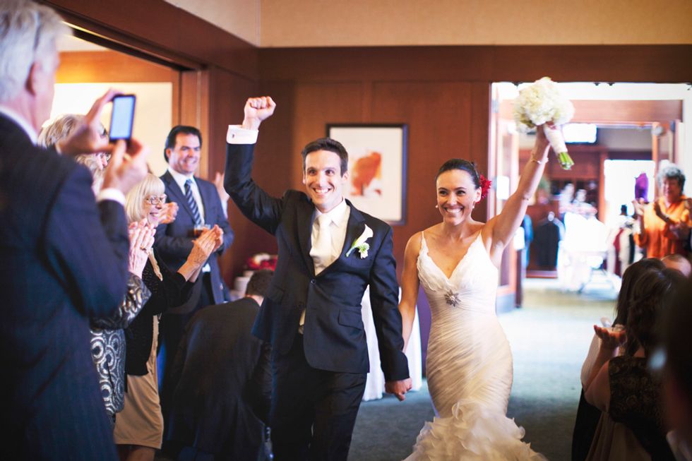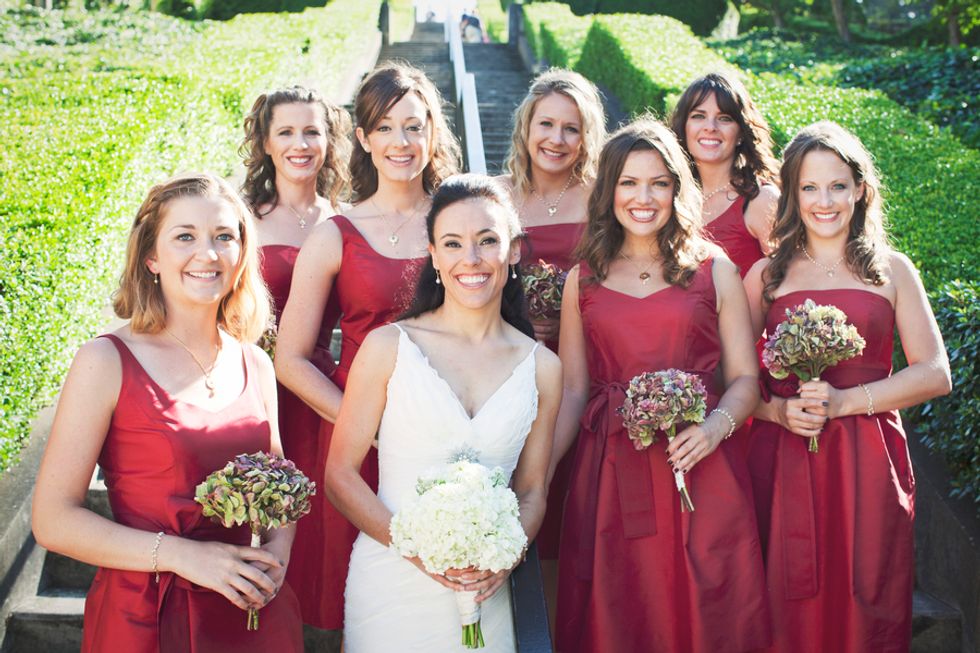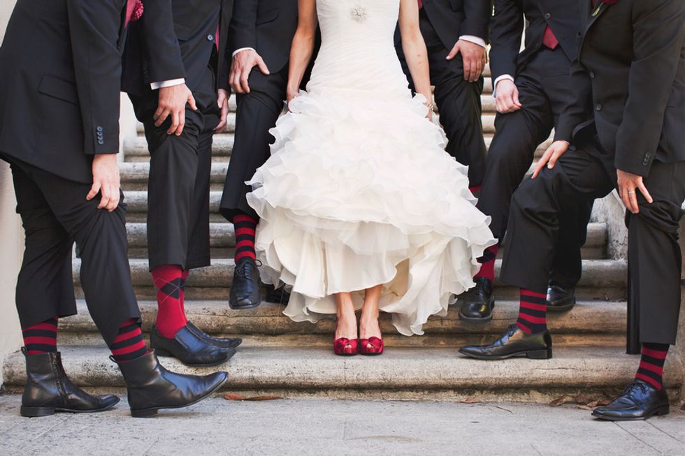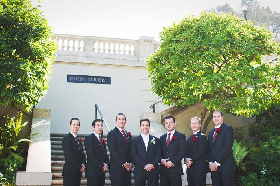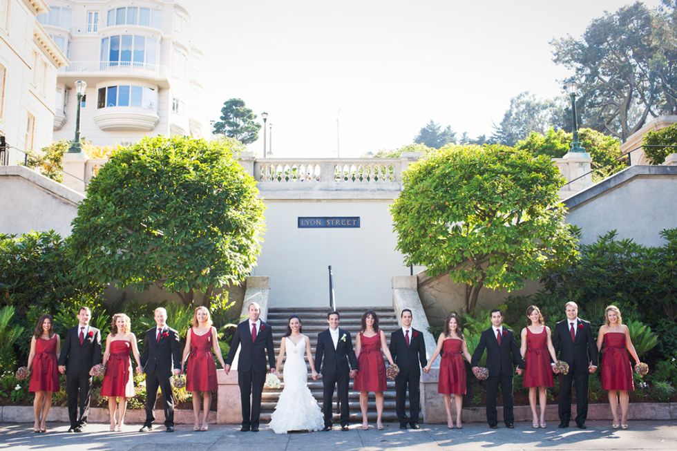 Alison used a rich red, black and white color palette, which she pulled together in a number of sweet details, such as the groomsmen socks, a signature cocktail, and her shoes which coordinated perfectly with her bridesmaids' dresses. The city of San Francisco was also an important part of their day as guests were treated to gorgeous views from Inspiration Point. It's where Alison and Bryan met and started their relationship so having such a quintessential San Francisco wedding seemed fitting.