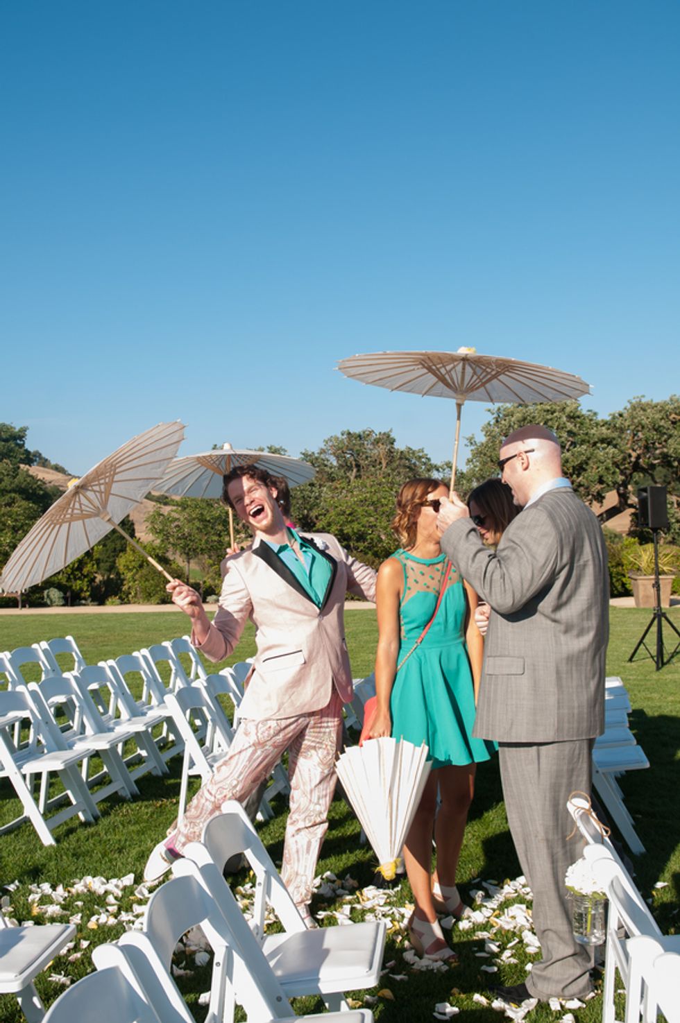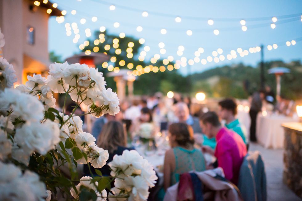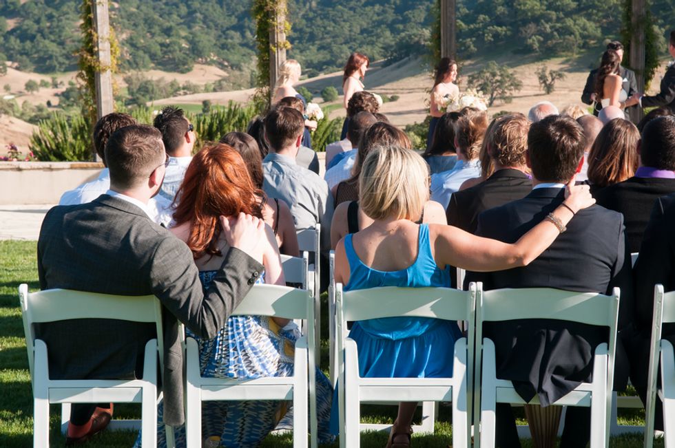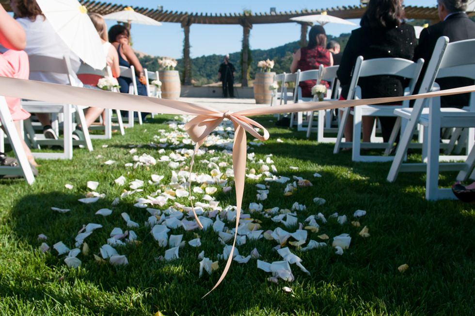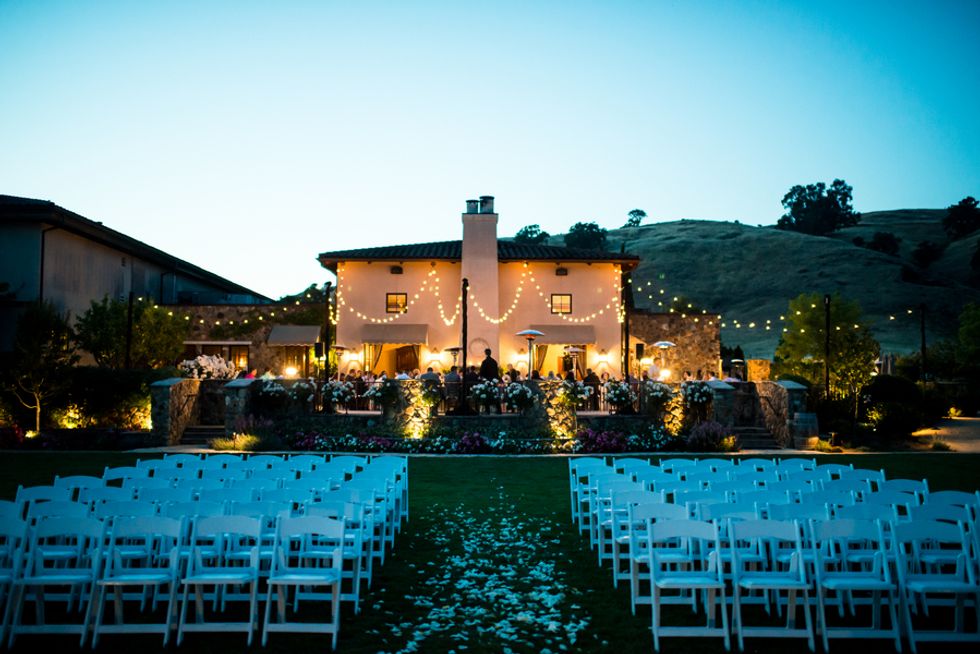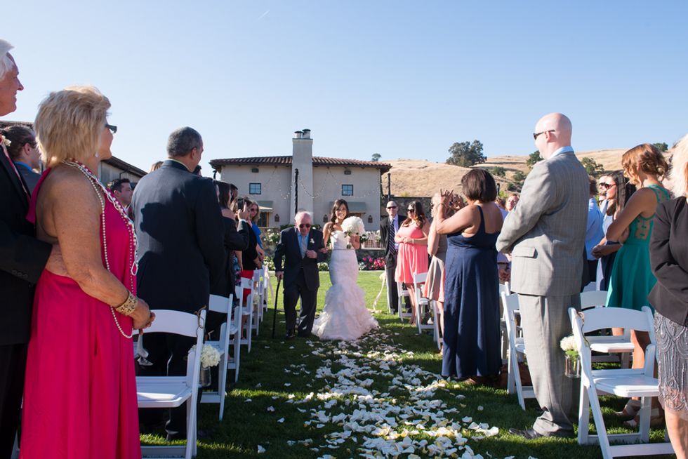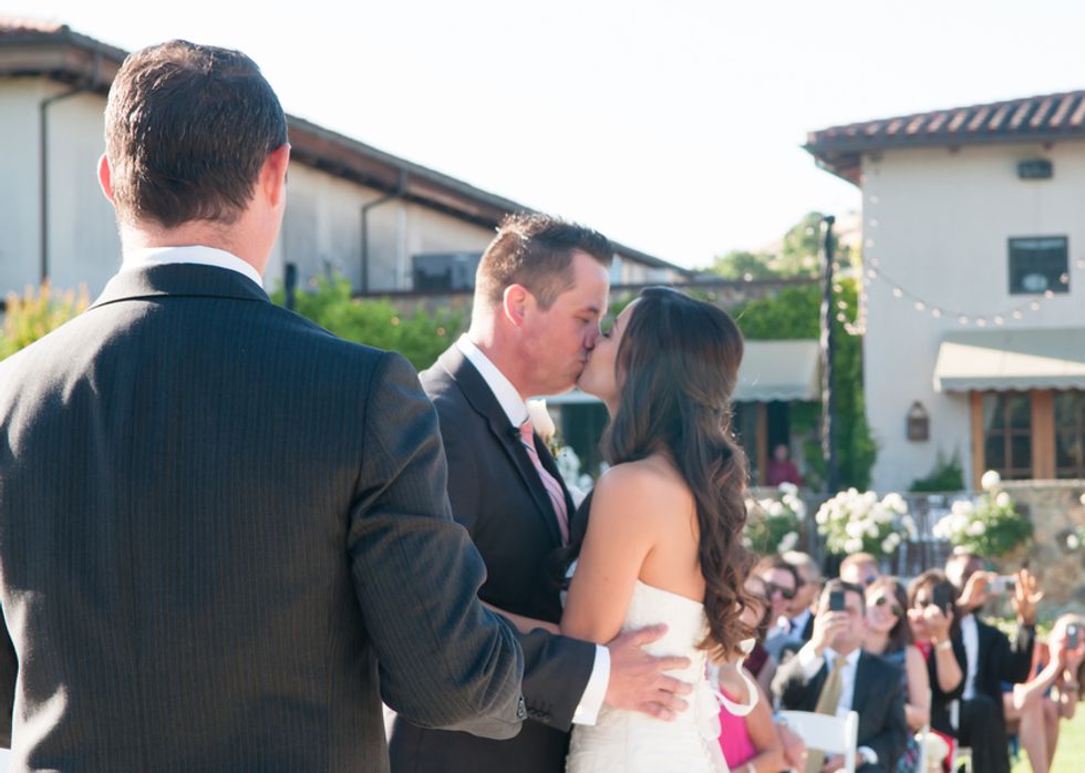 The venue of choice was a lovely mix of rustic and modern, with a vineyard serving as the backdrop. The ceremony took place outdoors, and once the couple tied the knot, guests headed inside for a catered dinner in the main building of the family-owned winery Clos La Chance. Everything was adorned with navy and peach.