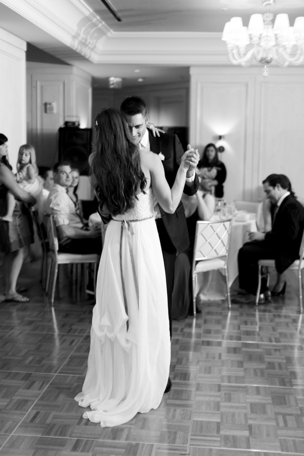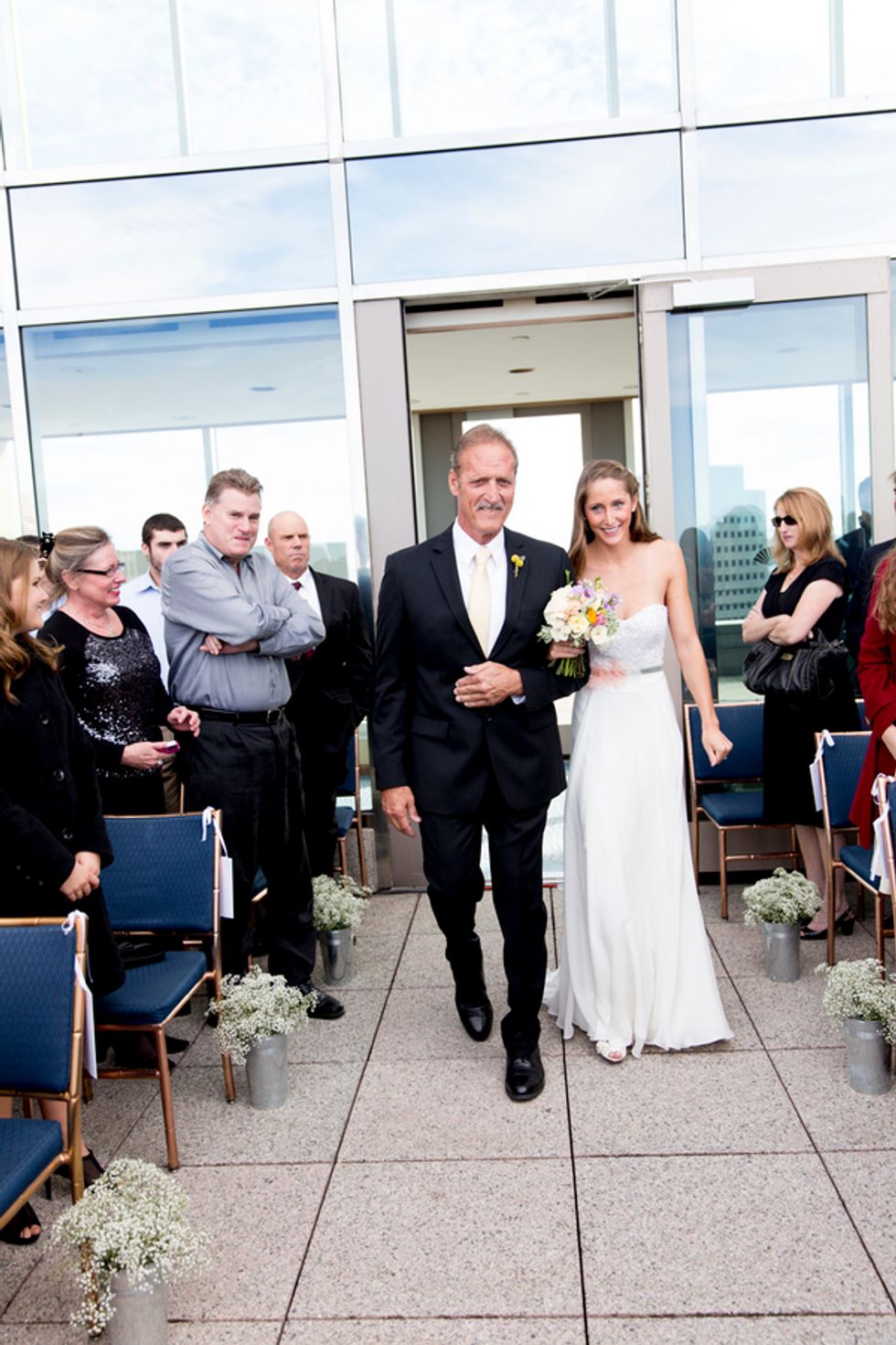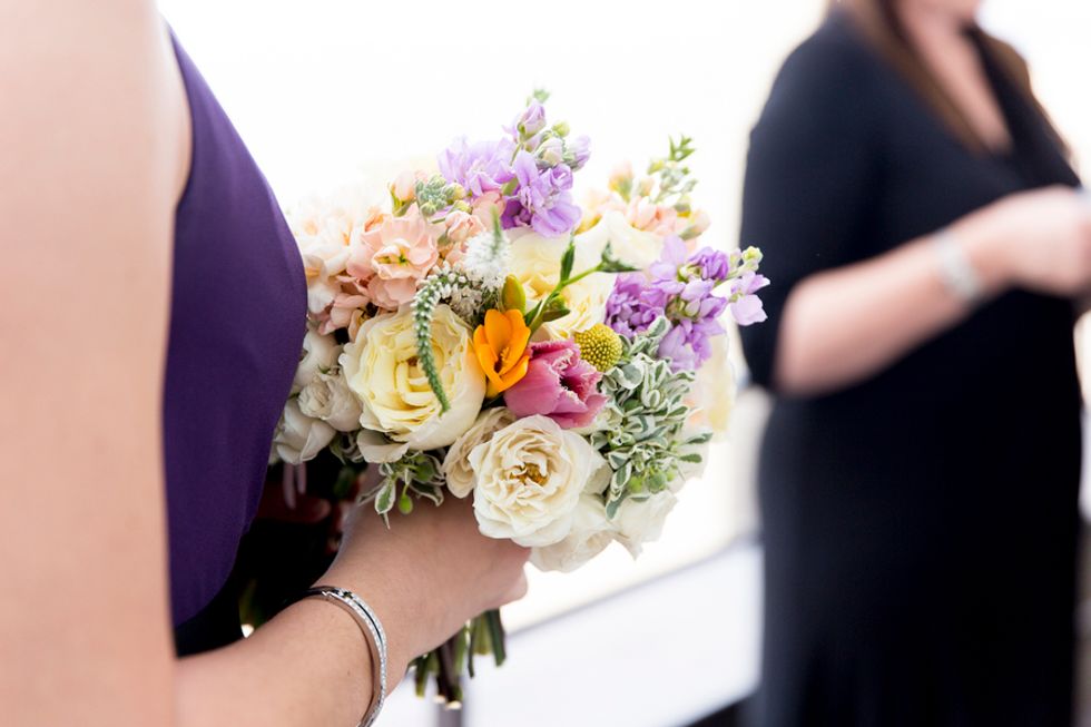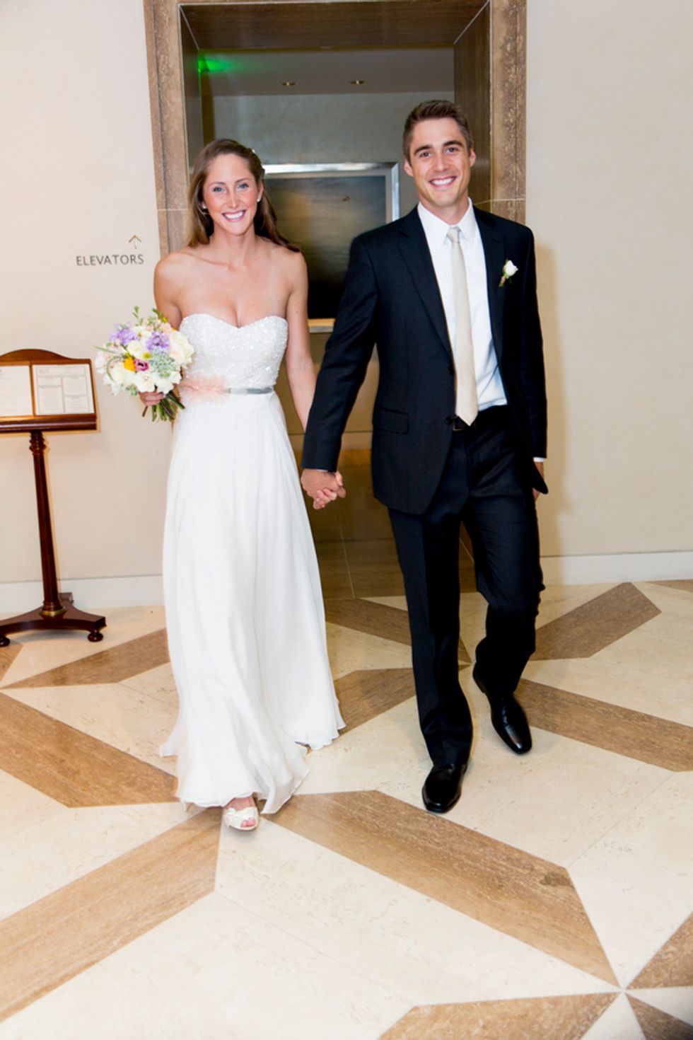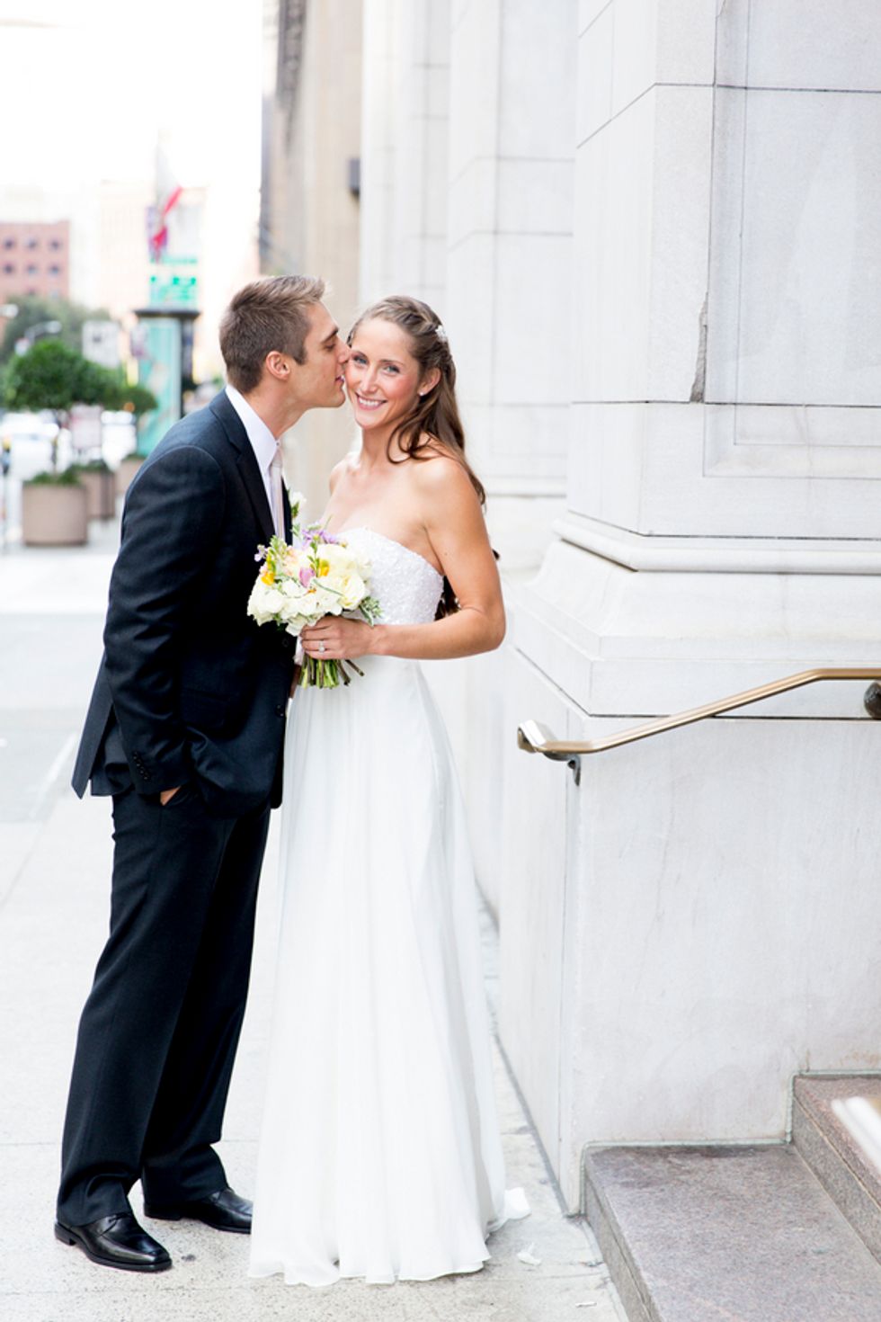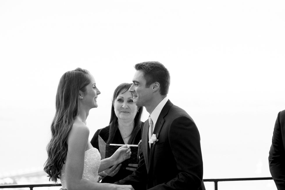 The ceremony took place on the 24th floor of the Oriental Hotel, where guests enjoyed views of the city skyline. Before heading to the reception, the newlyweds strolled, hand-in-hand, through the Financial District, and hopped on a streetcar for the sweetest photo-op.