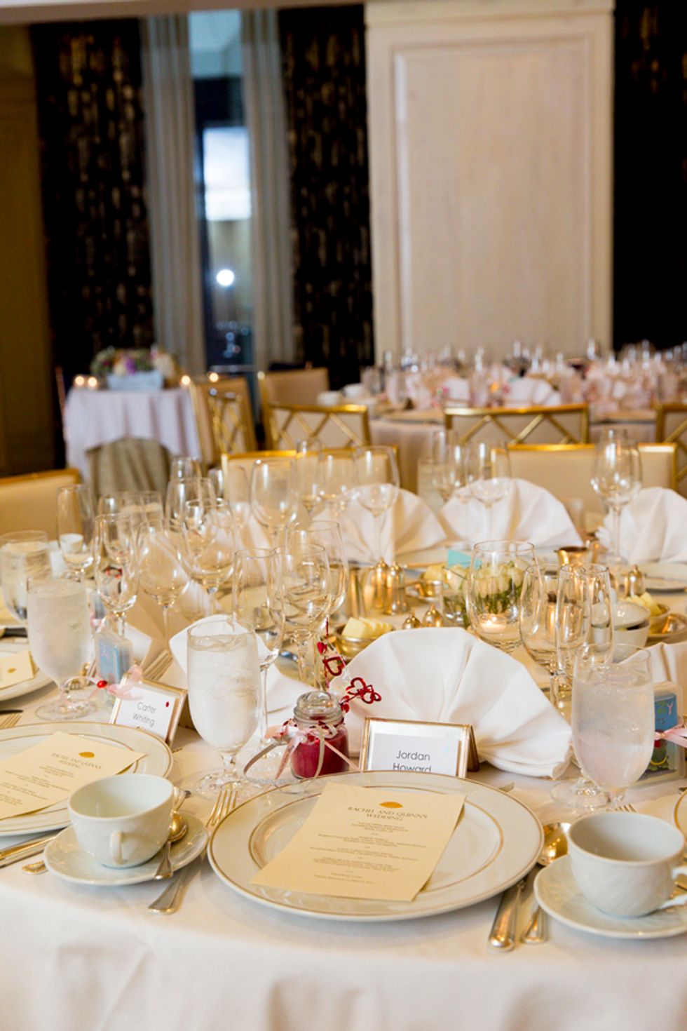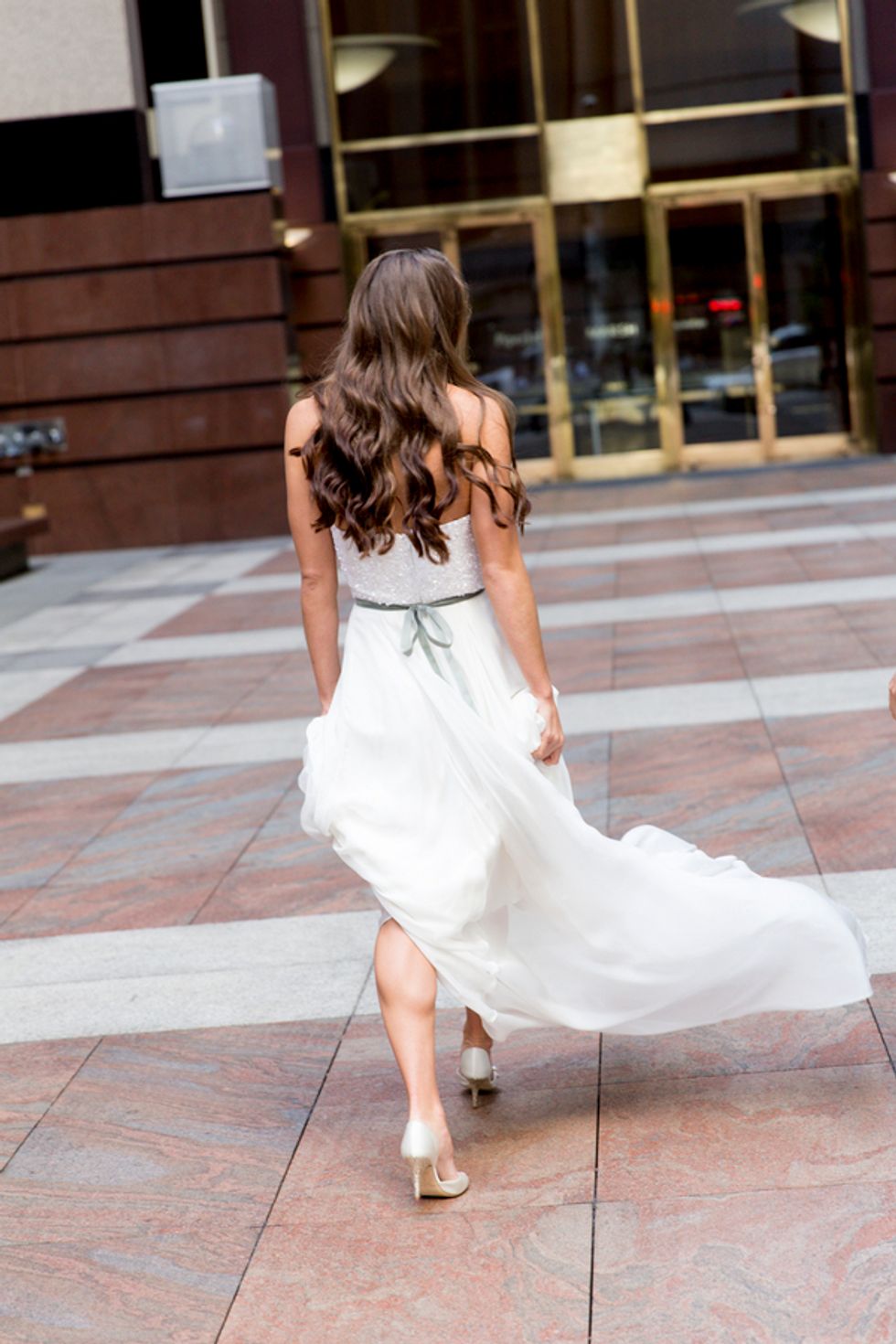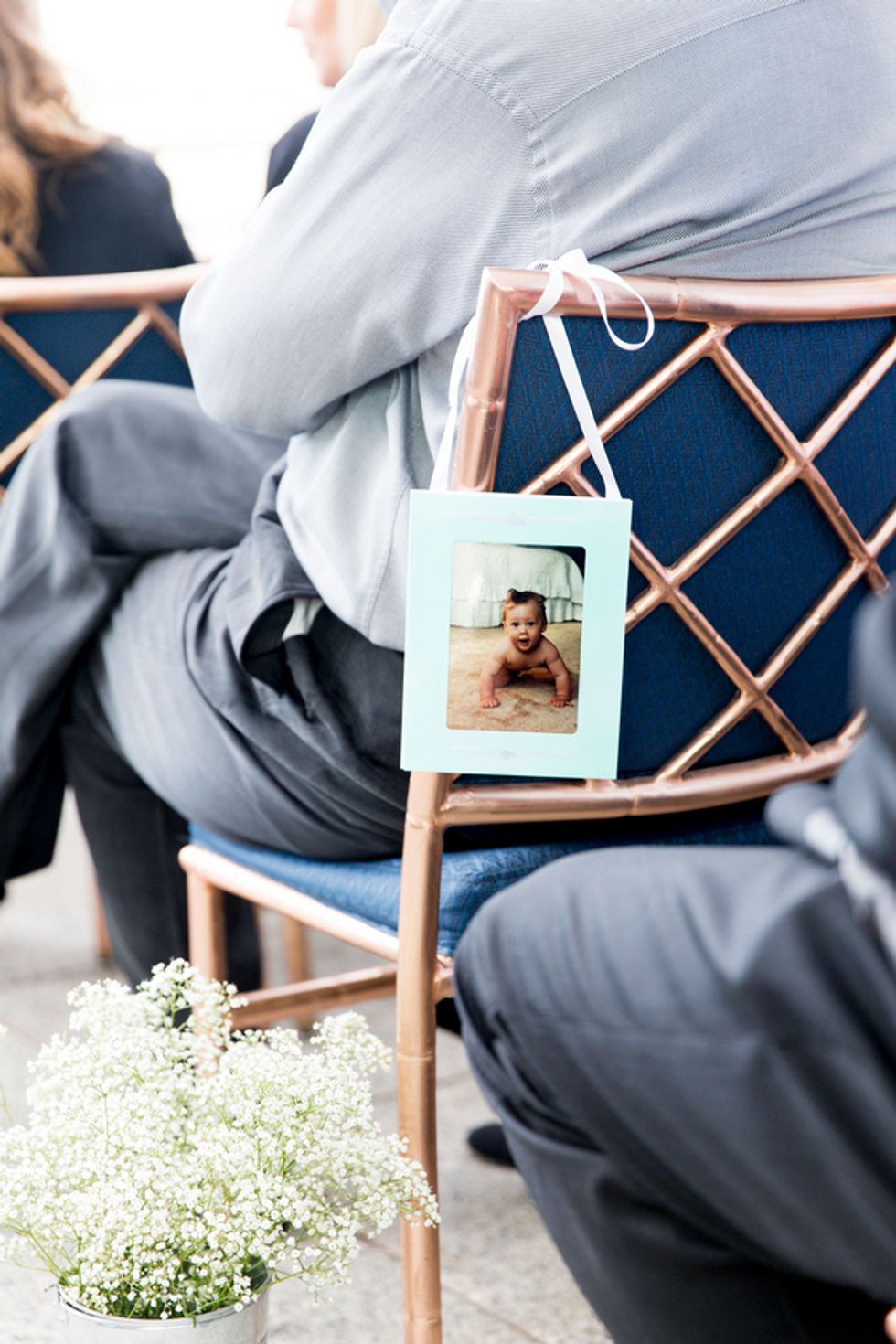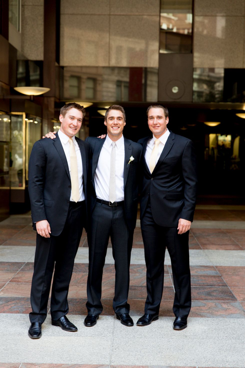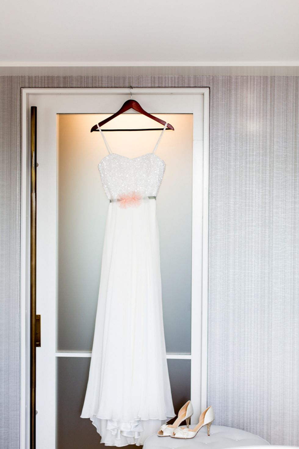 The ceremony took place on the 24th floor of the Oriental Hotel, where guests enjoyed views of the city skyline. Before heading to the reception, the newlyweds strolled, hand-in-hand, through the Financial District, and hopped on a streetcar for the sweetest photo-op.