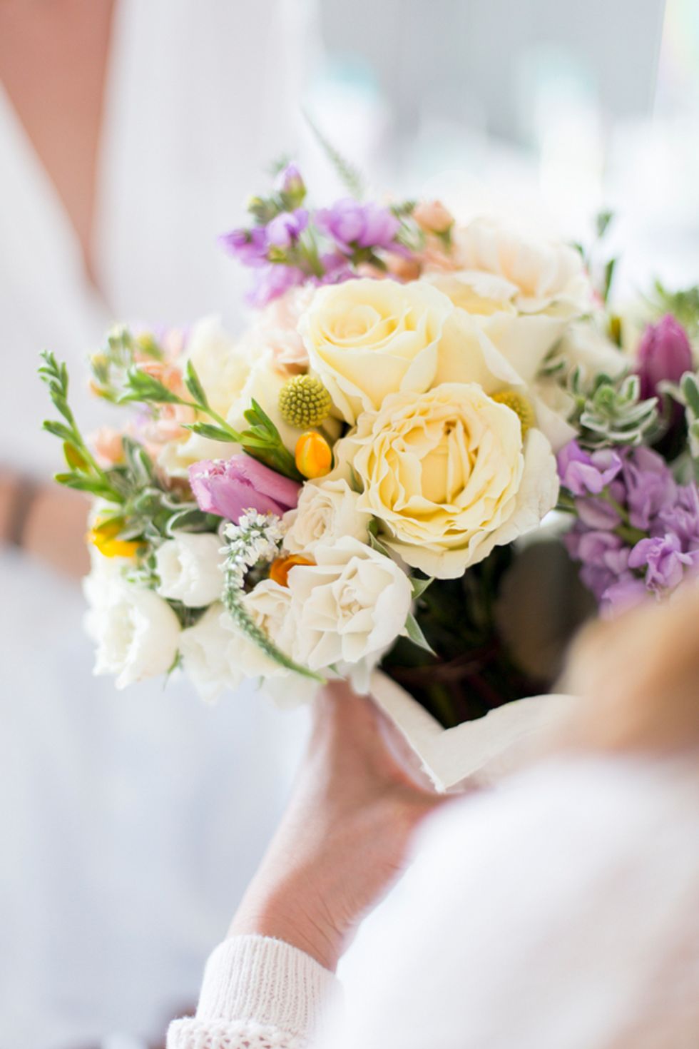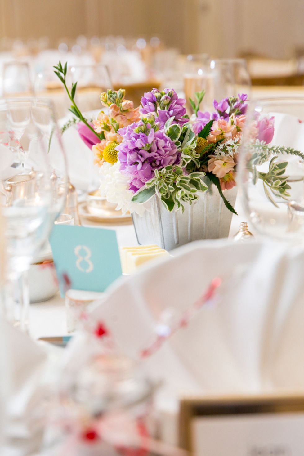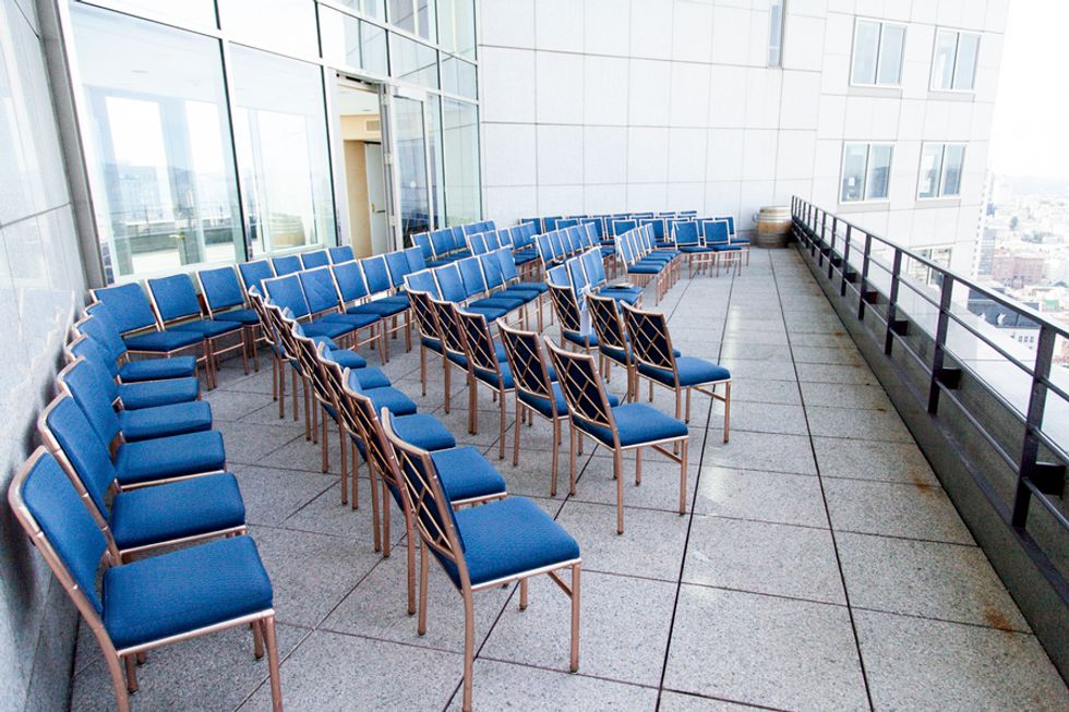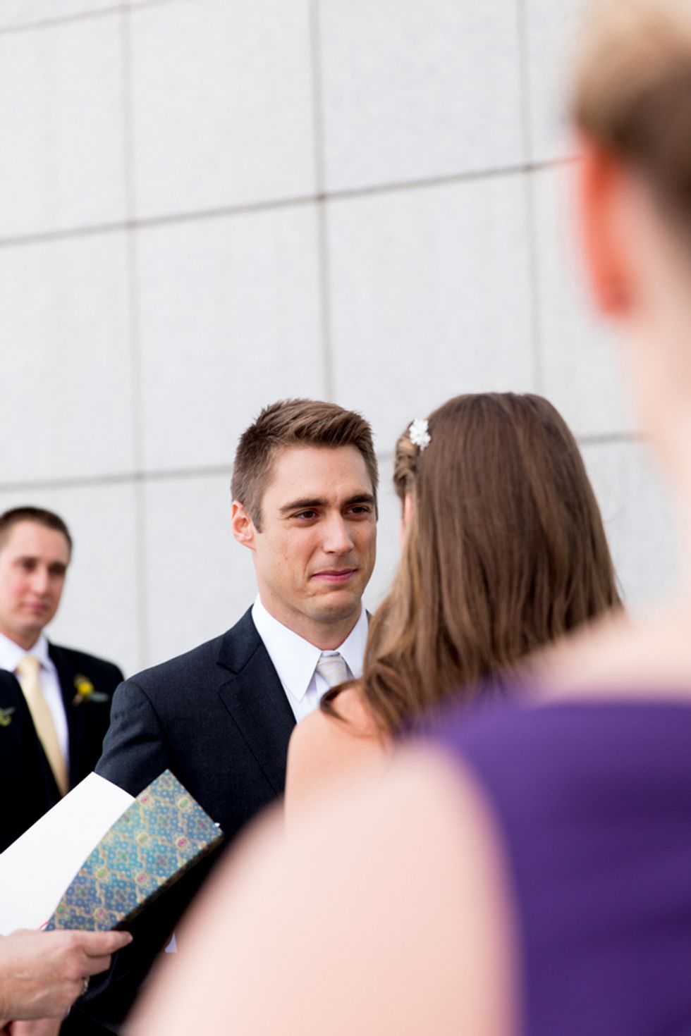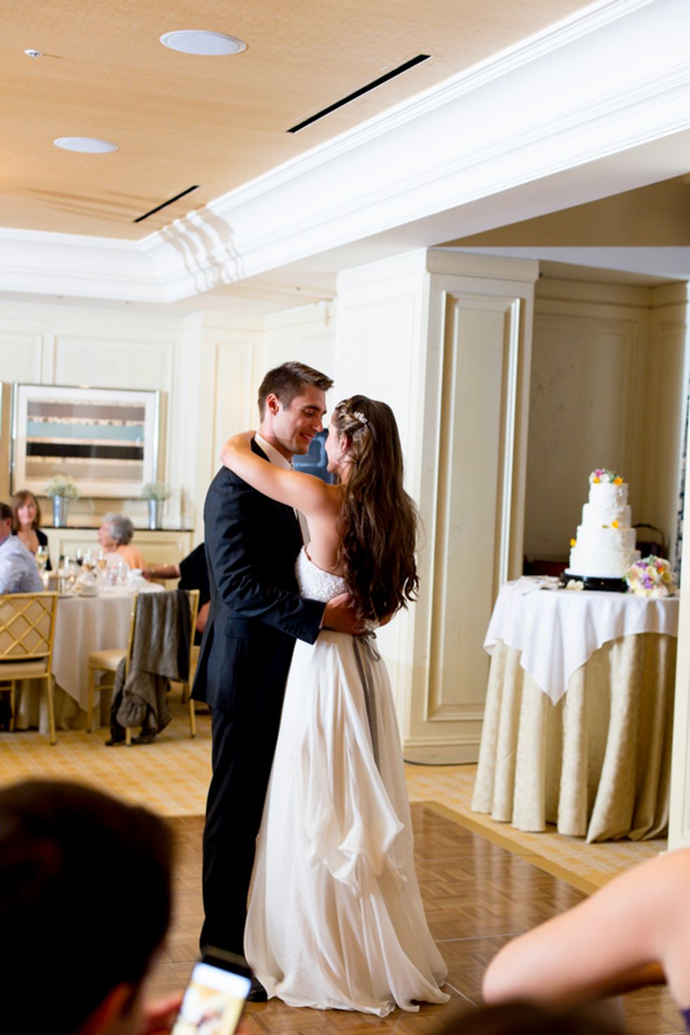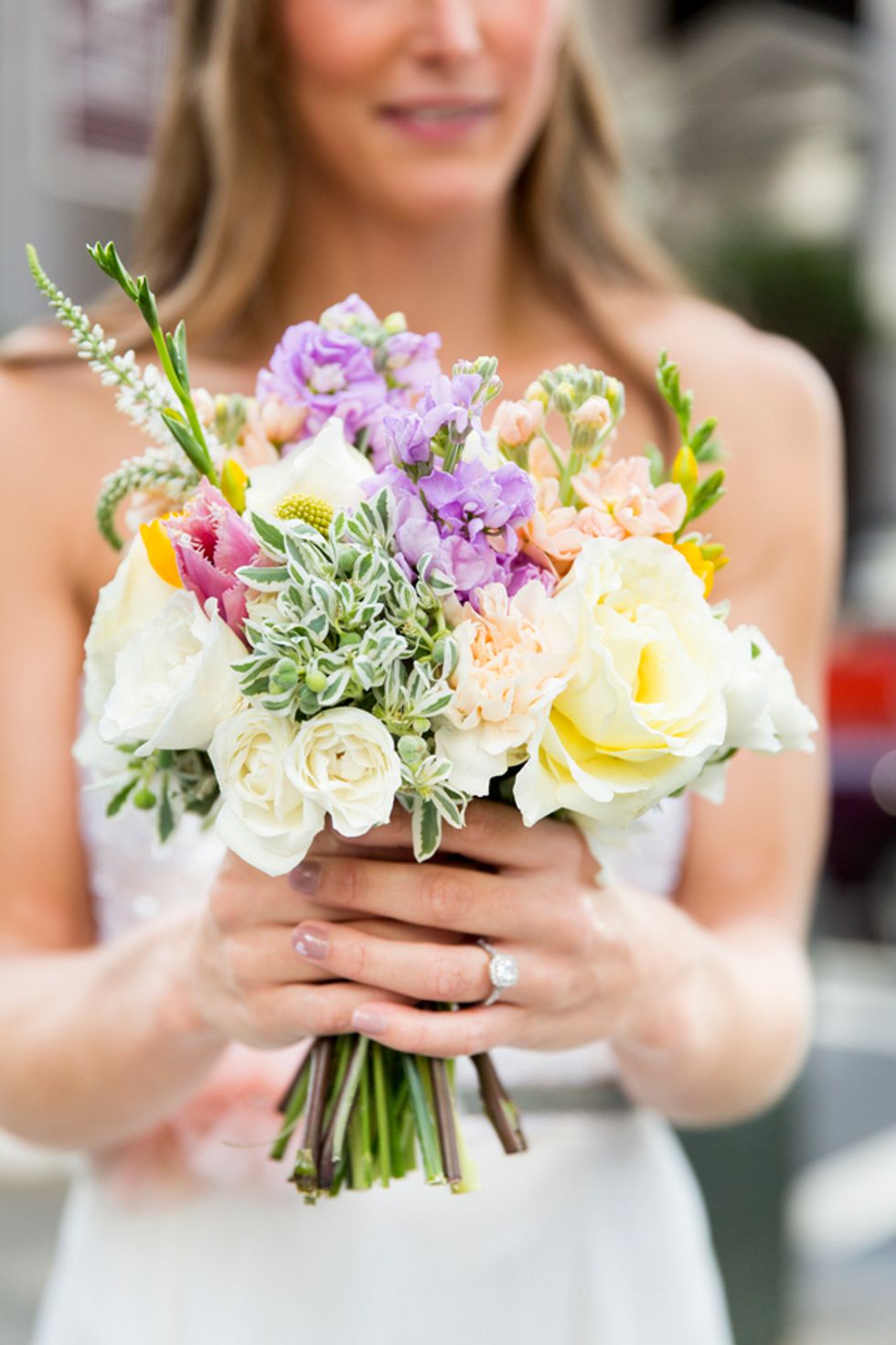 The ceremony took place on the 24th floor of the Oriental Hotel, where guests enjoyed views of the city skyline. Before heading to the reception, the newlyweds strolled, hand-in-hand, through the Financial District, and hopped on a streetcar for the sweetest photo-op.