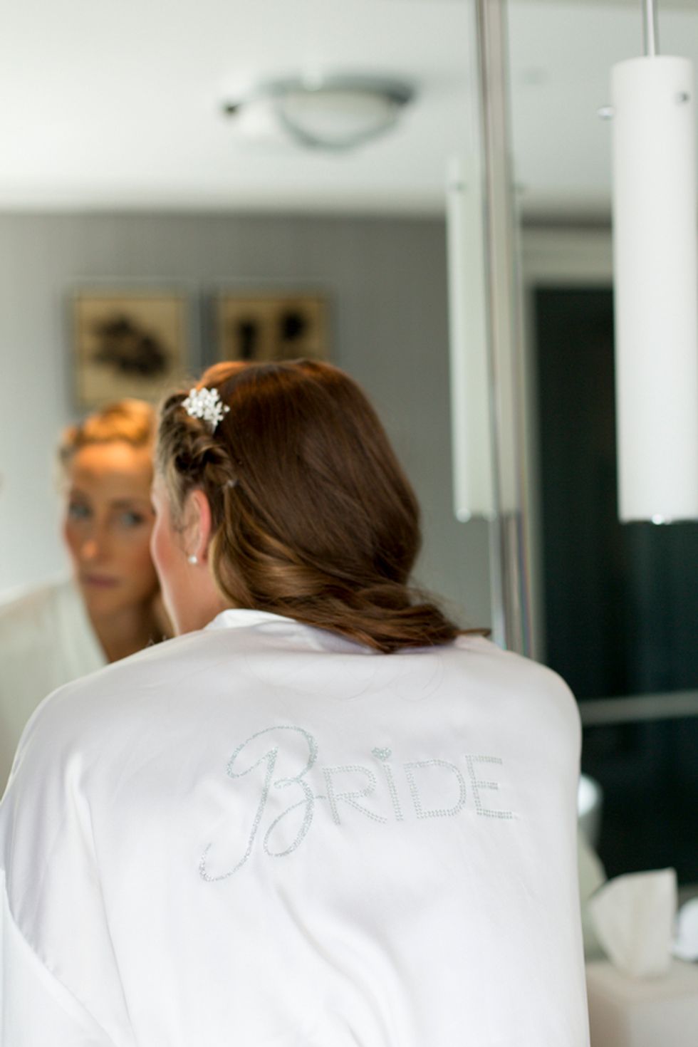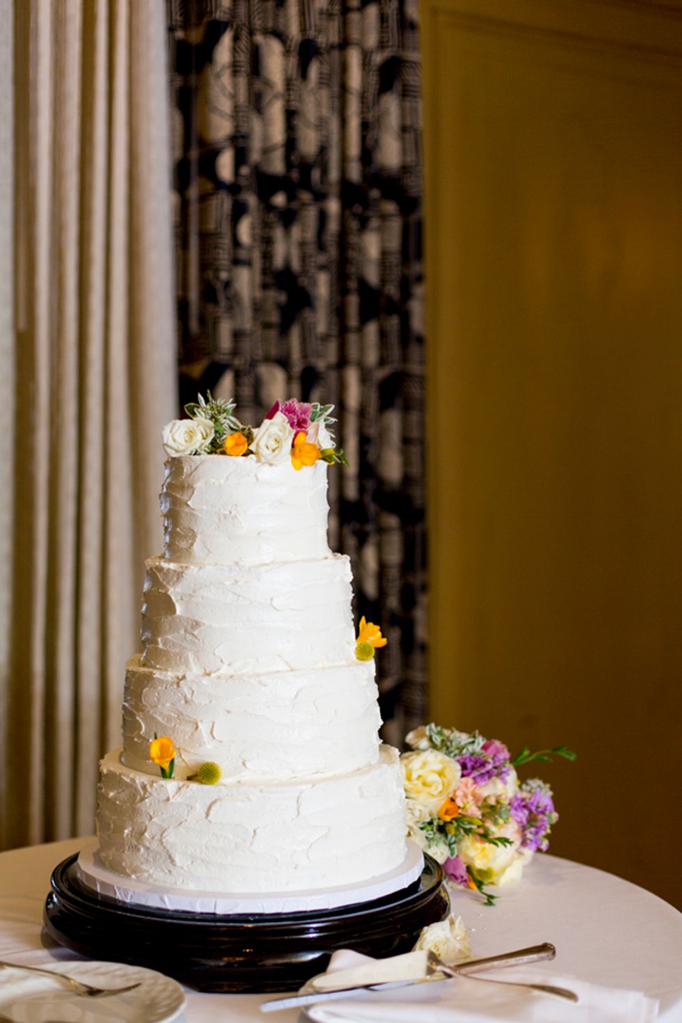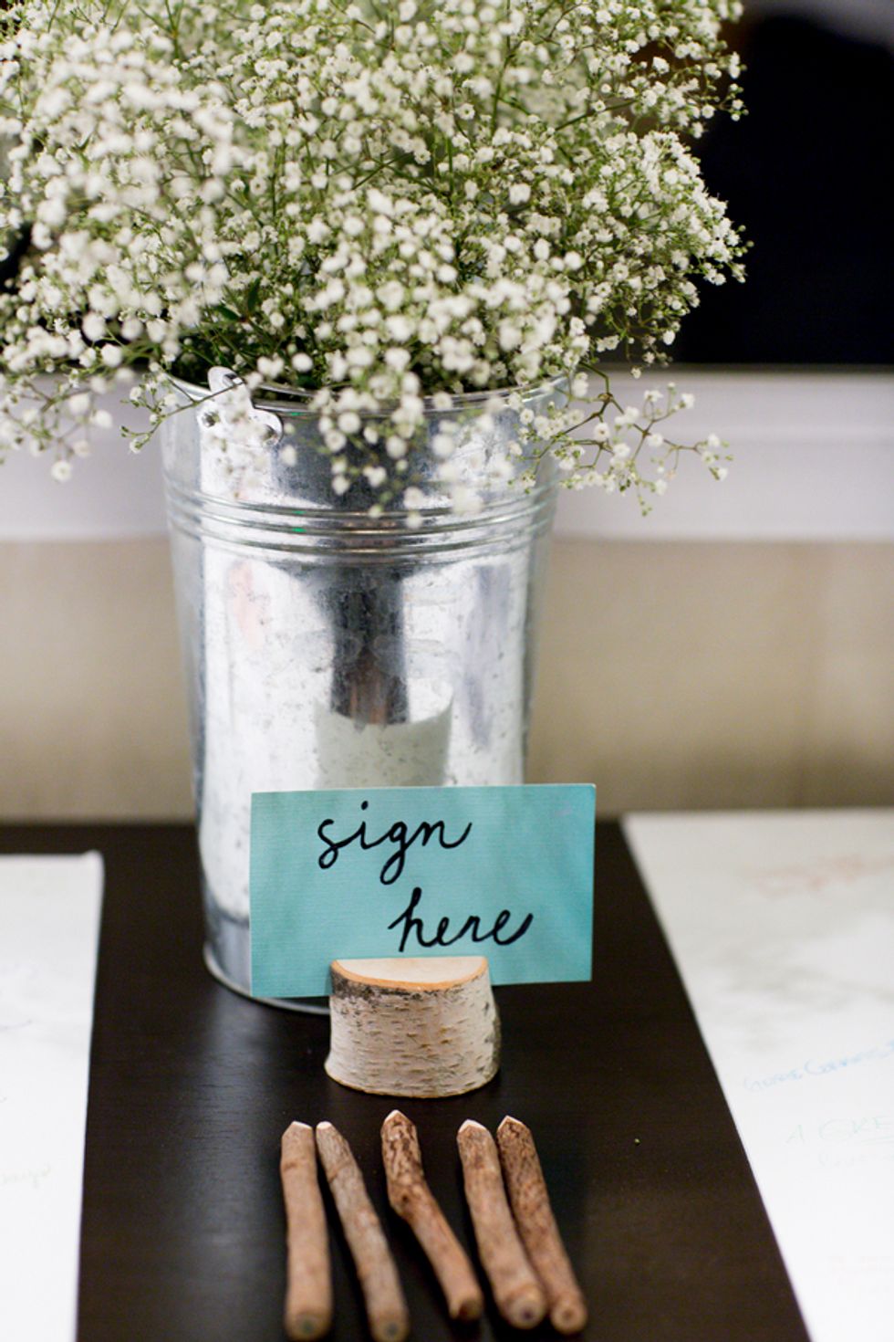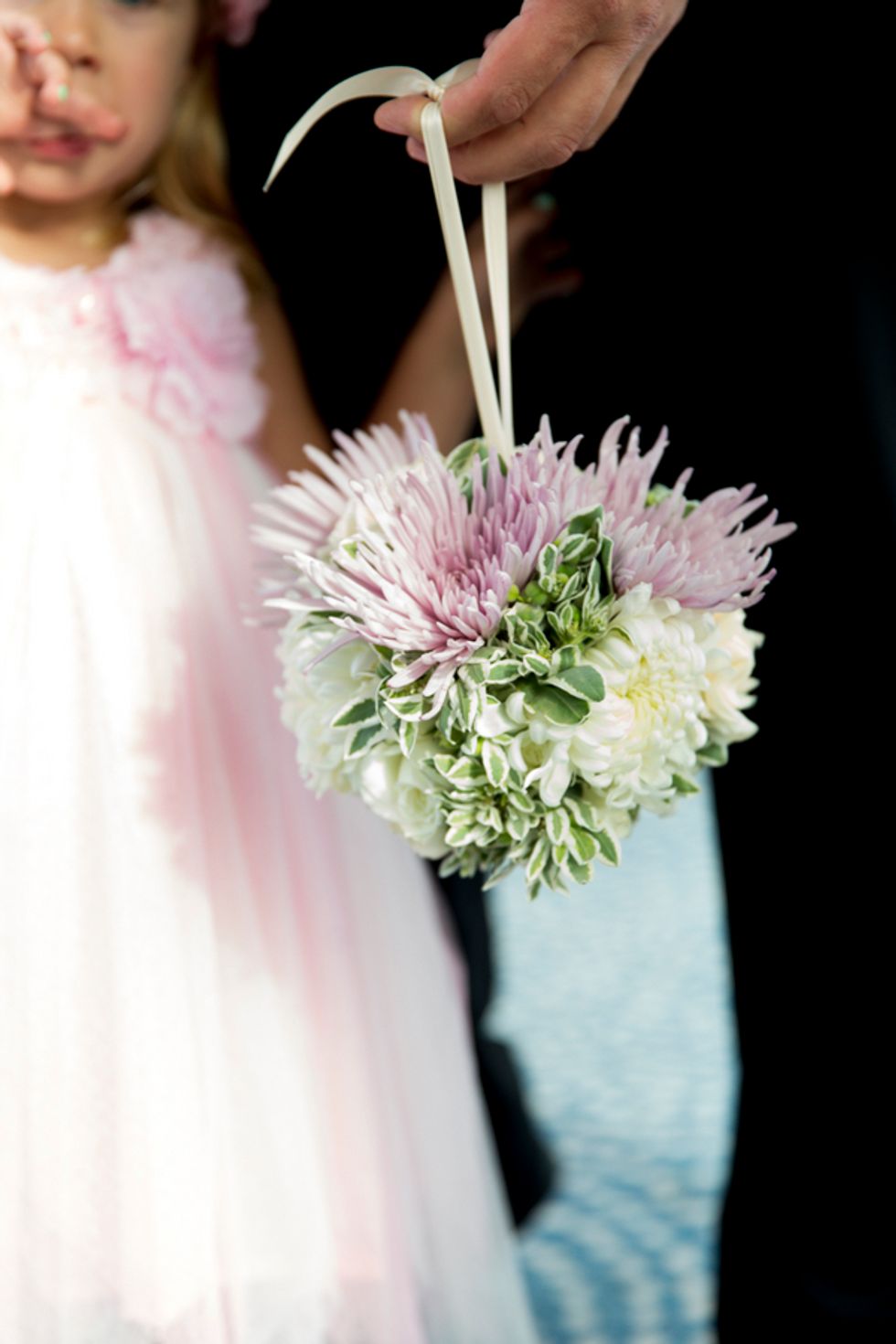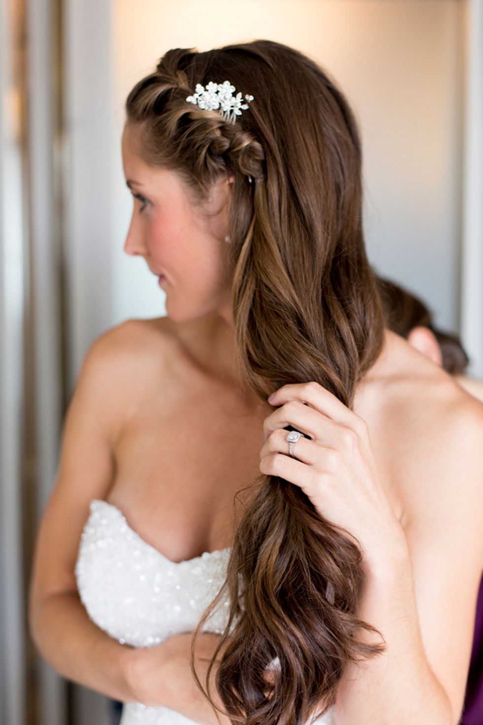 The ceremony took place on the 24th floor of the Oriental Hotel, where guests enjoyed views of the city skyline. Before heading to the reception, the newlyweds strolled, hand-in-hand, through the Financial District, and hopped on a streetcar for the sweetest photo-op.