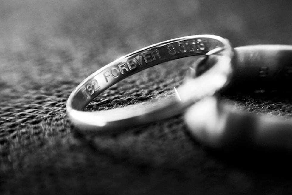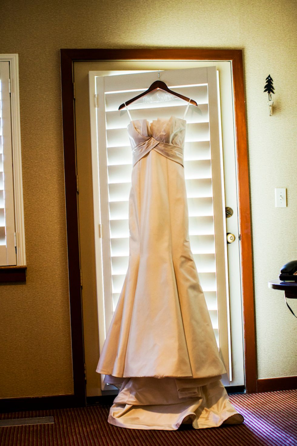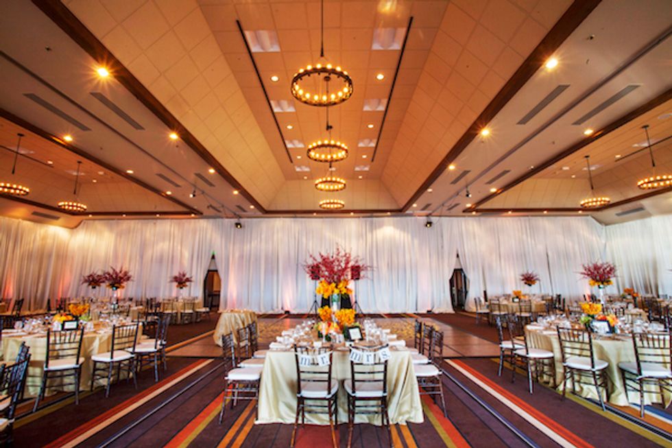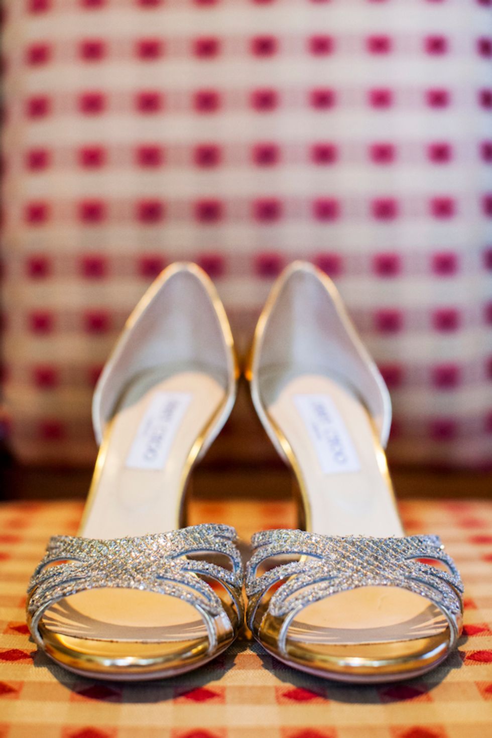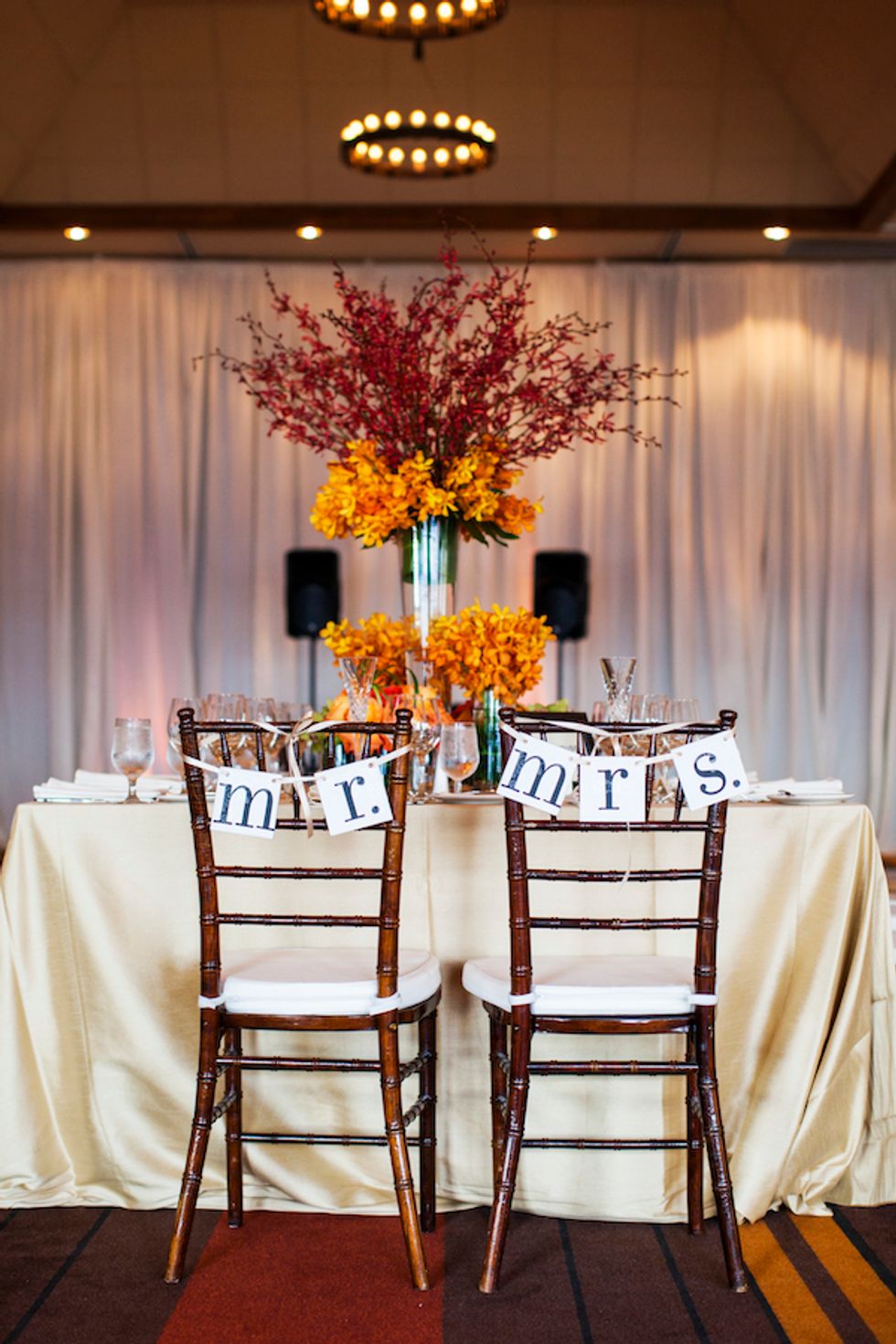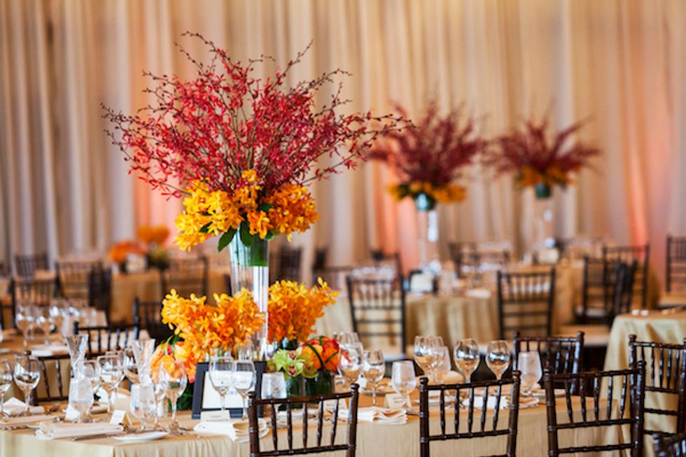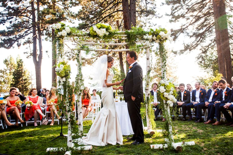 The bold autumn wedding colors jibed with the natural fauna nicely as the couple got married outside under a quaint wooden arch. Tess glided down the aisle in Jimmy Choo shoes and the pair exchanged custom rings engraved with the word “forever” and their wedding date.
