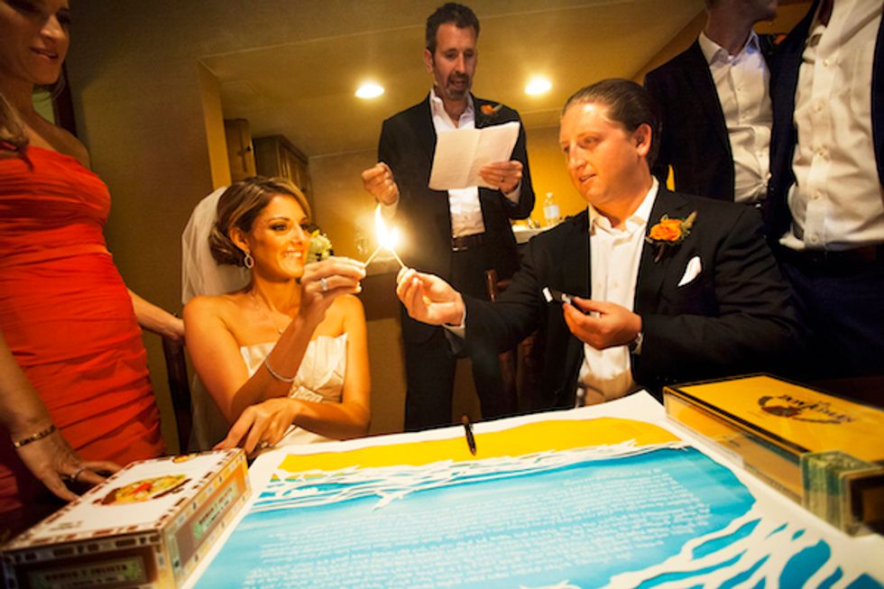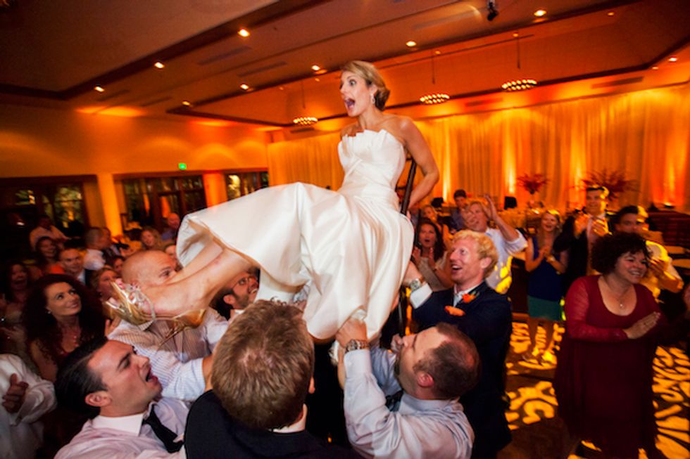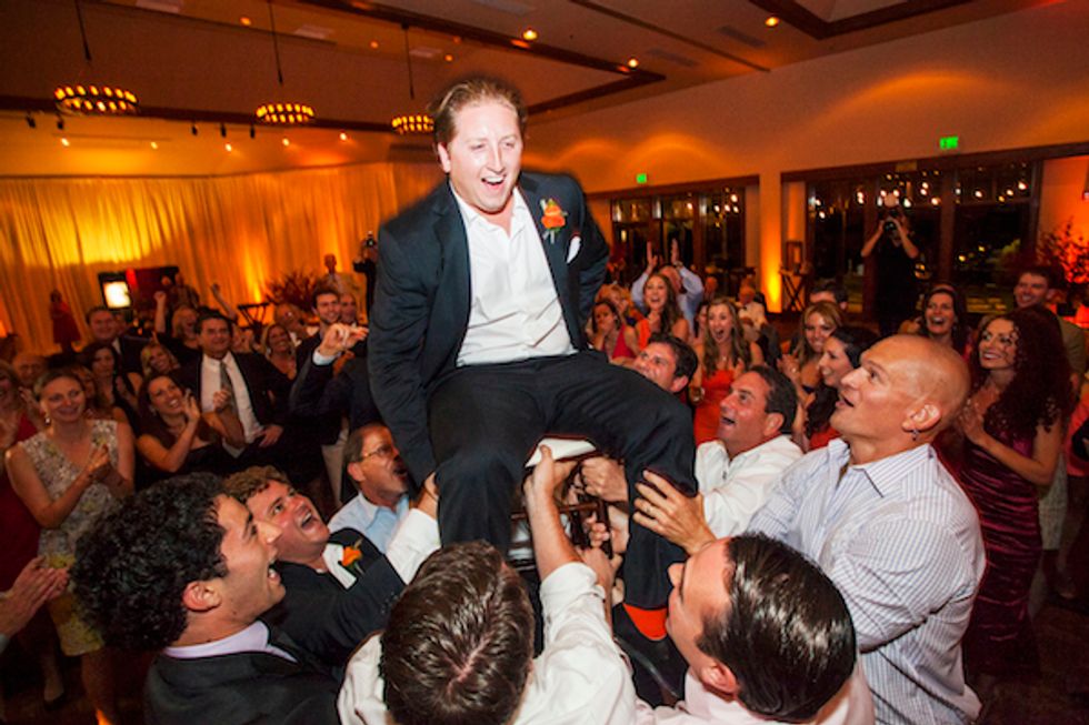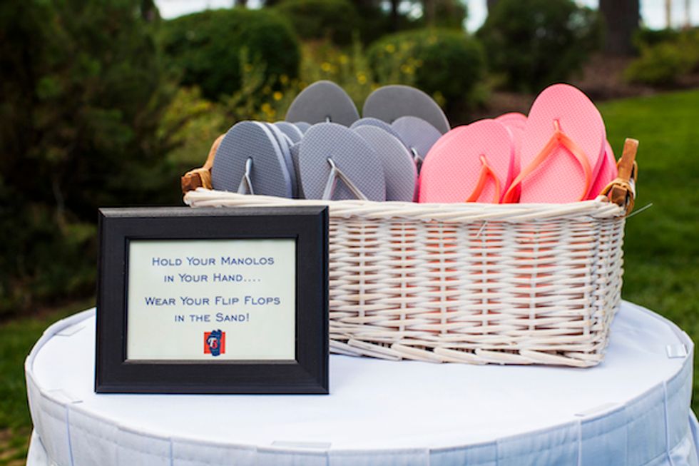 After the ceremony, the newlyweds provided flip-flops for the guests to have fun on the beach. The reception included a five-course meal, a photo booth ,and the traditional Hora dance atop chairs. Towards the end of the night, the bride changed into a slinky short number and the couple danced the night away.