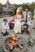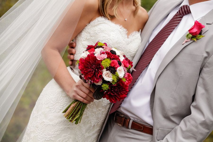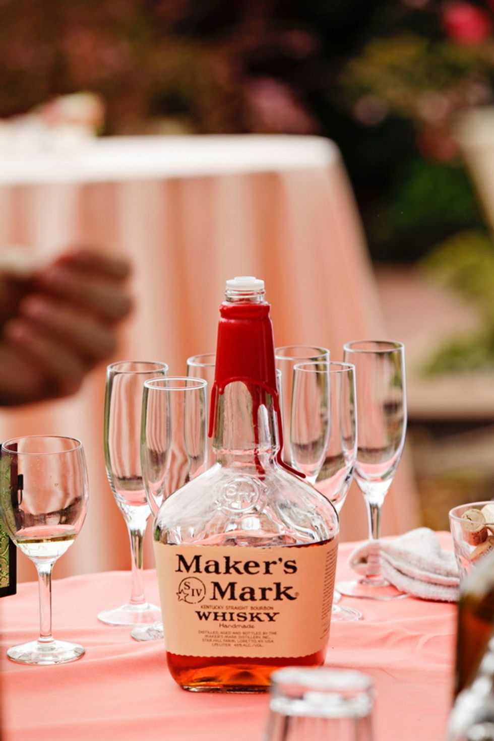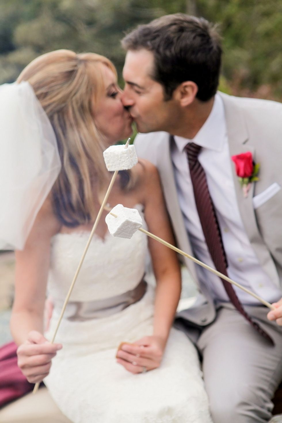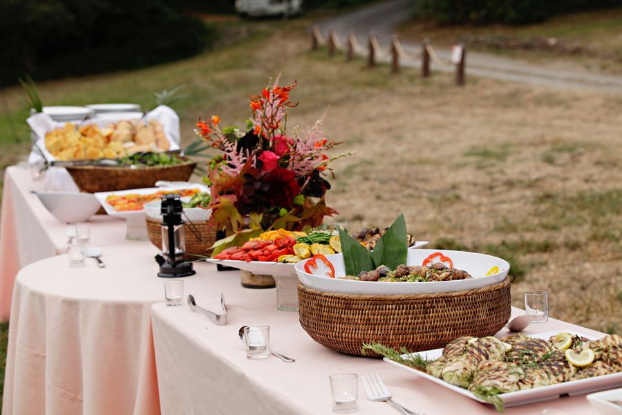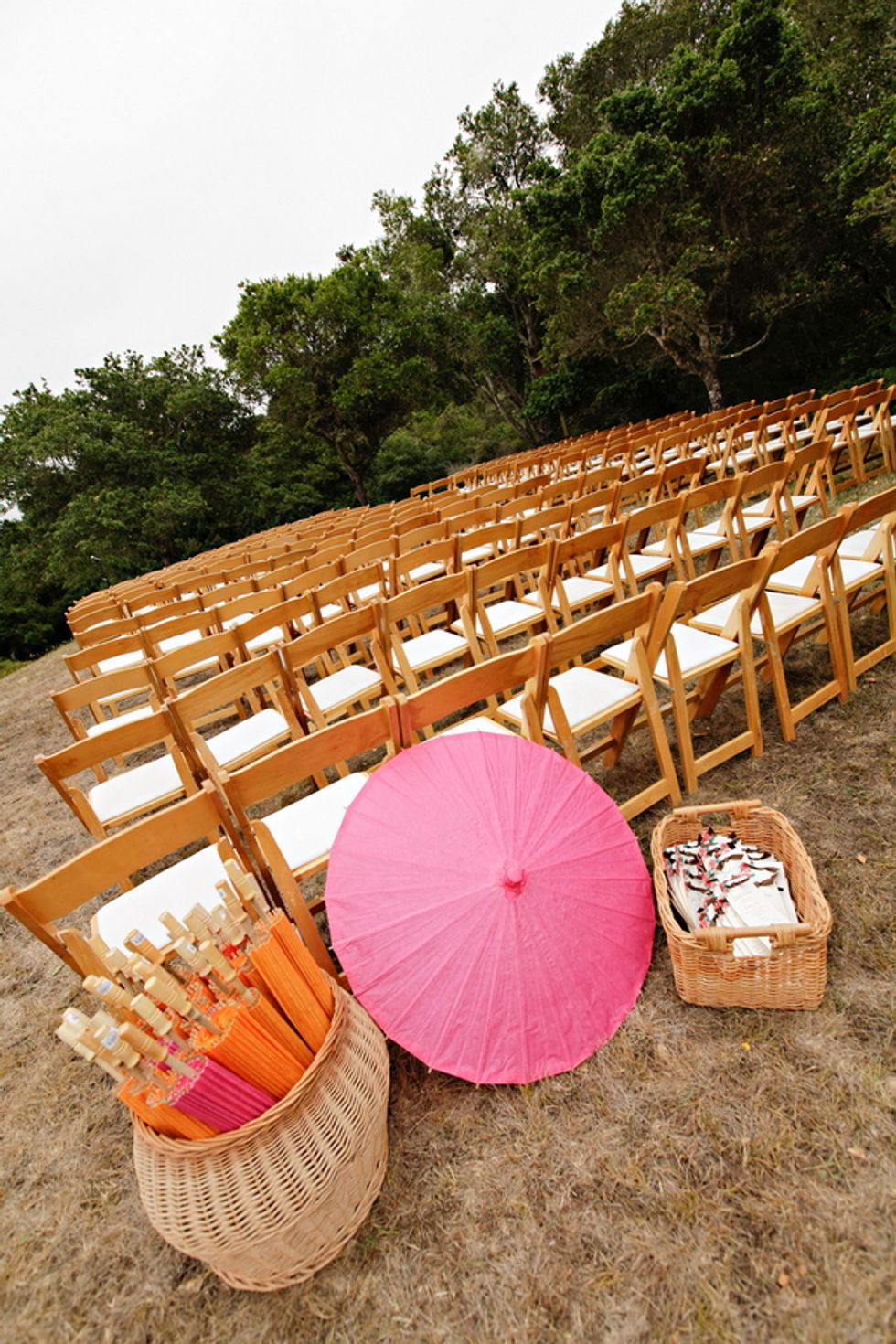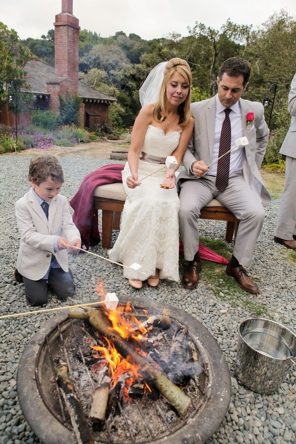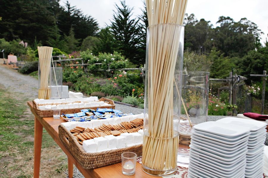The stylish wedding featured autumn colors, simple and elegant farm tables, and a gourmet buffet dinner. Guests were provided with brightly colored parasols and warm blankets for the unpredictable Bay Area weather. Dinner was followed by a do-it-yourself dessert bar where guests were encouraged to toast their own s’mores around the campfire and then dance the night away with a bottle of whiskey on every table.