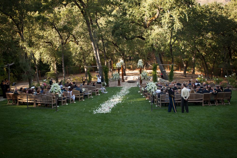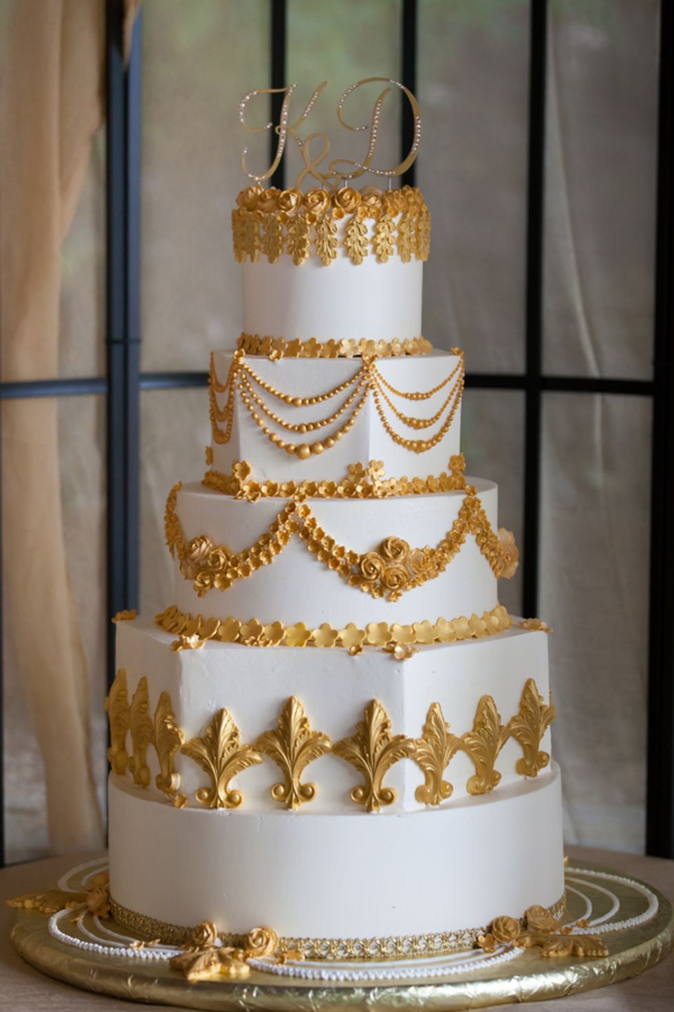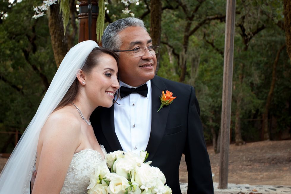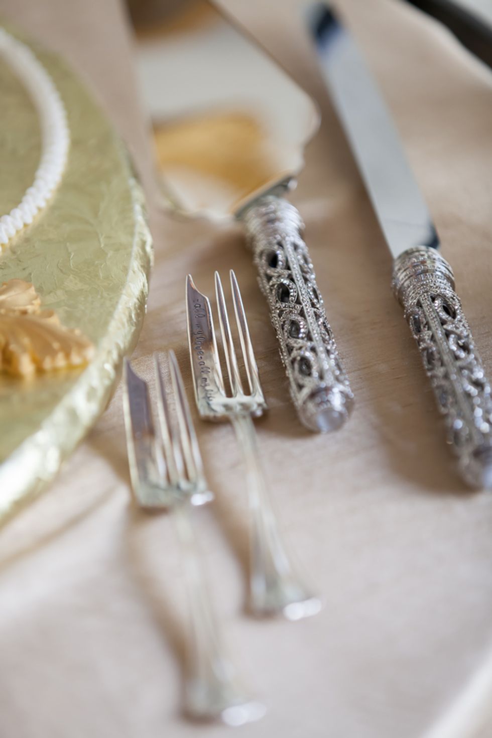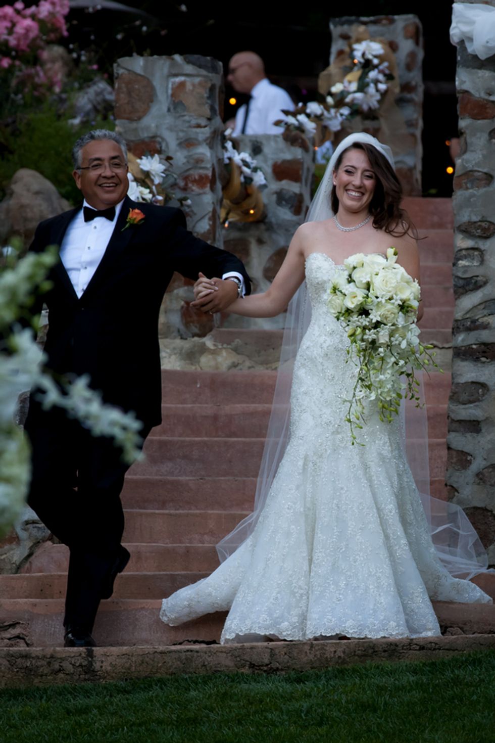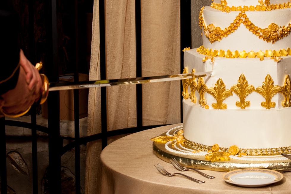 Luckily, Dana's father owns the venue, so the bride had full reign to turn Creekside Terrace in Los Gatos into a mini-Versailles. Spanish stars and chandeliers lit up the Redwoods with a luxurious glow while personalized silverware engraved with promises and golden goblets glittered in the candlelight. Tiara-shaped paperweights kept place markers from flying away. In keeping with the luxe color scheme, the cake was four layers of hand-piped roses, fleurs de lis, and pearls in gold icing that sat underneath a veiled birdcage until it was time.