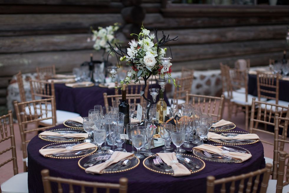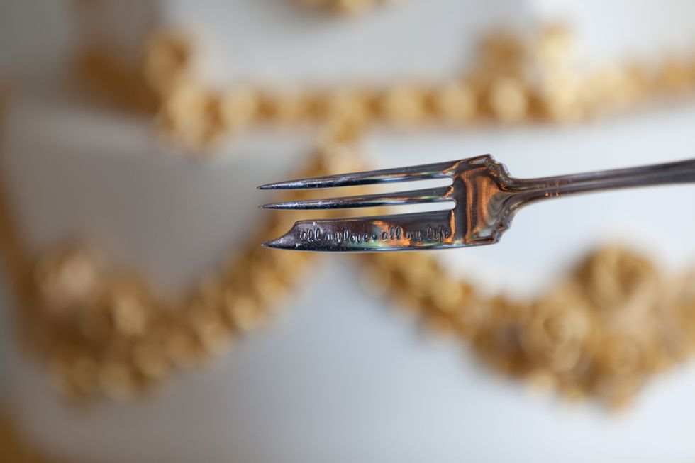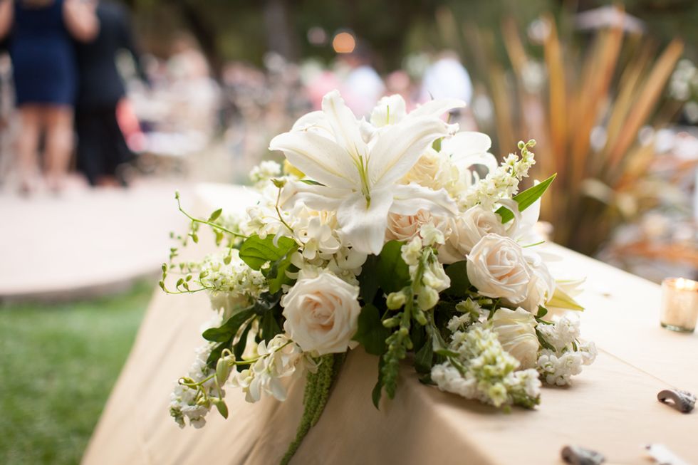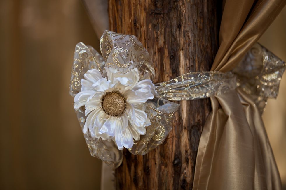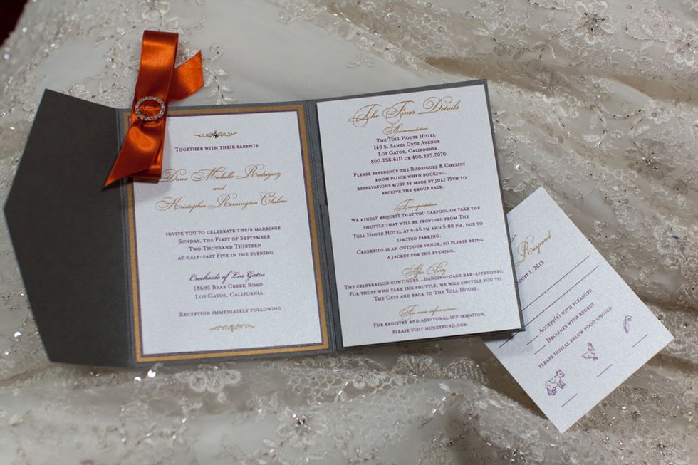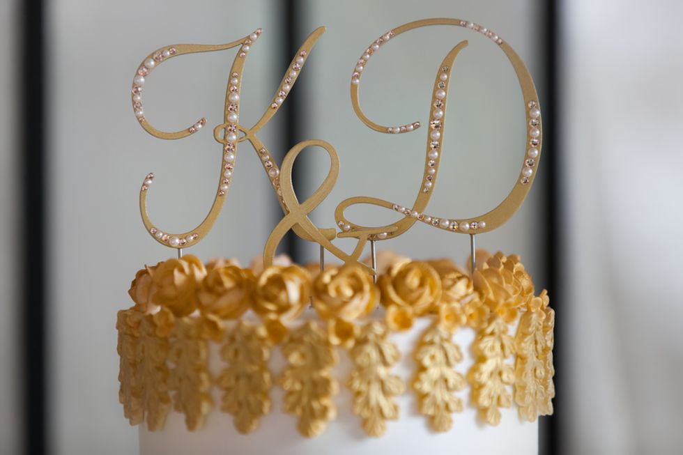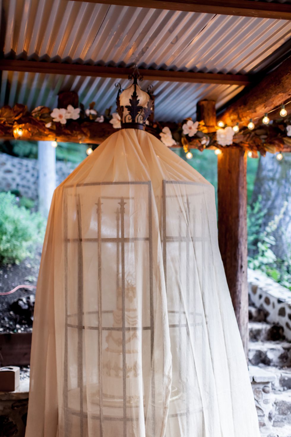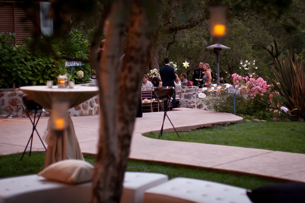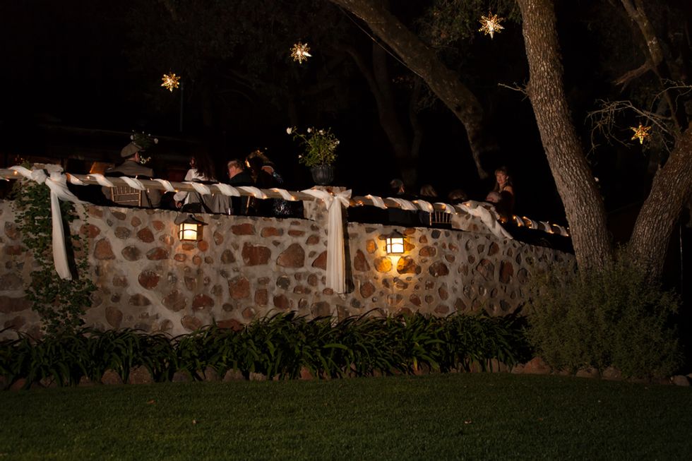 Luckily, Dana's father owns the venue, so the bride had full reign to turn Creekside Terrace in Los Gatos into a mini-Versailles. Spanish stars and chandeliers lit up the Redwoods with a luxurious glow while personalized silverware engraved with promises and golden goblets glittered in the candlelight. Tiara-shaped paperweights kept place markers from flying away. In keeping with the luxe color scheme, the cake was four layers of hand-piped roses, fleurs de lis, and pearls in gold icing that sat underneath a veiled birdcage until it was time.